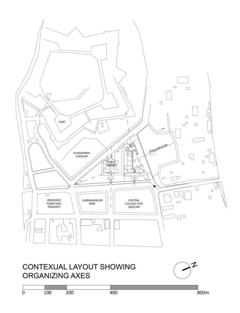 Tontti sijaitsee aivan Jaffnan arvostetuimman julkisen rakennuksen, Jaffnan julkisen kirjaston (JPL) vieressä. Tärkein tehtävä oli kunnioittaa tärkeän naapurin läsnäoloa.
