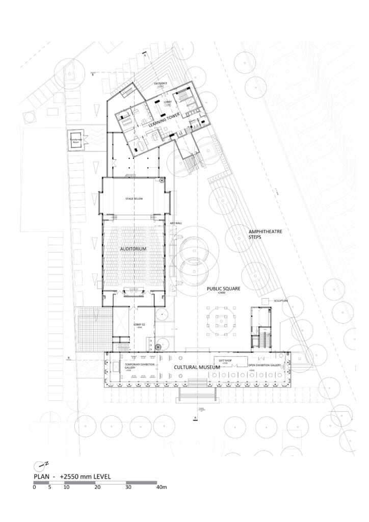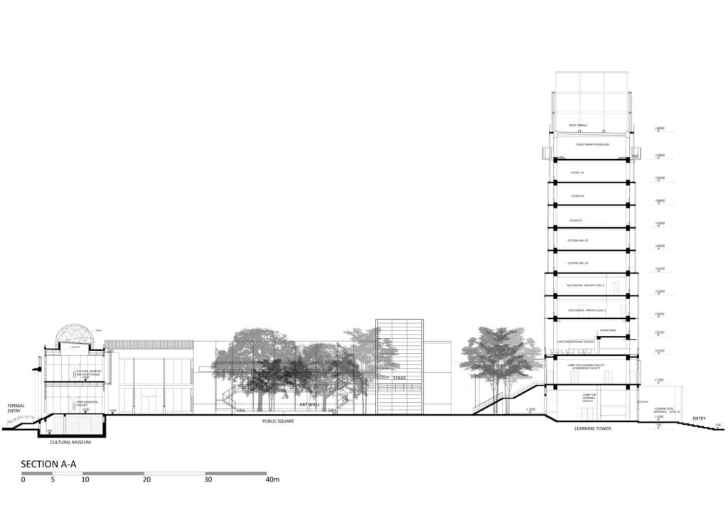 JCC koostuu kulttuurimuseosta, auditoriosta/teatterista, oppimistornista ja julkisesta aukiosta merenrannalla.