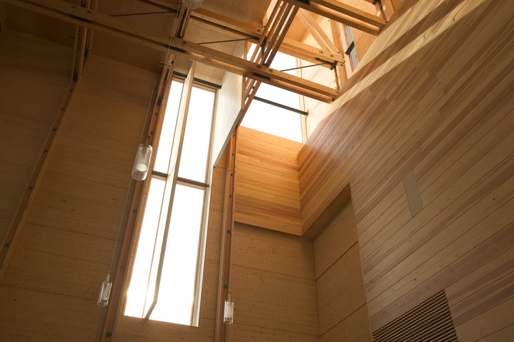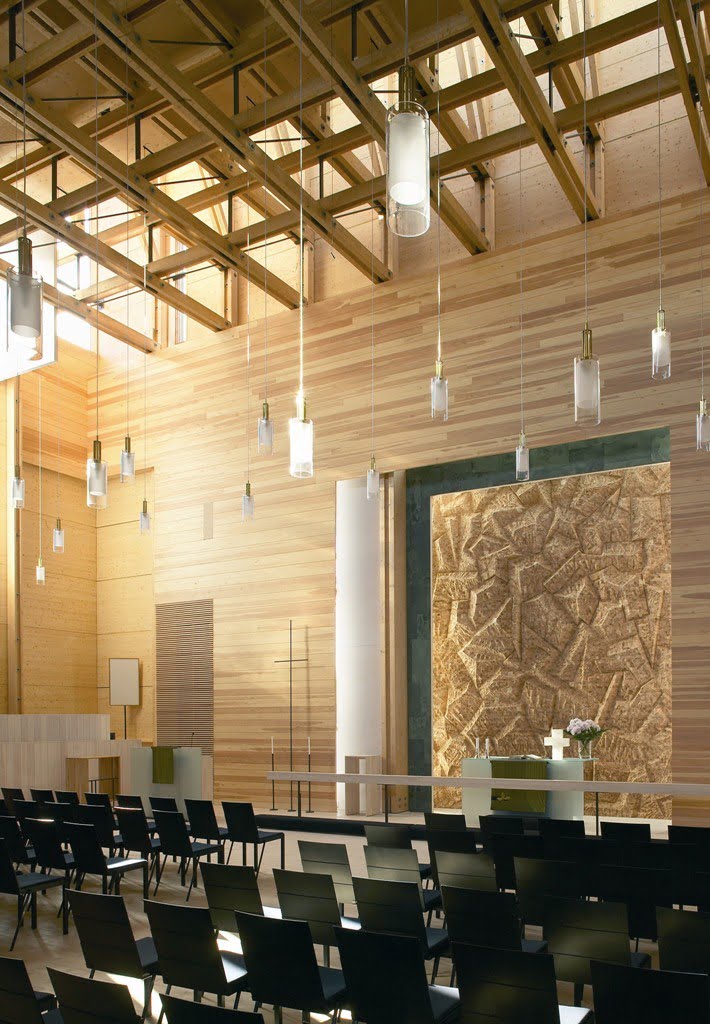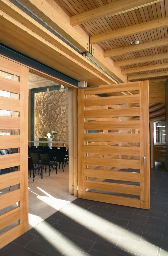 Kantavissa rakenteissa ja verhouksissa on voitu käyttää puuta ilman rajoituksia, koska rakennus on kauttaaltaan sprinklattu. Seinärakenteet ovat liimapuuta pilareina ja jäykistävinä levyinä. Kirkkosalin kattorakenteena ovat liimapuupalkeista teräsliitoksin kootut ristikot ja niitä sivusuunnassa tukevat palkit. Jäykistävät betoniseinät ja puuliitosten teräsosat korostavat kontrastisina materiaaleina puun lämpöä.