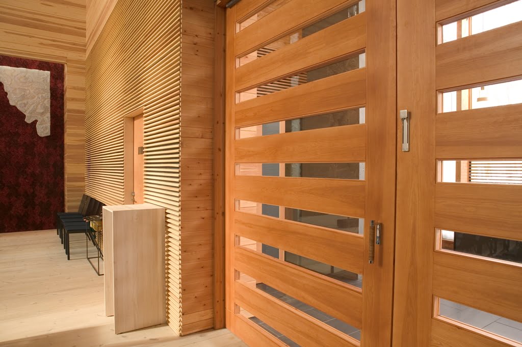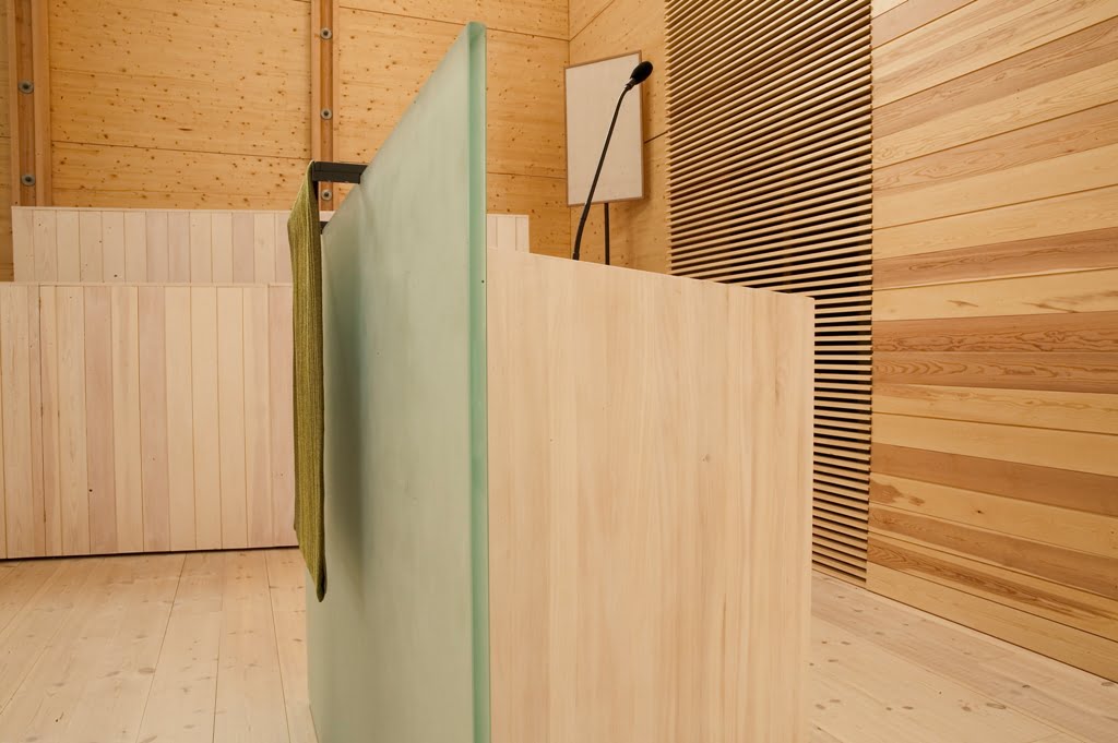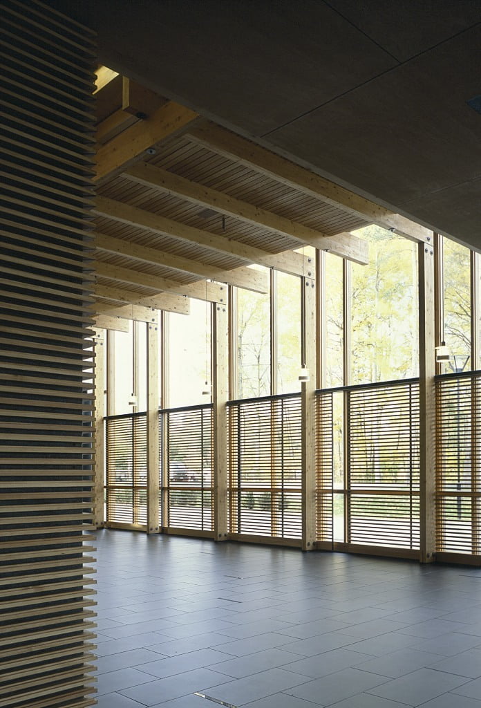 Verhoukset ovat pääosin puuta, salien suuret julkisivupinnat on suojattu vihreäksi patinoiduilla kuparilevyillä. Sisäpinnat ovat mäntyä ja koivuvaneria, laudoituksia ja akustisia puusäleikköjä. Lautaverhouksissa on aistittavissa höylän terän jälki.
