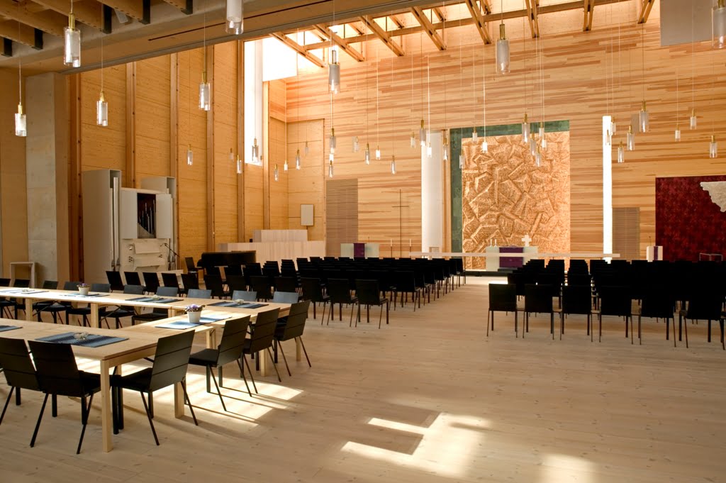 Salit ja aula ovat yhdistettävissä suureksi kirkkotilaksi. Pihasivun valotornit loistavat majakkoina öisin, päivisin ne johdattelevat auringonvaloa sisätiloihin.