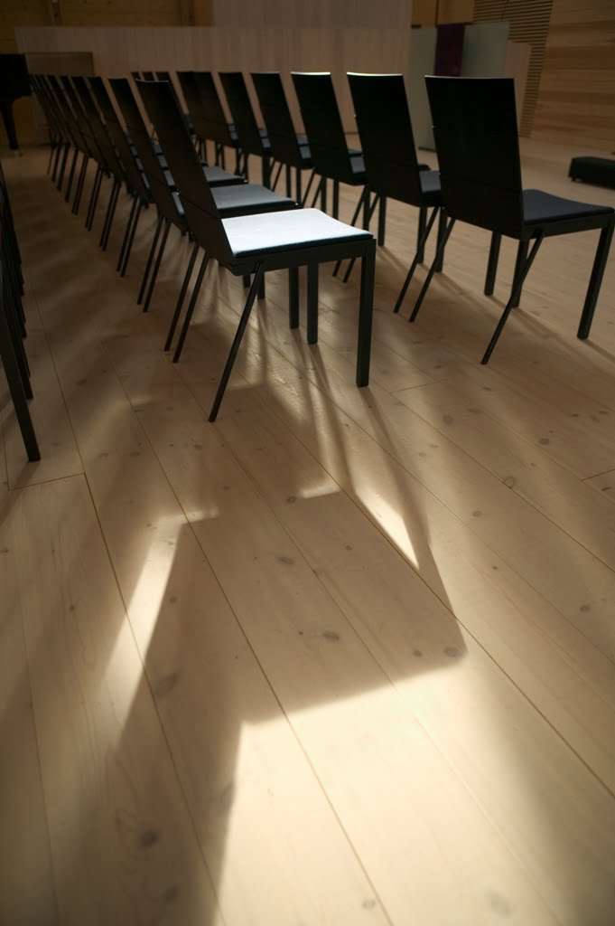 Pinnat on kuultokäsitelty luonnonvärisiksi tai jätetty käsittelemättöminä ajan patinoitaviksi. Salien lattiat ovat öljykäsiteltyä mäntylankkua; mielikuva soitinkotelosta tai puurasiasta. Julkisivujen kuusilankut on öljymaalattu perinteisen punamullan sävyyn.