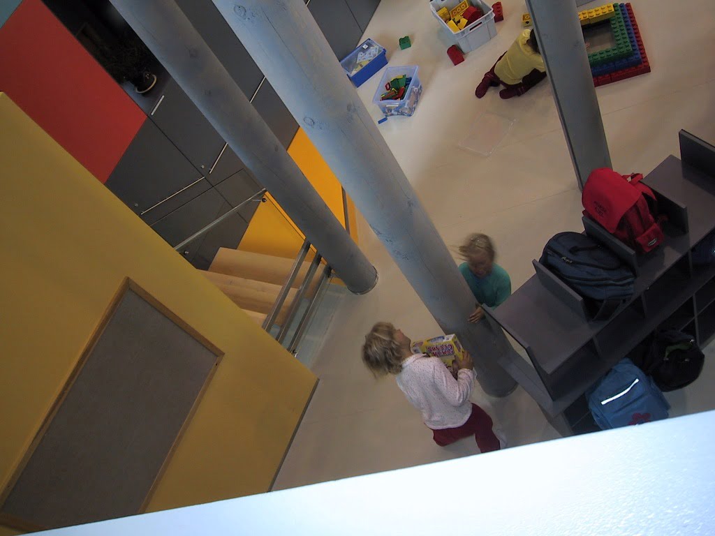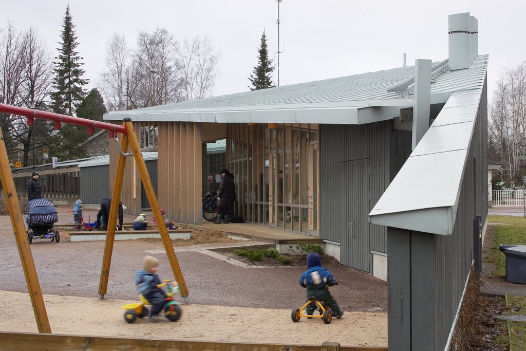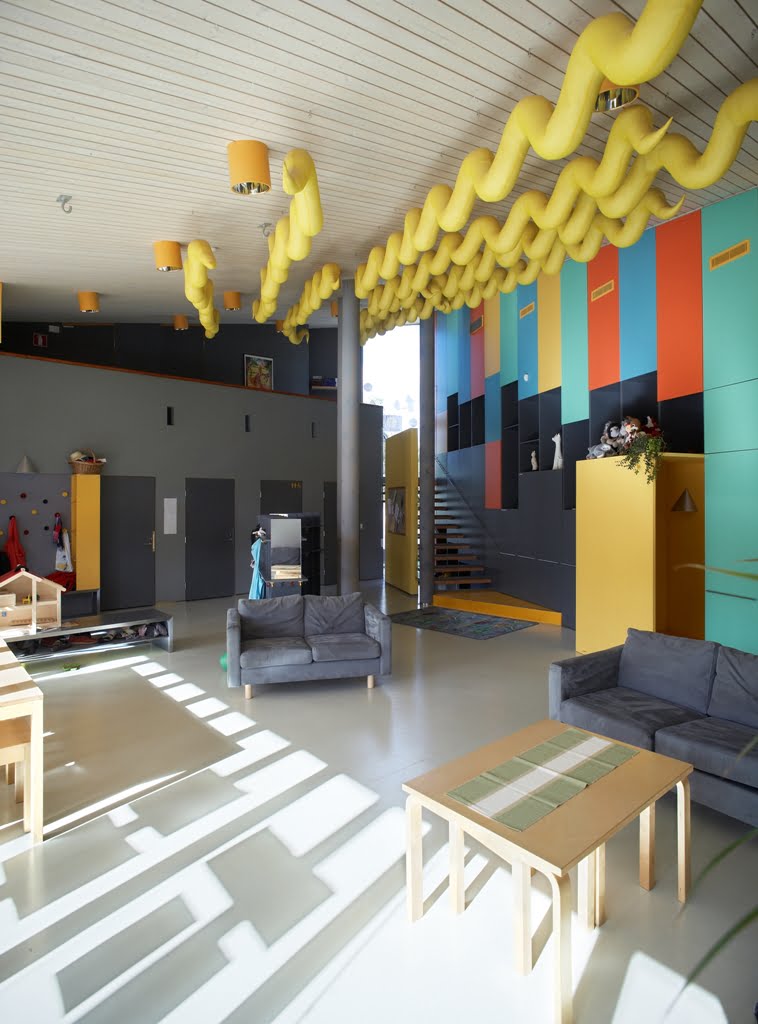 Suurempaan siipeen sijoittuvat toimintatilat ja pienempi on kylmää varastotilaa. Eteis- ja käytävätilat liitettiin toiseen ryhmätilaan, jolloin saatiin iso, yhtenäinen tila, jota korostaa nouseva katto sekä leikkitilalle kiinnostavan ulottuvuuden antava parvi portaineen. Tila aukeaa puistoon ulkoseinän korkuisin ikkunoin ja ilta-auringon suuntaan portaan välitasanteen korkeasta kulmaikkunasta. Koko takaseinä rakennettiin kirjavaksi kaapistoksi, “papukaijaseinäksi”, virittämään iloista ja ehkä jännittävääkin ilmapiiriä.