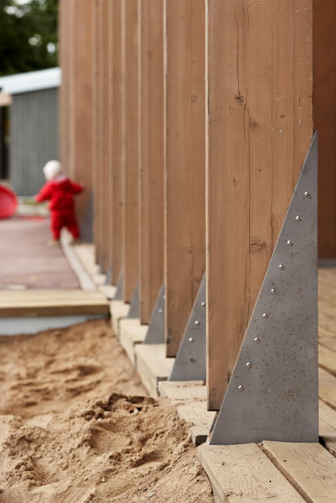 Kolmen puupilarin ryhmä jäsentää tilaa, mutta niillä on myös sekä rakenteellinen että LVIS-tekninen merkitys – asennukset johdettiin kaksoispalkiston välissä konehuoneesta takaseinälle ilman alakattoratkaisua.