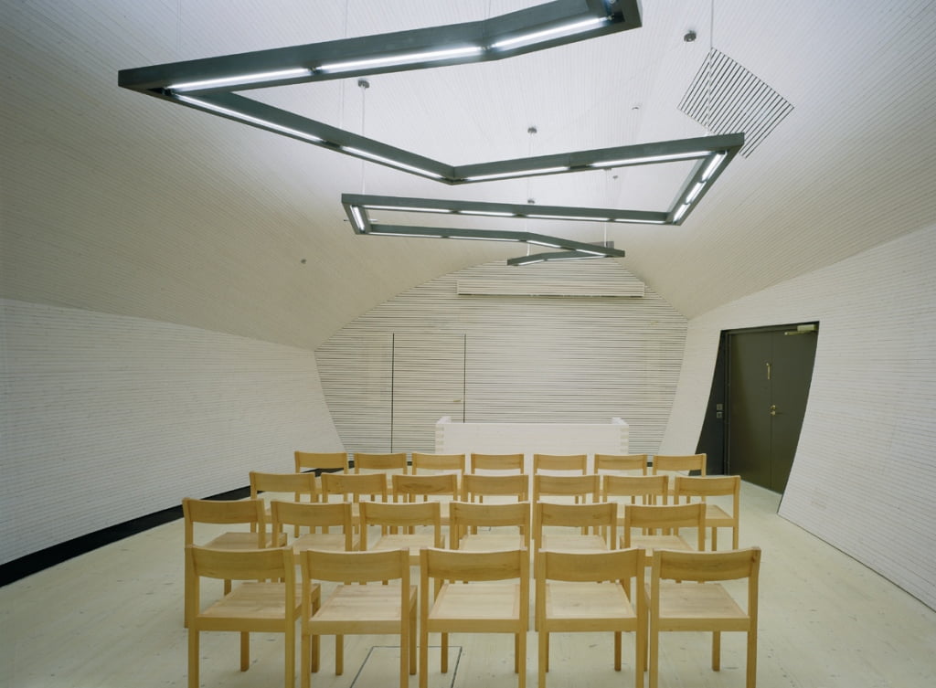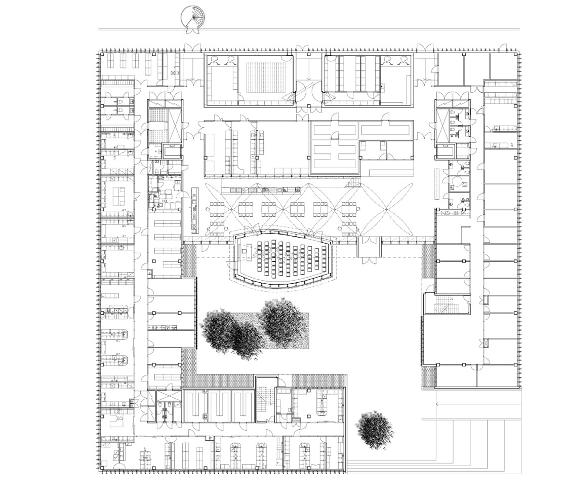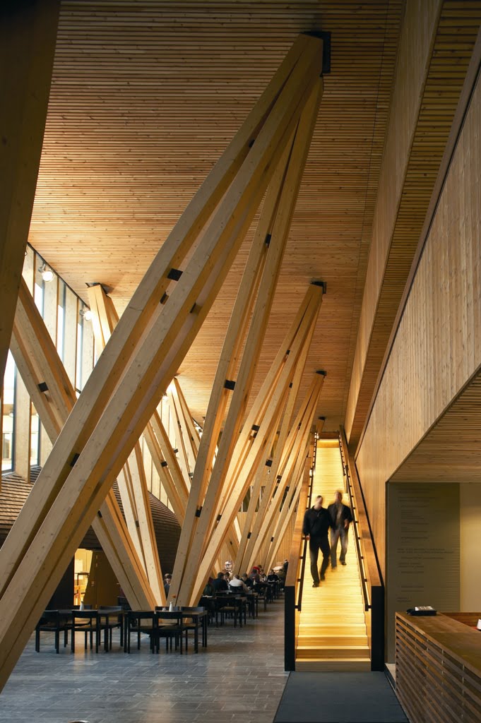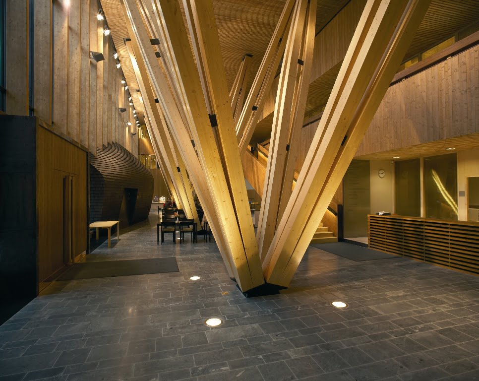 Tutkimuskeskus sisältää pääosin toimisto- sekä laboratoriotiloja, jotka kiertyvät muuta ympäristöä ylemmäs nostetun sisäpihan ja aulan ympärille. Sisäpihaa hallitsevat tervattu, ylösalaisin käännettyä venettä muistuttava neuvottelutila, sekä aulan perinteisistä tukinuittopuomeista innoituksensa saaneet vinopilarit.