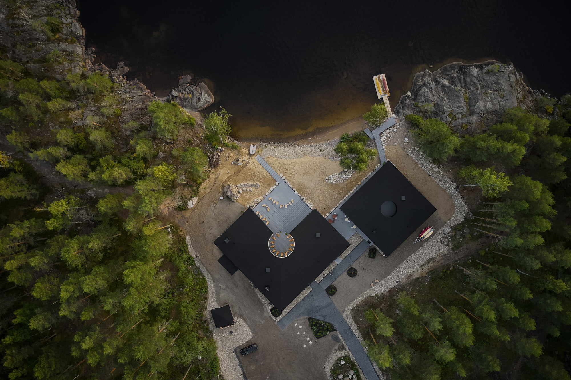 Rakennukset sijoittuvat tontille lähelle rantaa olemassa olevan puuston lomaan ja istuvat herkkään Saimaan maisemaan tummalla ulkoasullaan, jonka kontrastina sisätilojen vaalean lämmin puumateriaali houkuttelee astumaan sisään. Kantavana materiaalina on puu, puuta on myös julkisivuissa eri muodoissaan ja puurimoitus täydentävinä osina.