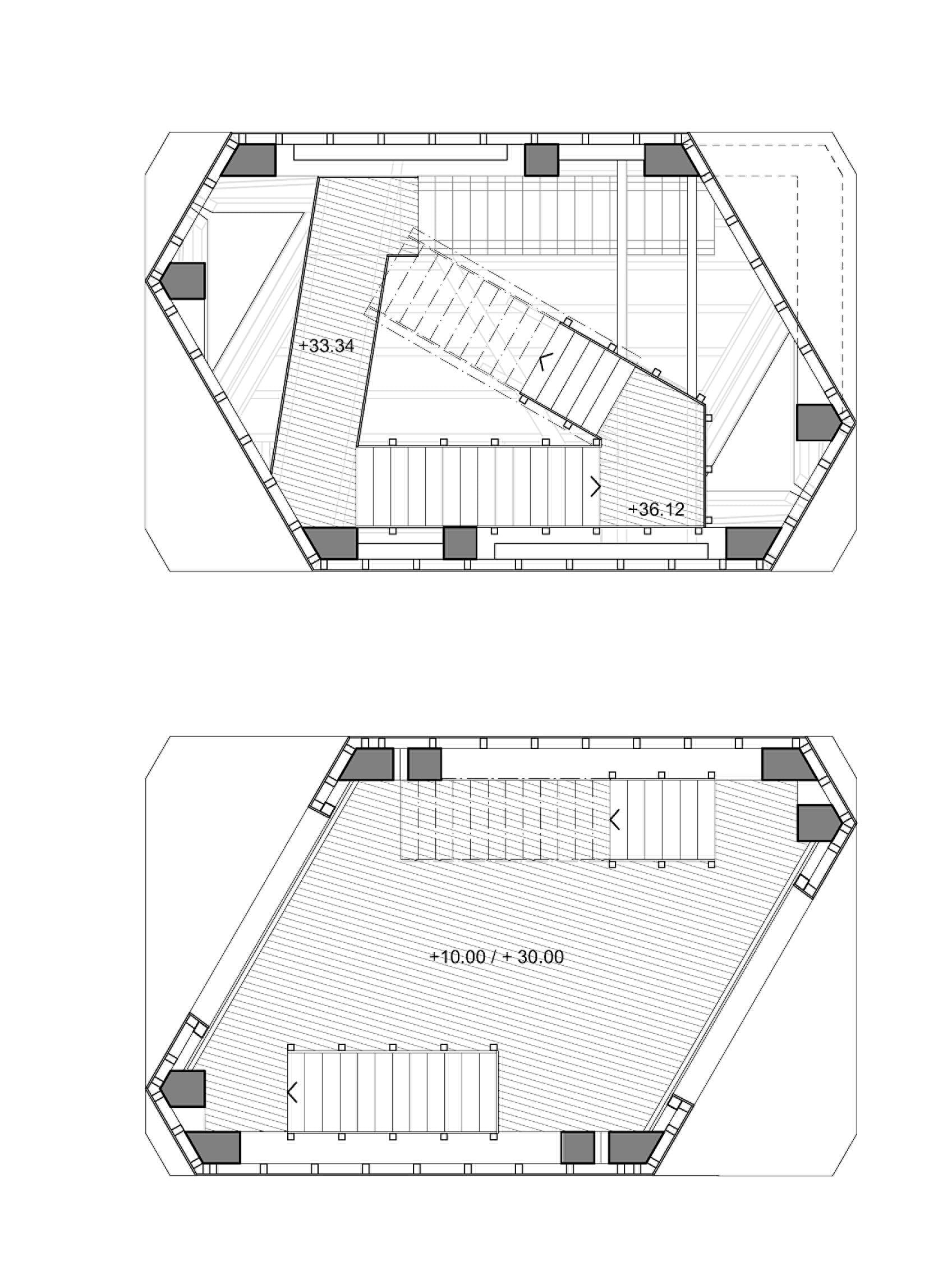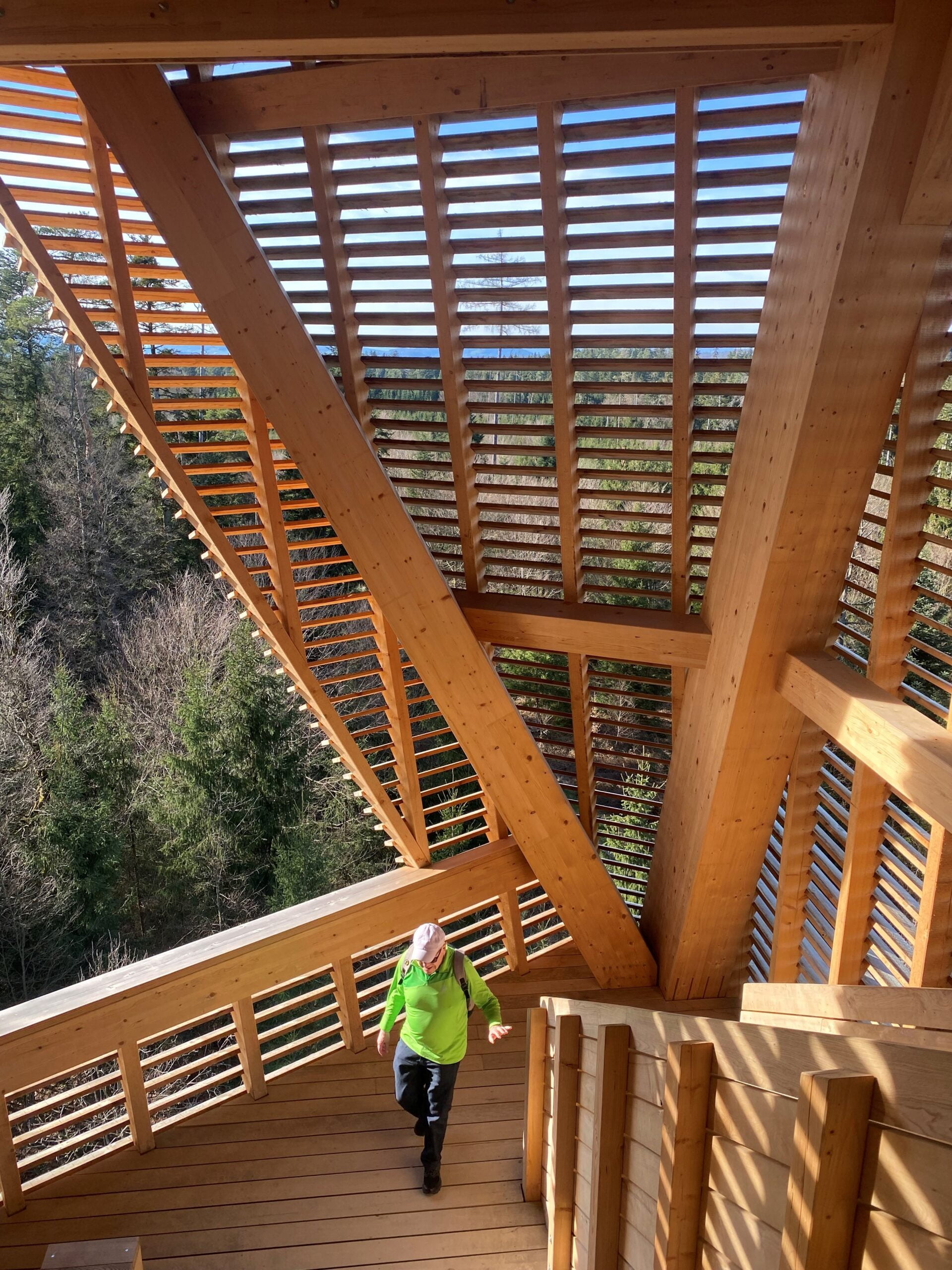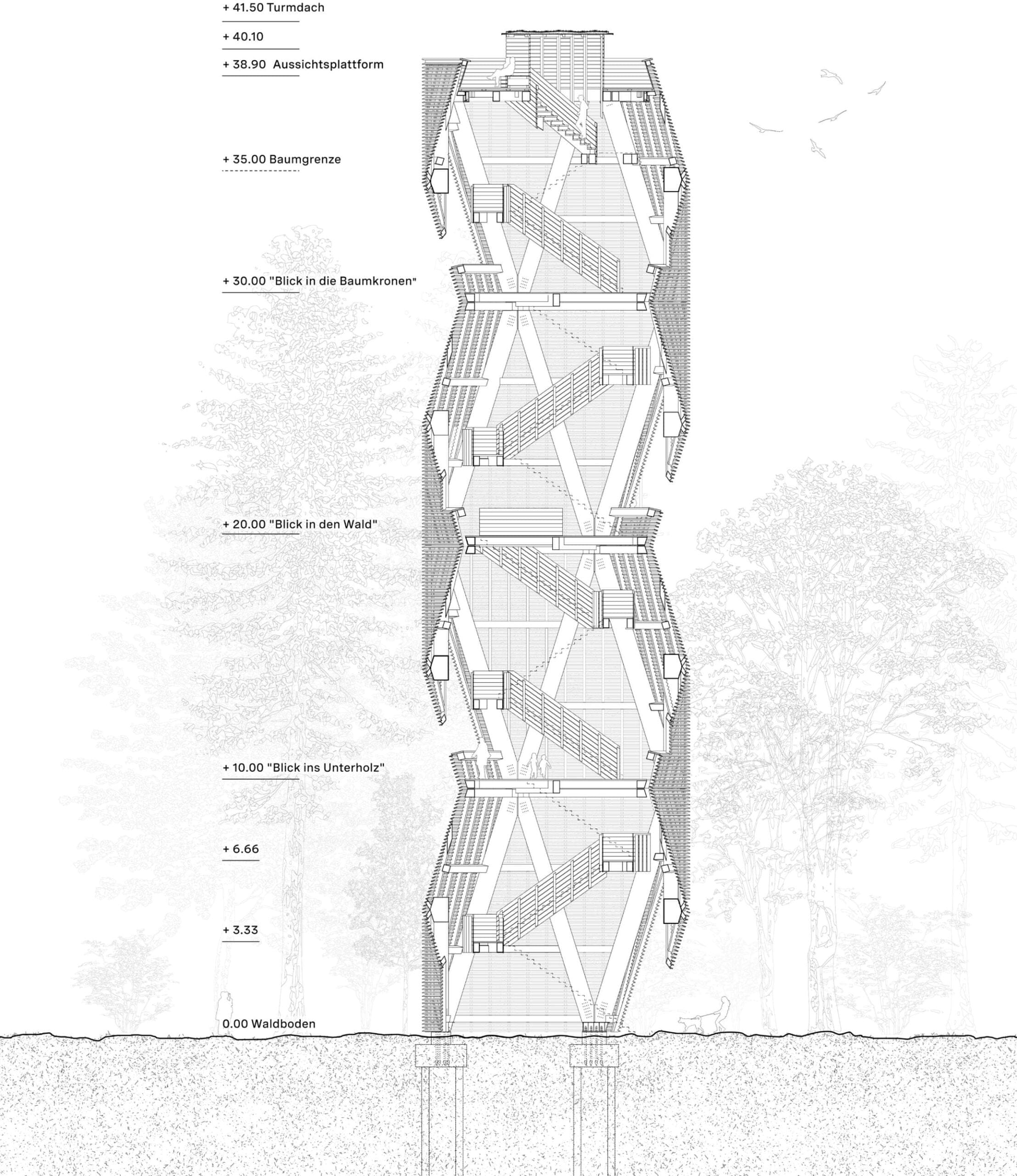 Ympäröivää maisemaa voi tarkastella kolmionmuotoisten aukkojen läpi. Ensimmäiseltä 10 metrin korkeudella olevalta tasolta on näkymä metsän aluskasvillisuuteen. Seuraavalta 20 metrin tasolta vierailijat voivat katsoa yksittäisiä puita ja metsää. Kolmannelta, 30 metrin tasolta katsojat löytävät itsensä puiden latvojen korkeudelta.