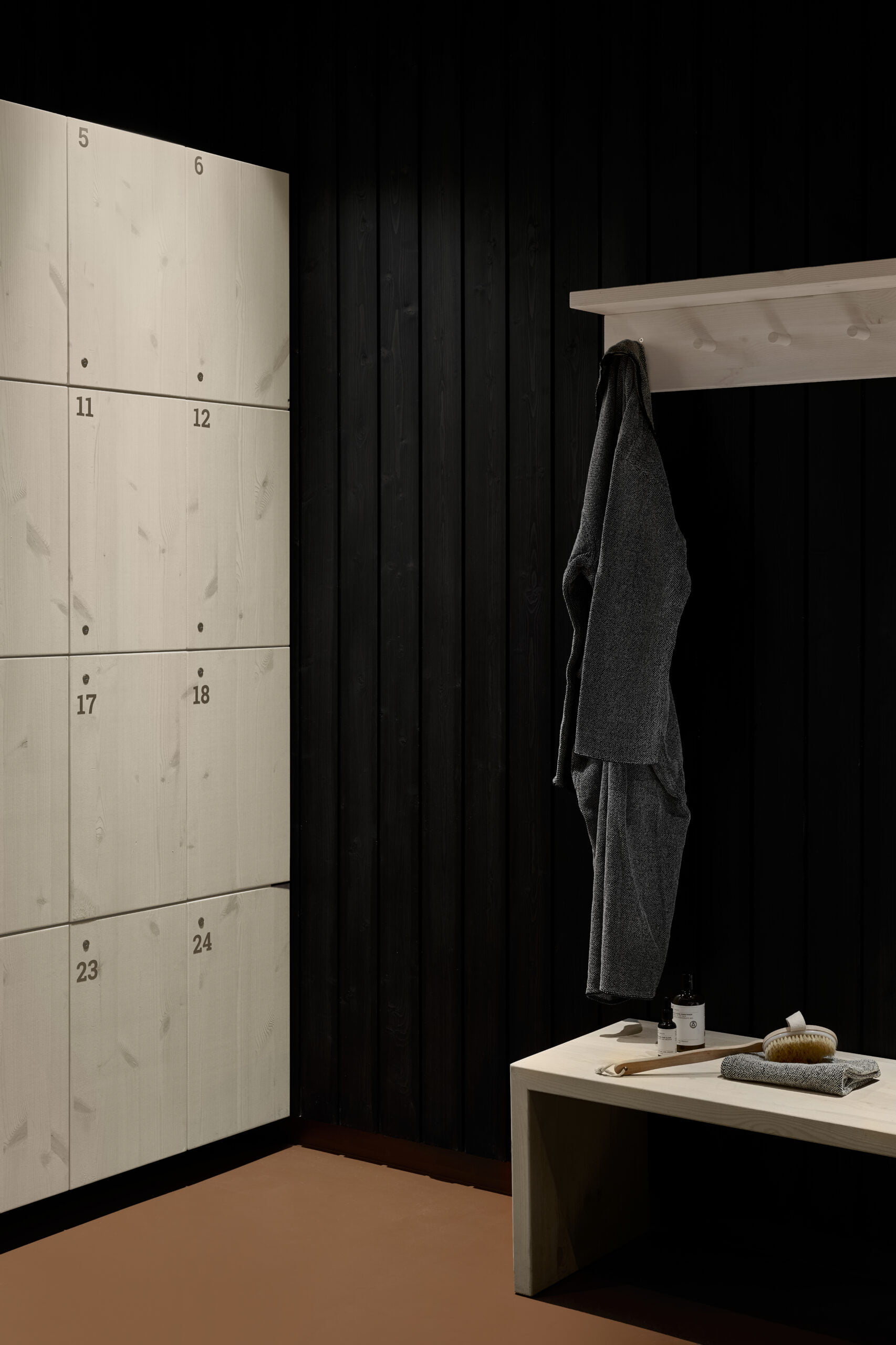 Sisustuksessa on pyritty mummolan rantasaunan kaltaiseen pehmeään kodikkuuteen. Perinteisten materiaalien käyttö nykyaikaisella ja kekseliäällä tavalla kunnioittaa perhesaunojen perintöä uudistaen ne samalla koko yhteisölle sopivaan muotoon.