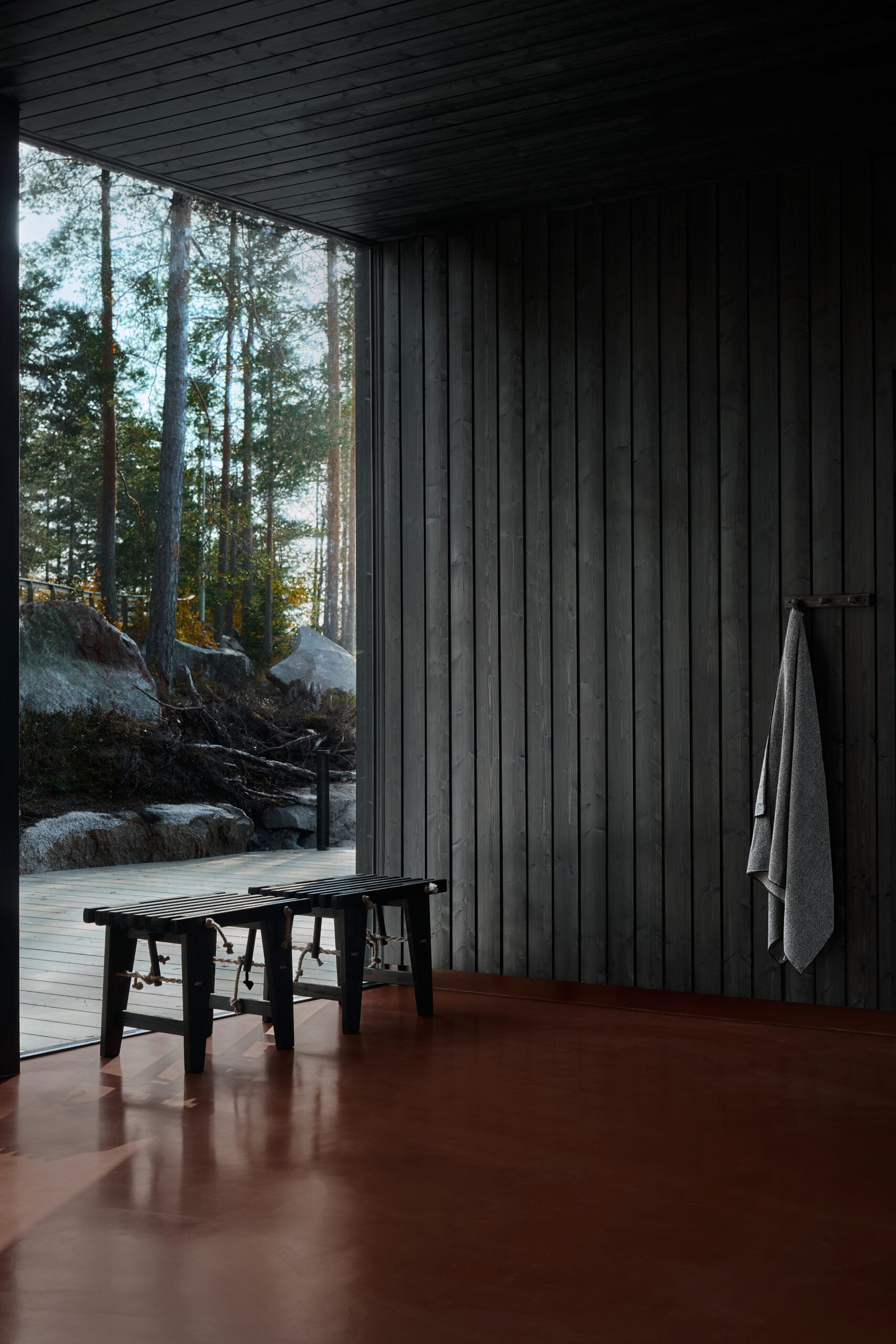 Vaikka kumpikin saunatila on tunnelmaltaan tummanpuhuva, niillä on ainutlaatuiset tilaelämykset. Päärakennuksen yhteydessä oleva suurempi sauna soveltuu erityisesti ryhmille, ja sen korkeille lauteille avautuu näkymiä kapeasta vaakasuuntaisesta panoraamaikkunasta. Pienempi, elämyksellinen sauna on erillisrakennuksessa veden äärellä. Lähes kattoon asti ulottuva ikkuna yhdistää tilan visuaalisesti suoraan alapuolella olevaan veteen. Ulkotilojen kanssa samassa tasossa oleva lattia luo vaikutelman saumattomasta jatkuvuudesta ja ohjaa katseen kohti ikkunasta näkyviä maisemia.
