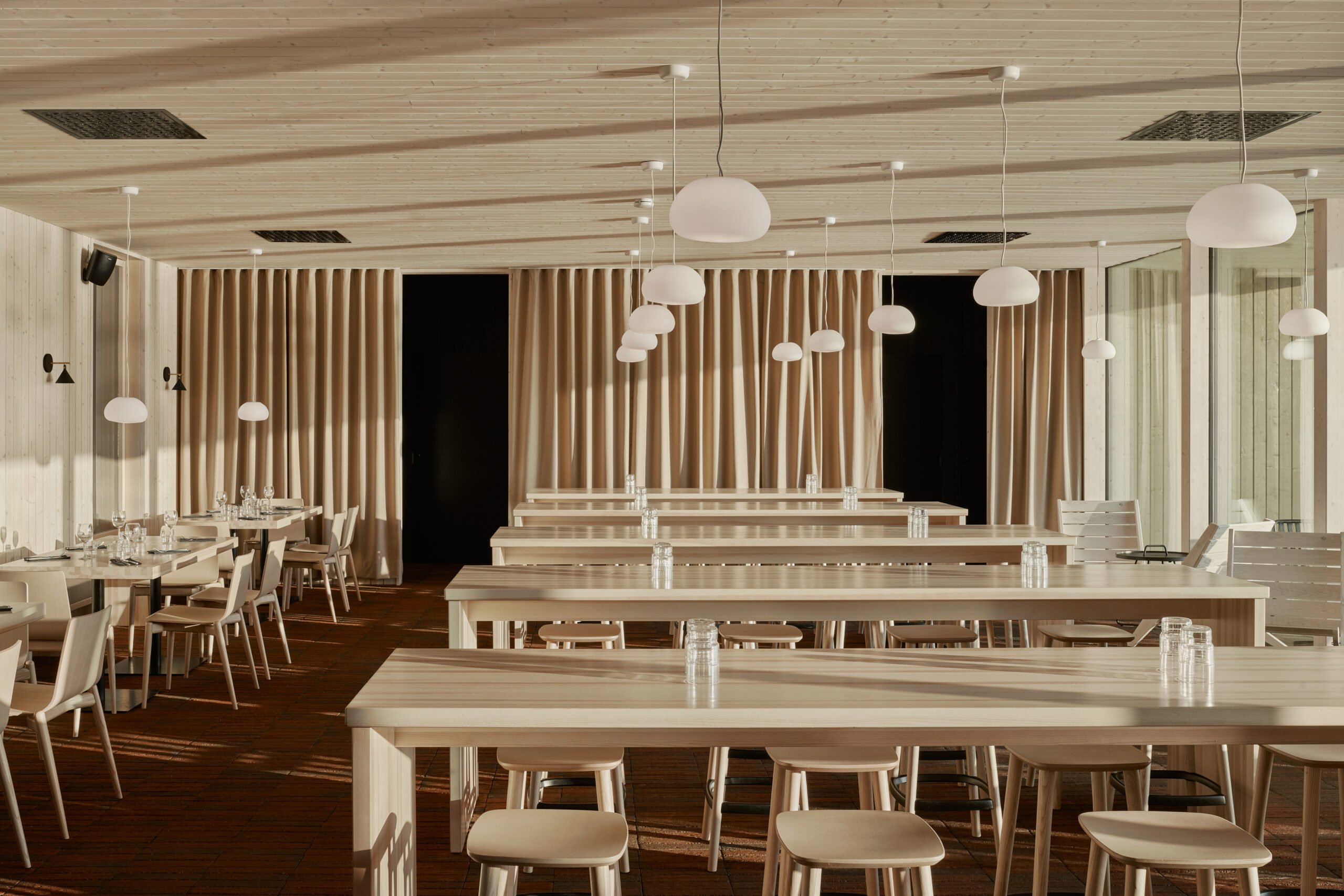 Sisätiloissa tummat ja vaaleat tunnelmat ovat herkässä vuorovaikutuksessa, vaihdellen strategisesti arkkitehtuurin eri hetkissä. Sisäänkäynti on ilmava, ja ravintola tervehtii tulijaa lämpimillä puusävyillä ja suurista ikkunoista tulvivalla valolla. Hämyisän tunnelmalliset saunatilat luovat kontrastia ja tasapainoa. Vahvat tilasiirtymät tuottavat virkistävän ja aisteja hivelevän kokemuksen, joka yllättää positiivisesti ja keskittää vierailijan nykyhetkeen. Julkisessa saunassa, jossa toisten kanssa ollaan hyvin läheisessä vuorovaikutuksessa, on erityisen tärkeää luoda rauhallinen ilmapiiri, joka auttaa rentoutumaan ja saa ihmiset tuntemaan olonsa kotoisaksi myös vieraiden ihmisten seurassa.