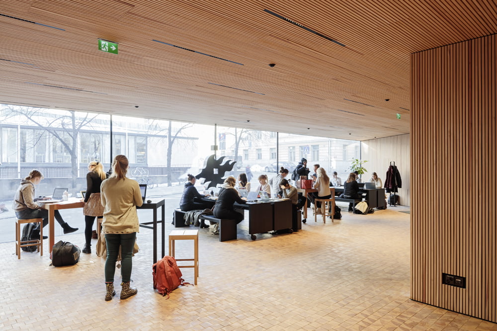 Puuta on käytetty myös ulkona sisäänkäyntisyvennyksissä ja pääoville johtavassa leveässä portaassa. Tästä toivotaan syntyvän lämminhenkinen kohtaamis- ja oleskelupaikka yliopistokampuksen keskellä. Rosoiset, lautamuotilla puhtaaksivaletut betonipinnat ovat tasapainoinen pari puun kanssa täydentäen rakennuksen juurevan materiaalipaletin. Pääosin puiset kalusteet on suunniteltu toiminnallisiksi, helposti liikuteltaviksi ja yhteensopiviksi toistensa kanssa, ne ovat siirreltäviä ja mahdollistavat erilaisten tilaisuuksien järjestämisen.