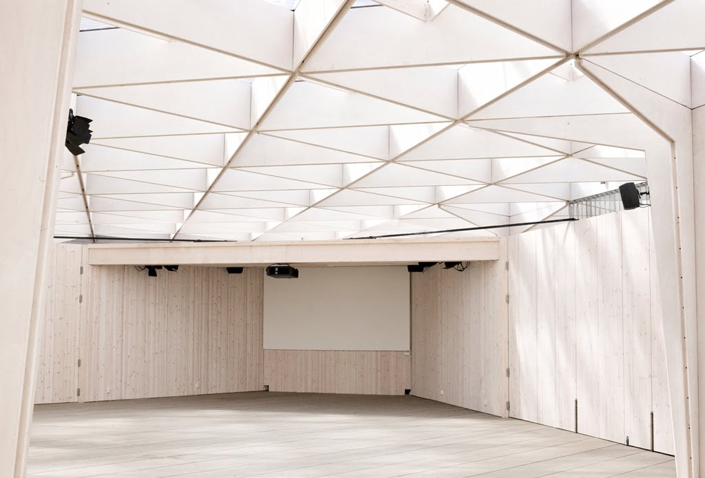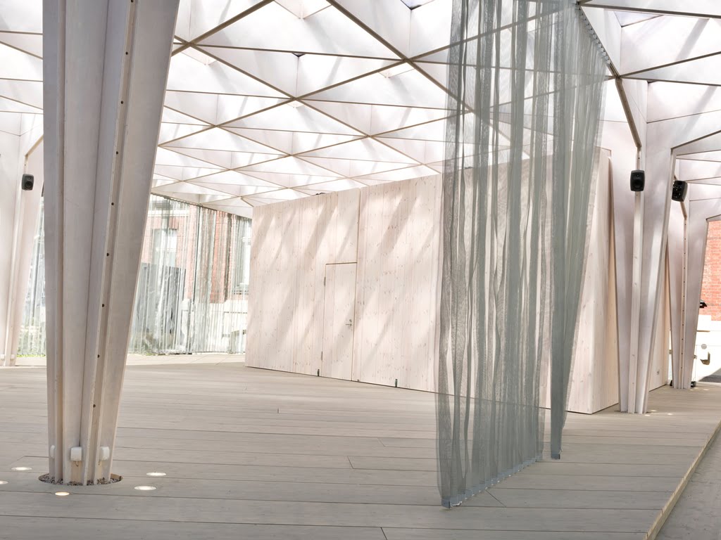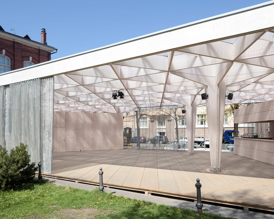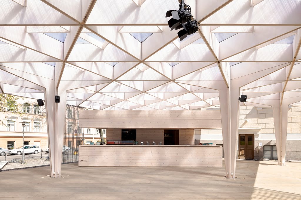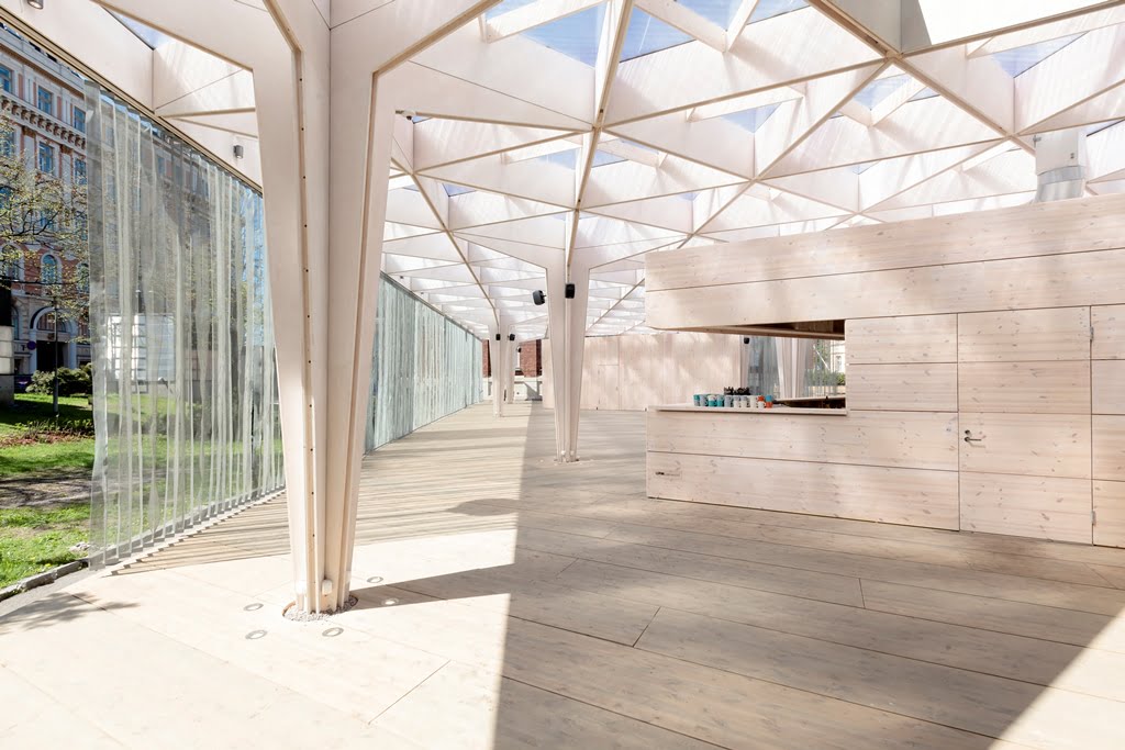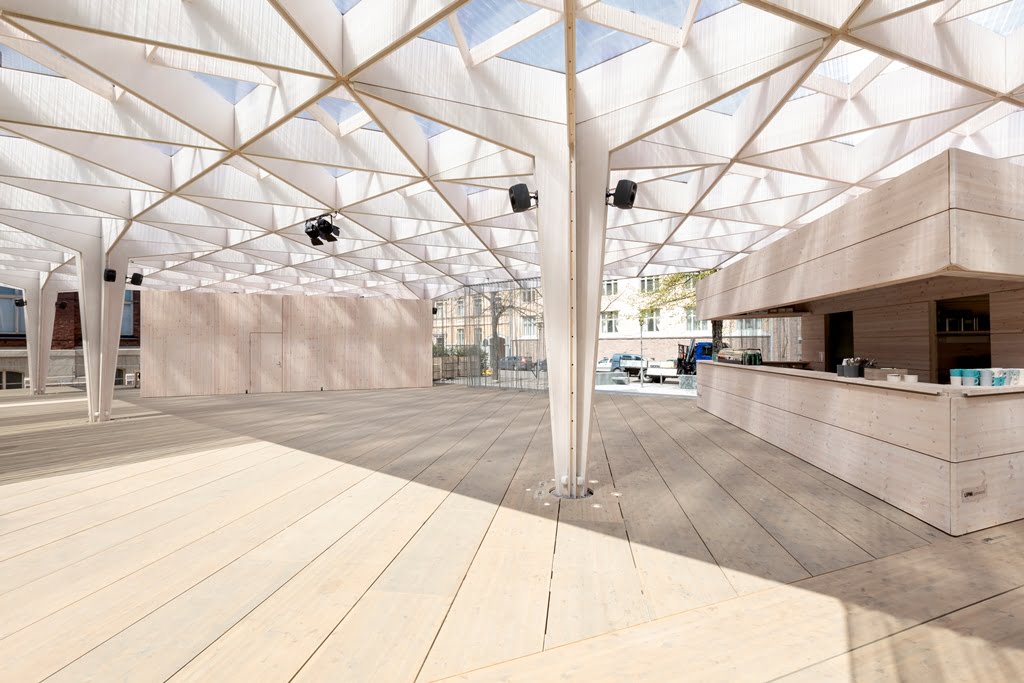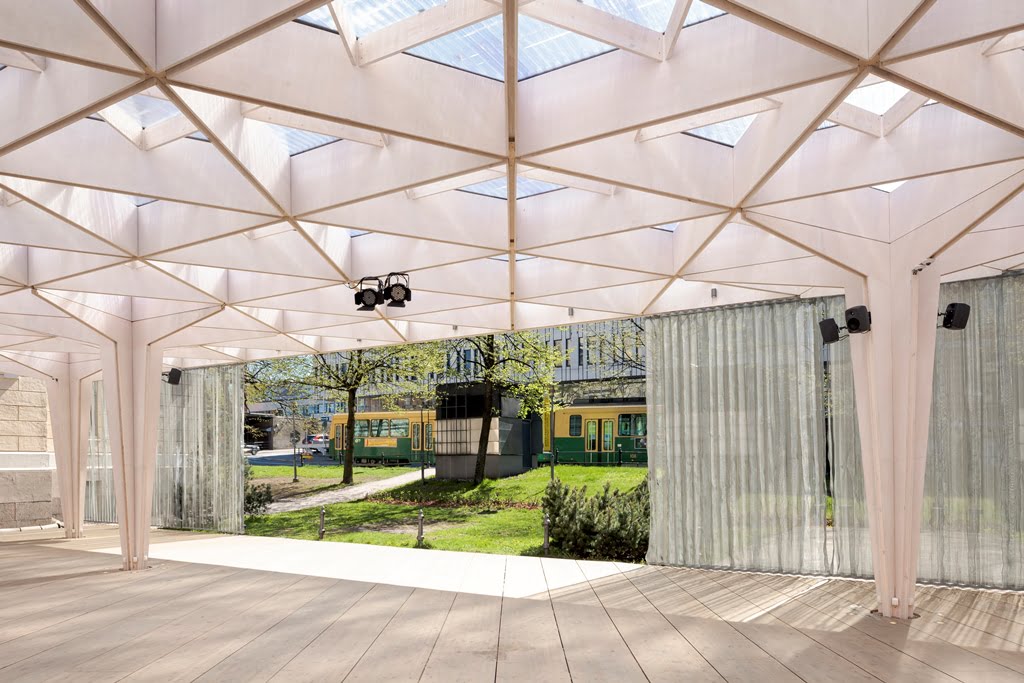 Rakennuksen kolmiomainen arinakatos luo paviljonkiin leikkisän valon, joka pyyhkii terassin yli päivän kuluessa. Paviljonki kerää kävijöitä nauttimaan virvokkeista sekä taiteista, tilanteista ja ihmisistä, tutustumaan ja törmäämään uuteen.