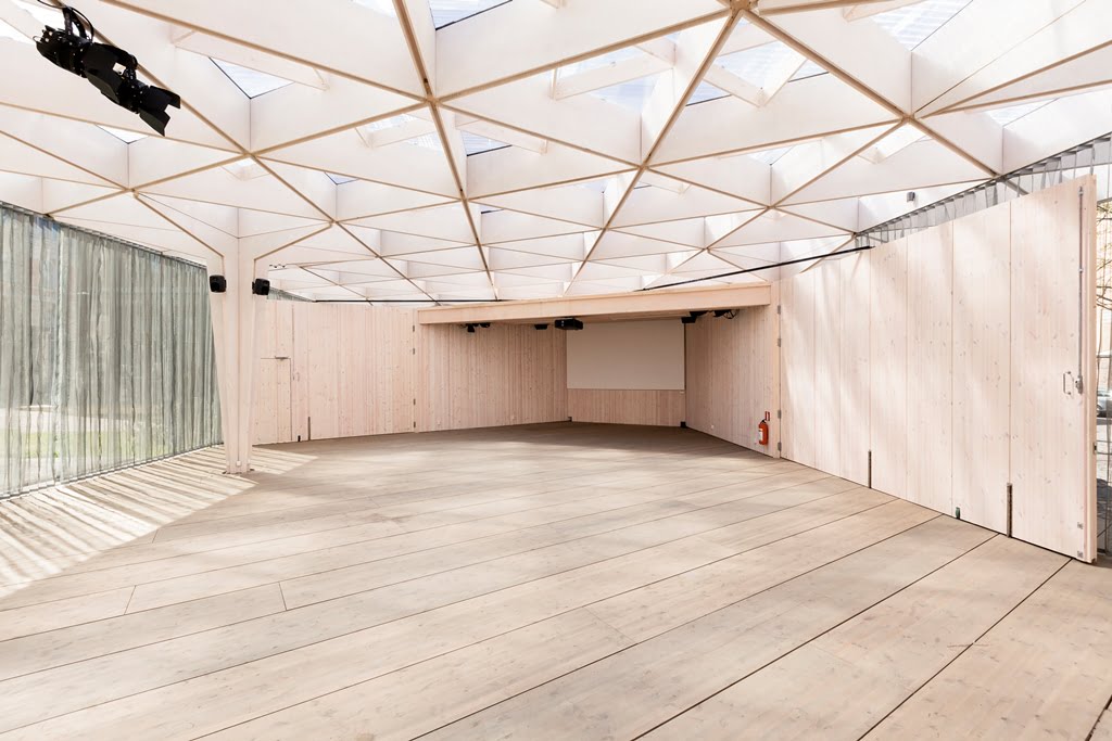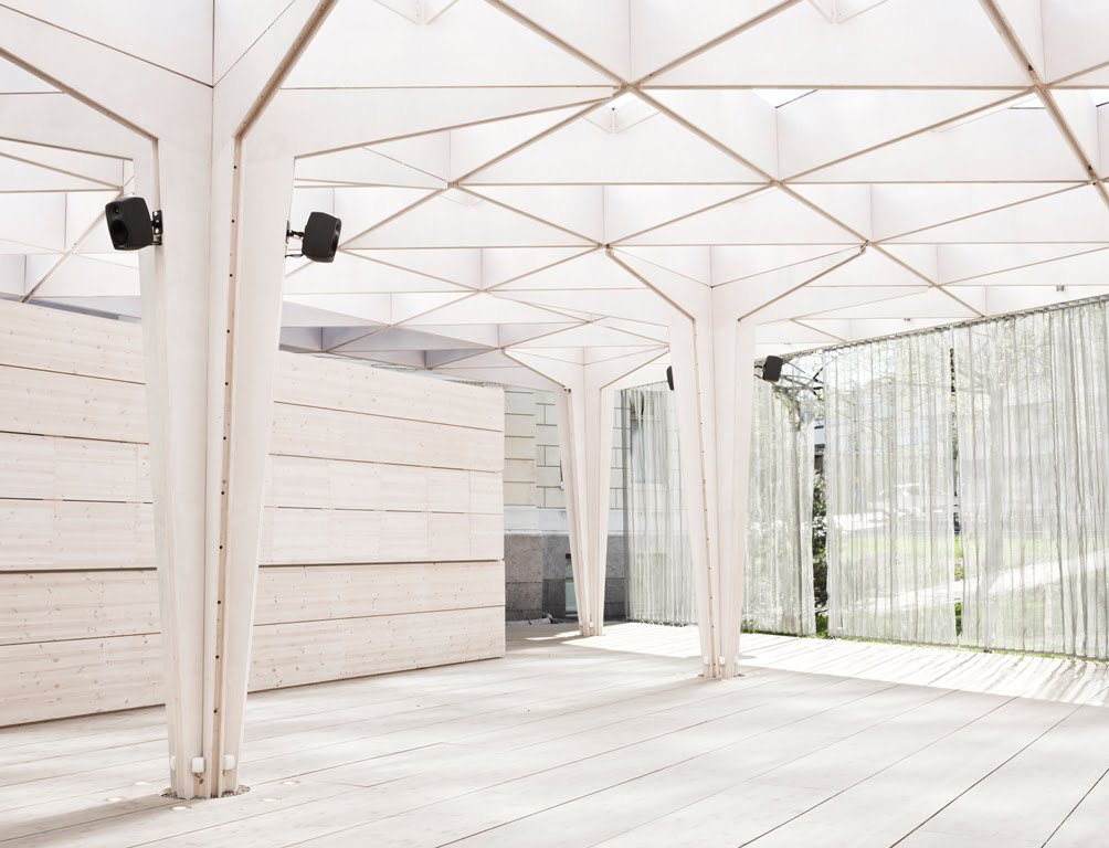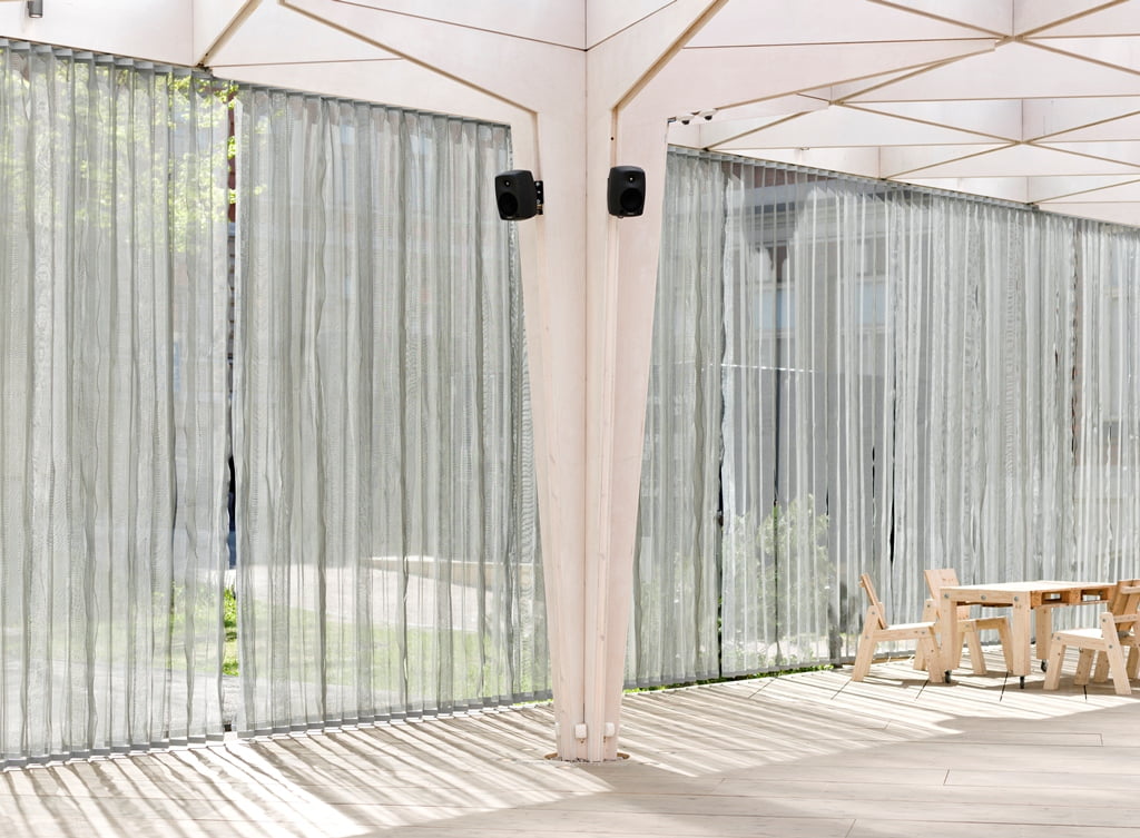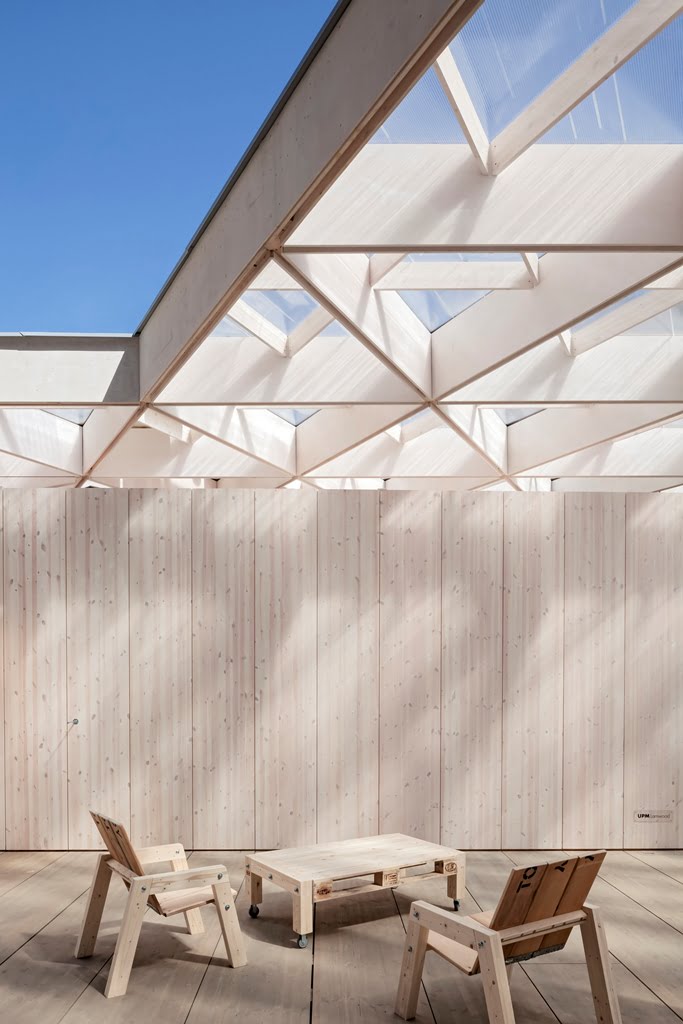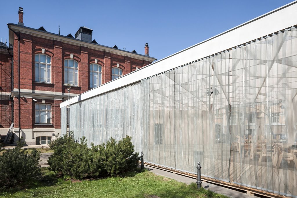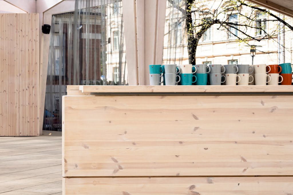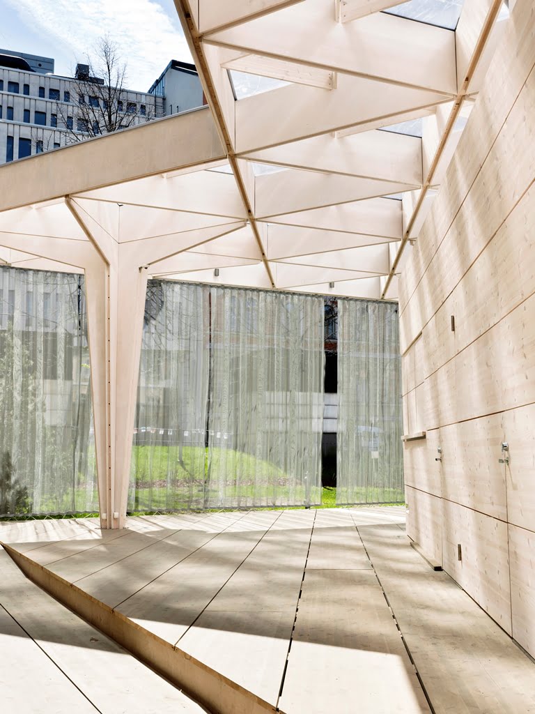 Rakennuksen kolmiomainen arinakatos luo paviljonkiin leikkisän valon, joka pyyhkii terassin yli päivän kuluessa. Paviljonki kerää kävijöitä nauttimaan virvokkeista sekä taiteista, tilanteista ja ihmisistä, tutustumaan ja törmäämään uuteen.