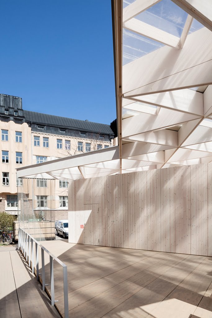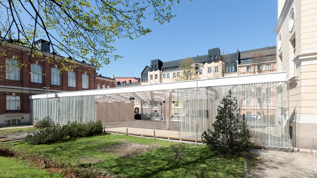 Paviljonki on avoin ja helposti lähestyttävä rakennus, joka luo eläväisen kohtaamispaikan muuten unohtuneelle tontille.
