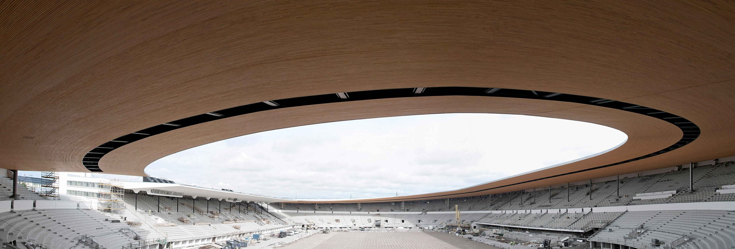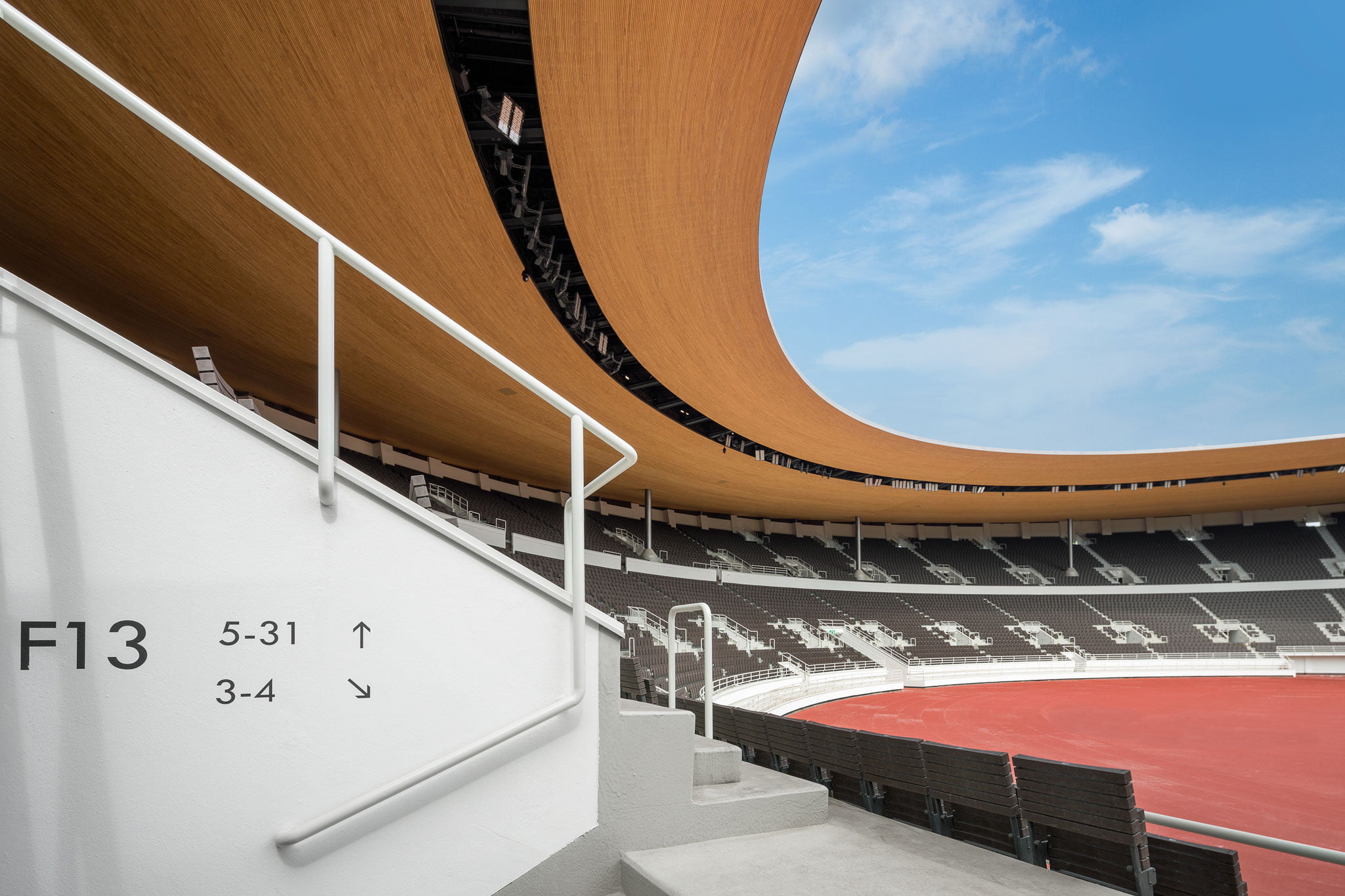 Katsomomalja on uudistettu ehyt kokonaisuus. Alkuperäiset rakenteet detaljeineen on palautettu 30-luvun asuun. Penkit on korvattu uusilla yksittäisillä puukomposiitti-istuimilla, jotka muodostavat yhtenäisen horisontaalisen viivaston stadionin katsomotilaan alkuperäisten penkkien tapaan. Kaarteet ja takasuoran katsomot on katettu uudella katoksella. Sen plastinen muoto muuttuu ajan ja liikkeen myötä stadionin maisemassa virtaavasta muodosta ohueksi viivaksi valon vaihteluiden mukana.