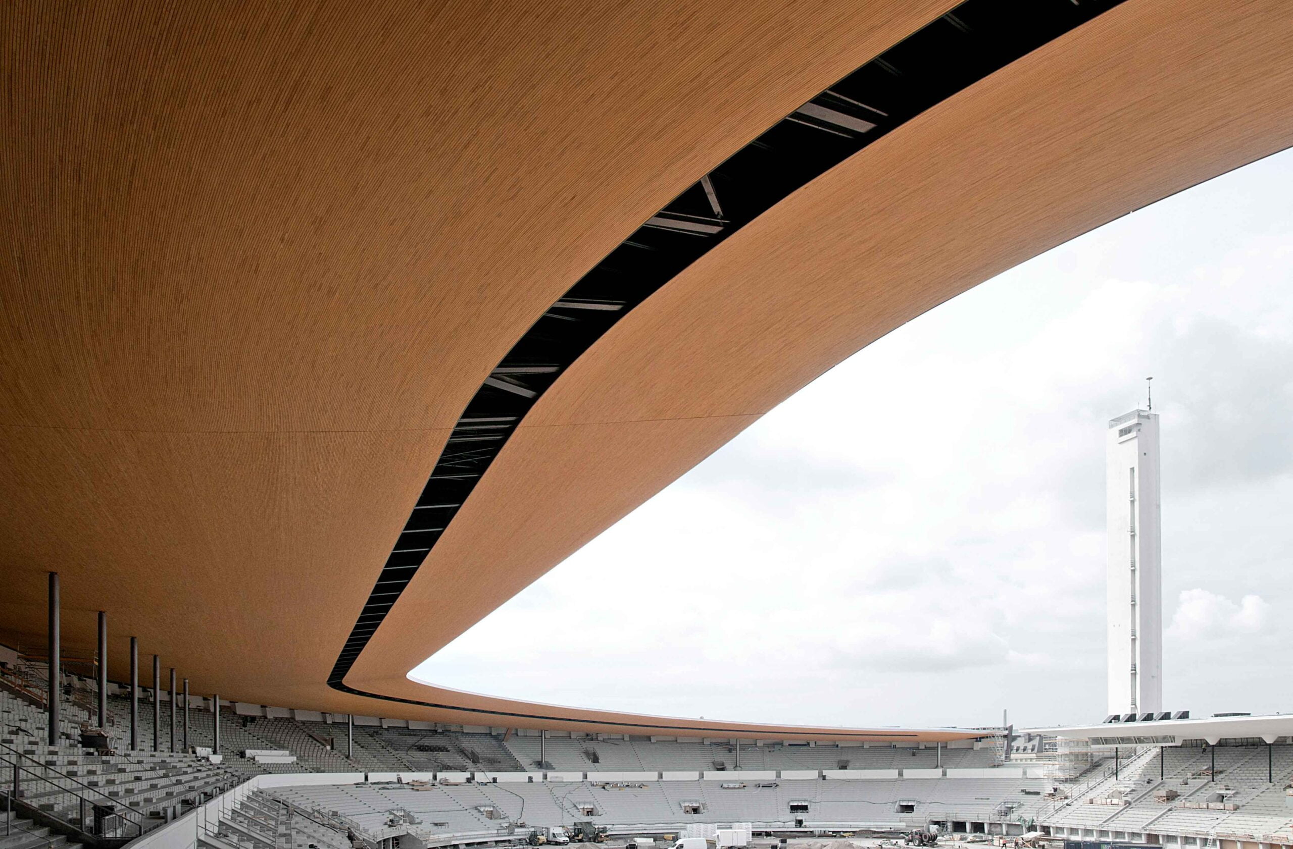 Materiaaleiltaan katos ja istuimet liittyvät suoraan stadionin historiaan. Puu on ollut materiaali jolla betonista stadionia on laajennettu, tilapäisesti ja pysyvämmin nykyasuunsa 50-luvulla. Puu tuo katsomotilaan kosketettavan materiaalin ja pienimittakaavaisen tekstuurin. Yleisöturvallisuuteen liittyen katoksen verhous toteutettiin kivipuusta, materiaalista, jossa puun soluseinämät on kyllästetty silikaattiseoksella. Tällä kotimaisella innovaatiolla voitiin katoksen alapinta toteuttaa sprinklaamattomana, Istuimien puukomposiitin koostumus huolehtii myös palasuojauksesta.