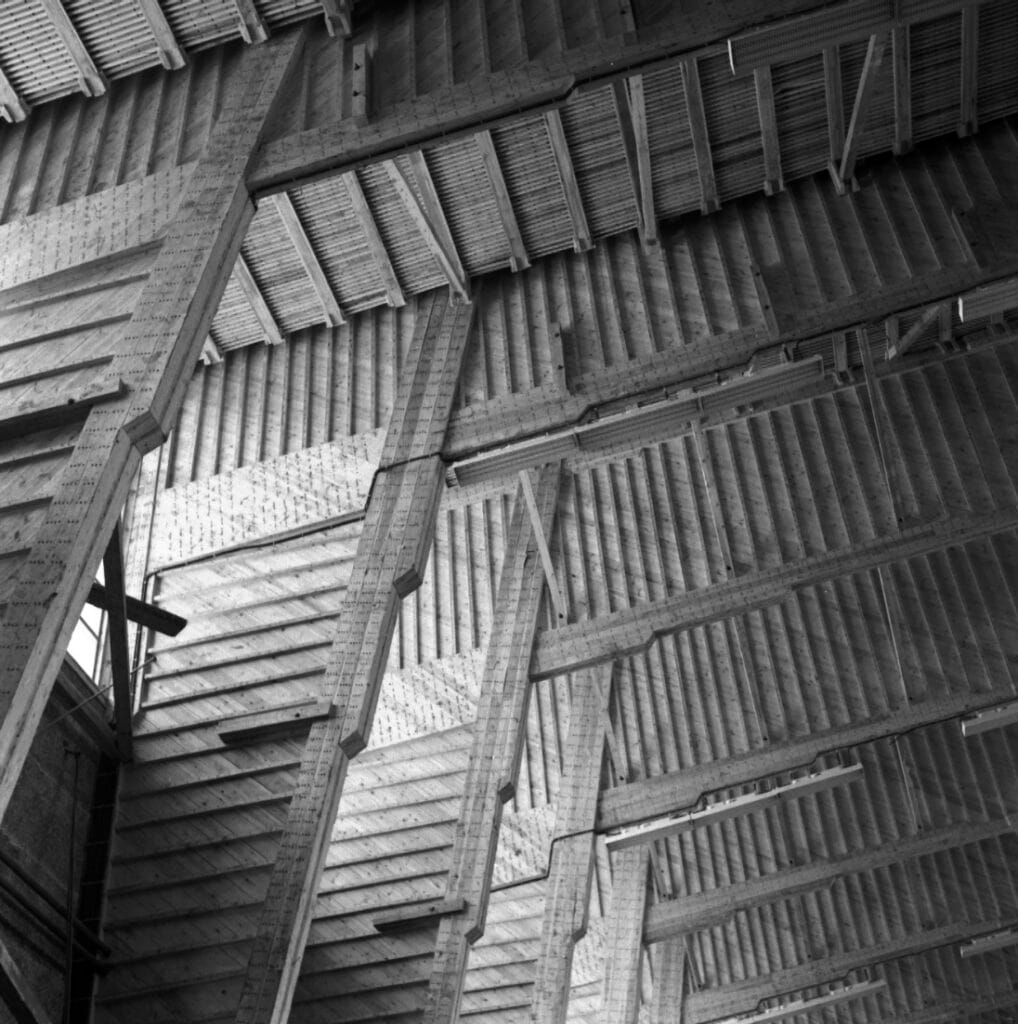Kehän sisänurkan nurjahdustuentaa vahvistettiin koko rungon pituudelle asennetuilla liimapuusauvoilla ja jäykistysristikoilla.