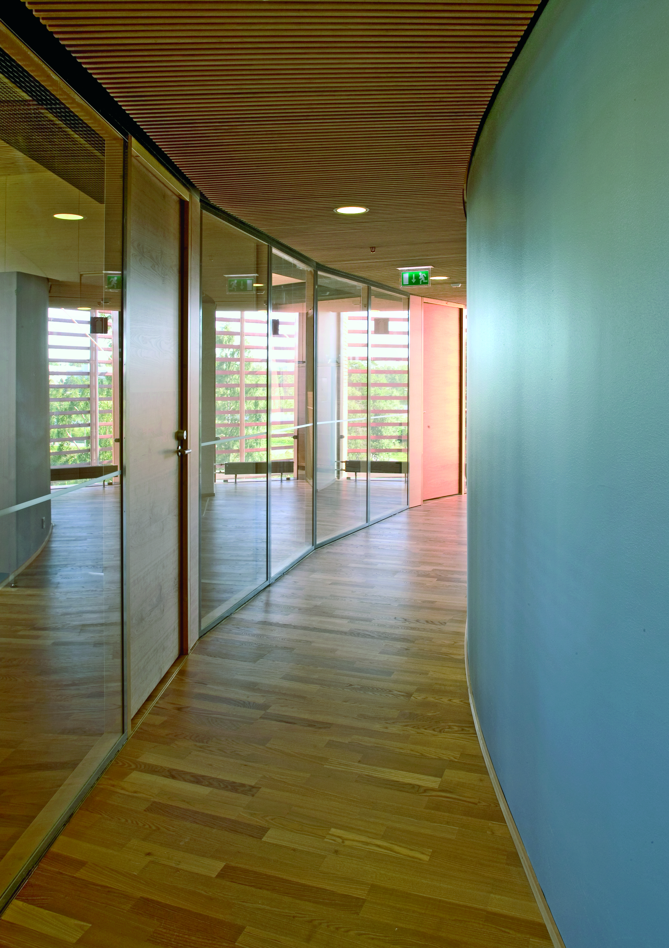 Inside the modules, the high vestibules and atria alternate with each other. The workspaces allow the nature surrounding the building to be seen. The work environments are small in size and are suitable for individual or group work. The goal is to promote dialogue between the social and physical environments and to create a milieu where it is easy to concentrate.