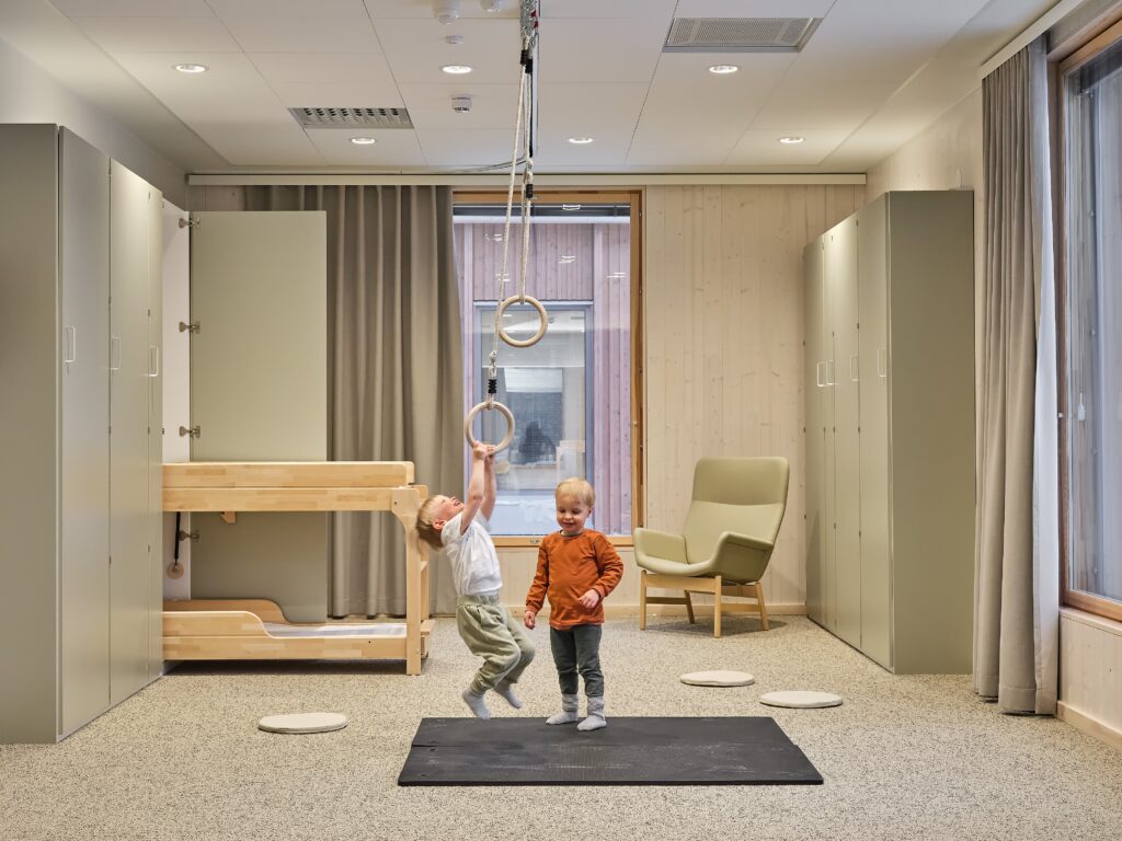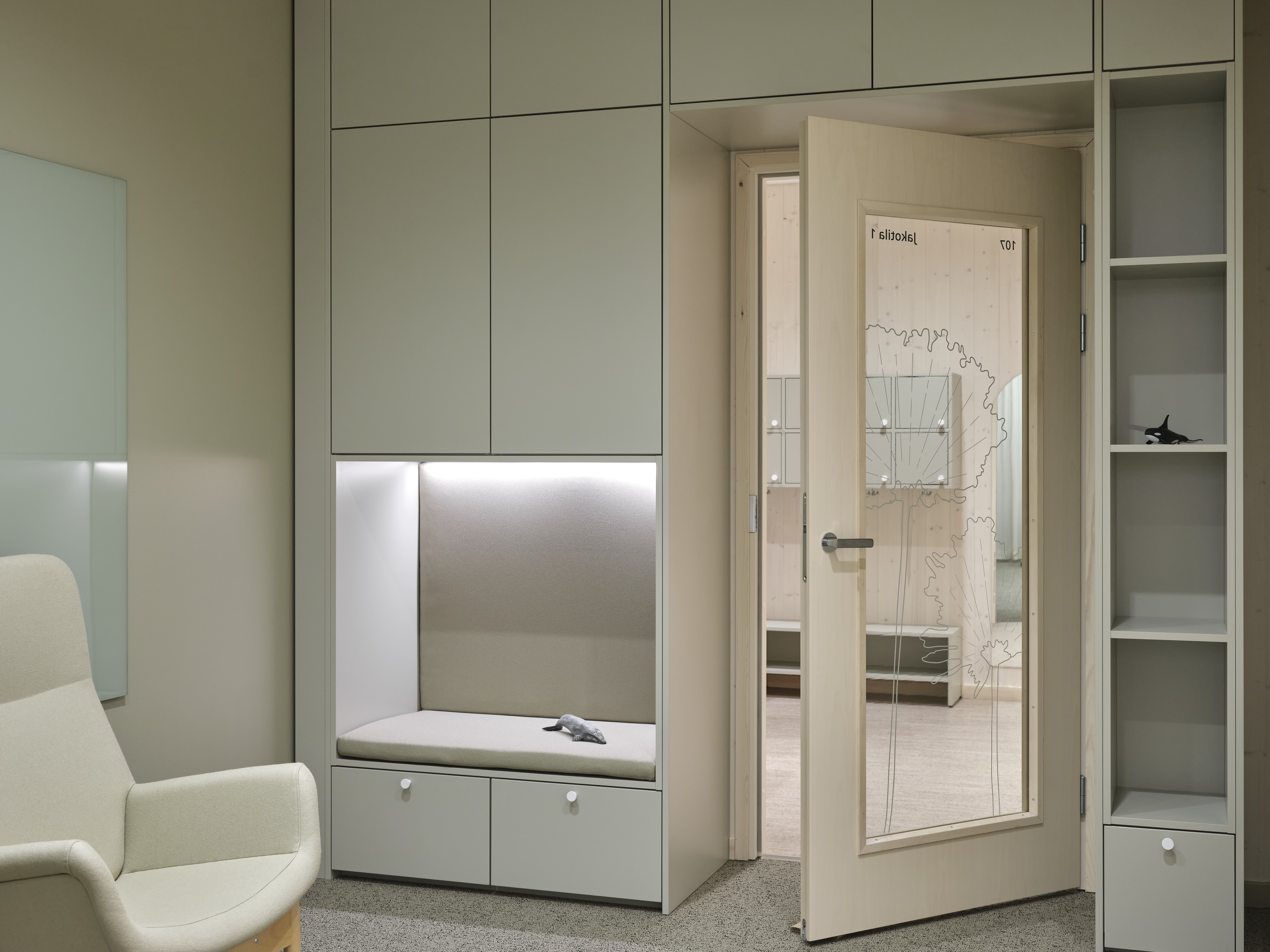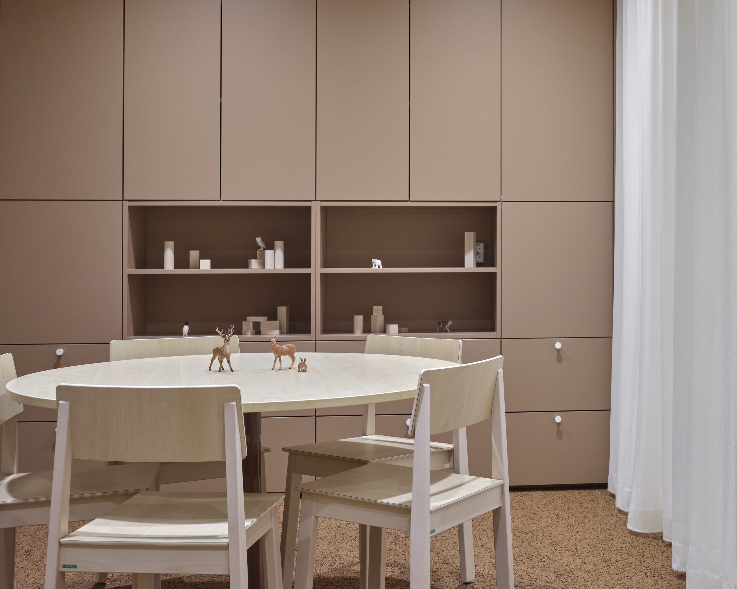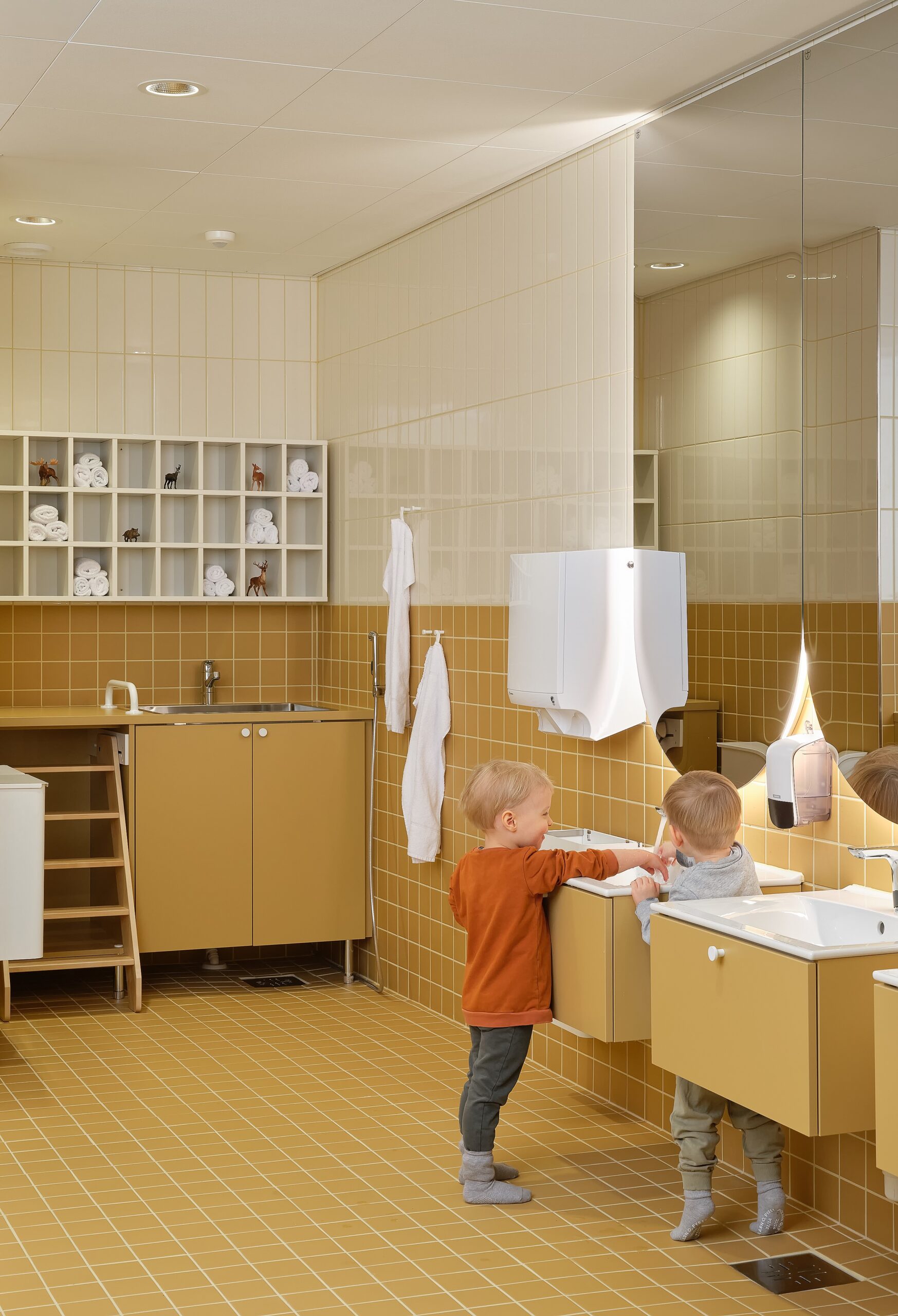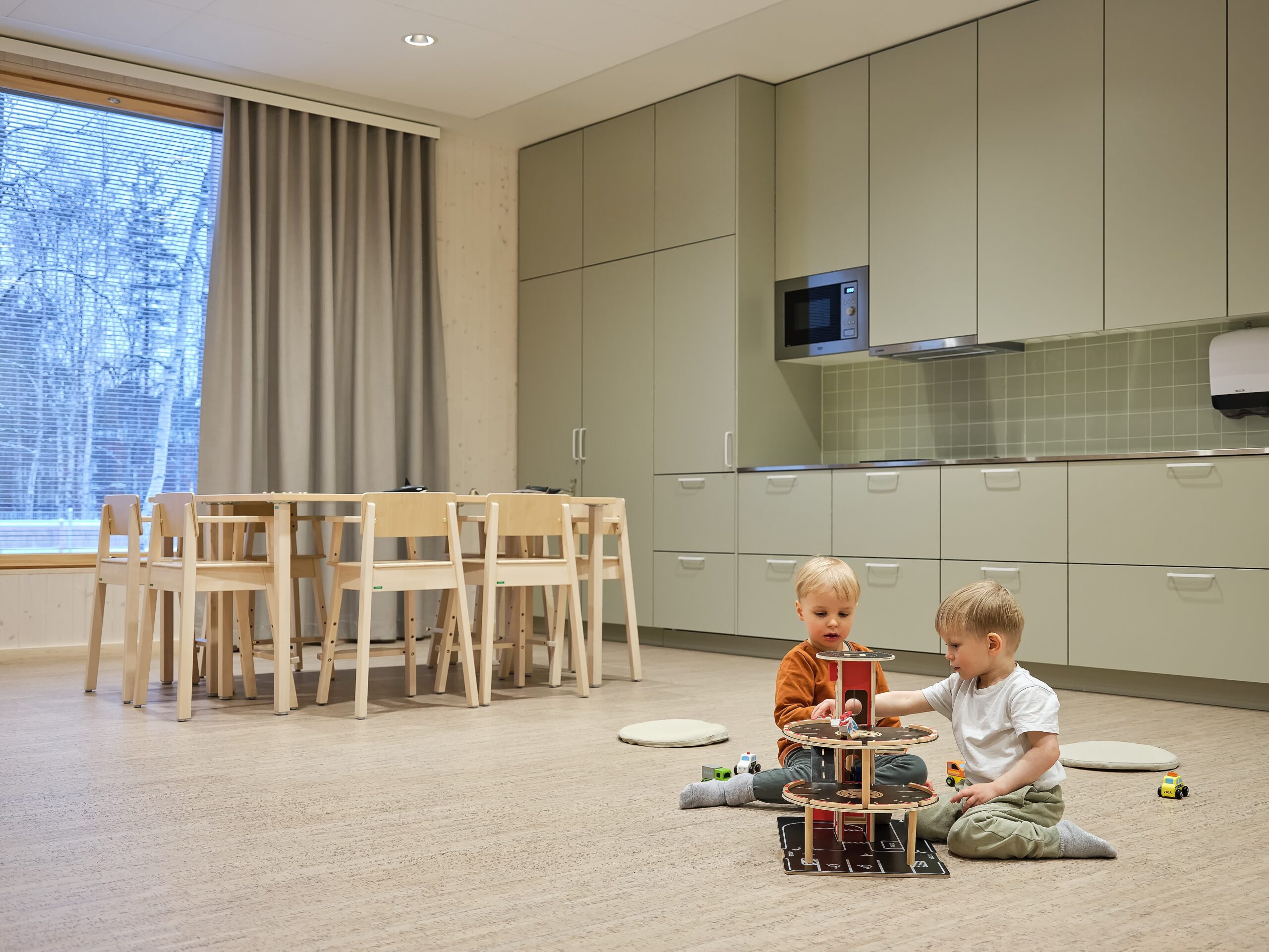 Sävyt ovat vahvasti läsnä lasten tiloissa, joissa sävyt toistuvat niin pintamateriaaleissa, kuin kiinto- ja irtokalusteissa. Rohkeasti käytetyt, harkitusti valitut värisävyt luovat tiloihin eloa ja riemua, kun taas puu yhdessä rauhallisten neutraalien greigen sävyjen kanssa tasapainottaa ja rauhoittaa kokonaisuutta. Sävyjen ja materiaalien lisäksi luontoteema jatkuu tilaajan valitsemiin ryhmänimiin. Nimien mukaisesti ryhmätilojen lasiovia kuvittaakin männynkävyt, tuomenkukat, kuusenkerkät, pajunkissat ja pihlajanmarjat.