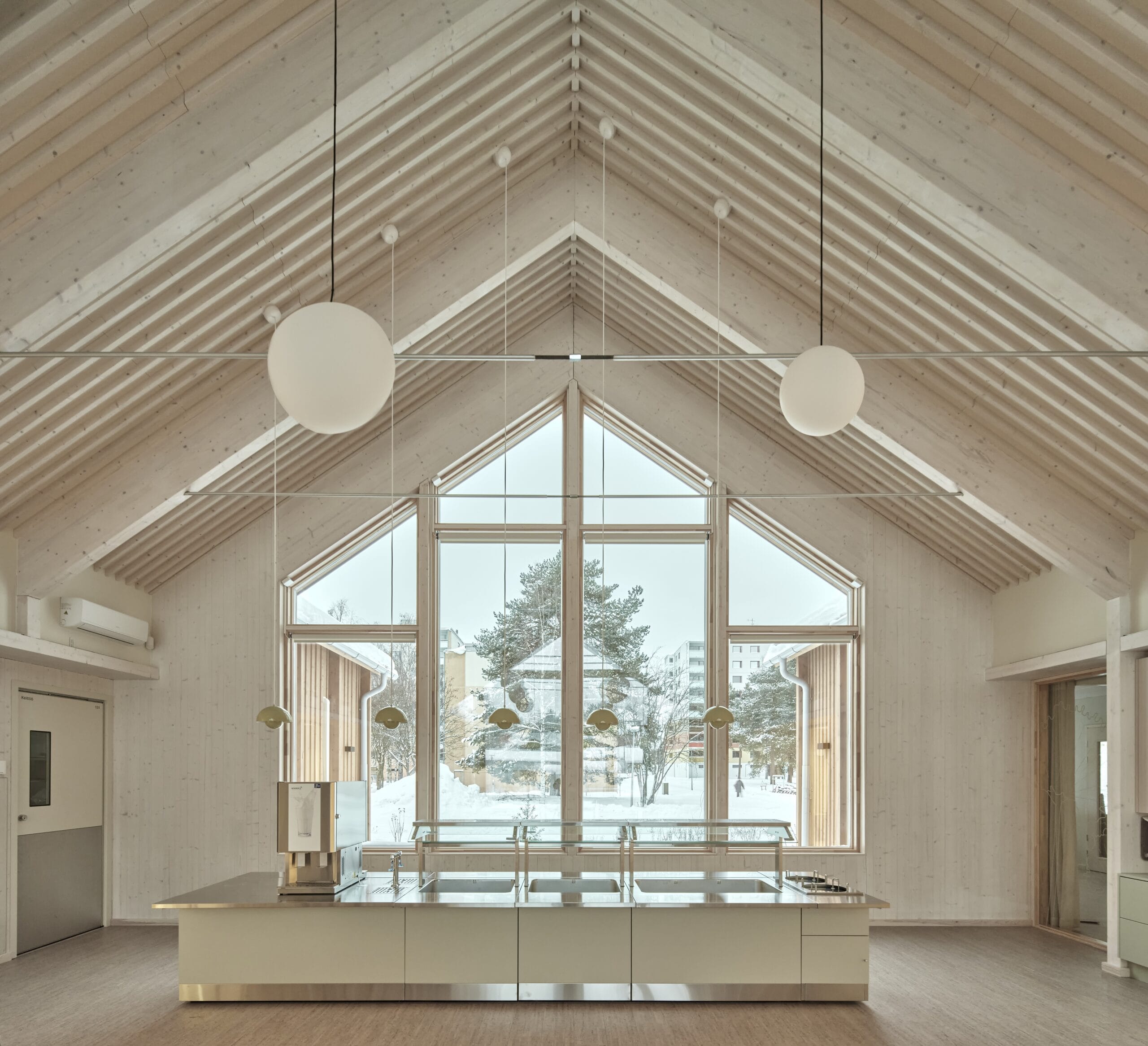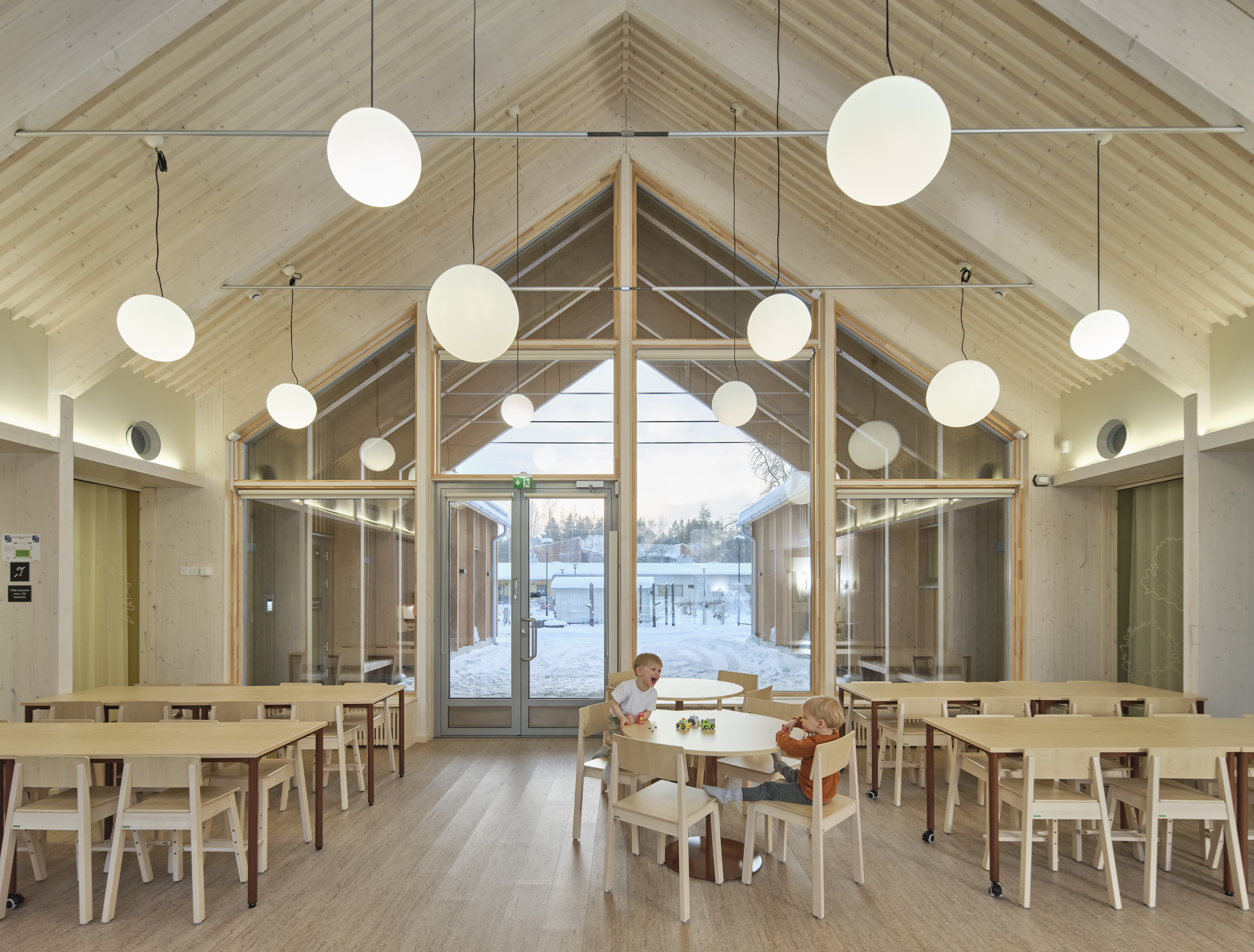Lasten ryhmätilat sijoittuvat parhaalle paikalle pihan puolelle avautuen aurinkoisiin ilmansuuntiin. Huolto- ja aputilat sijaitsevat pohjoispuolella. Kolme jakotilaa on sijoitettu ruokalan yhteyteen, jolloin ne ovat kaikkien ryhmien käytössä. Jakotilat on suunniteltu erilaisiin käyttötarkoituksiin, esimerkiksi kotileikkiin ja lukemiseen.