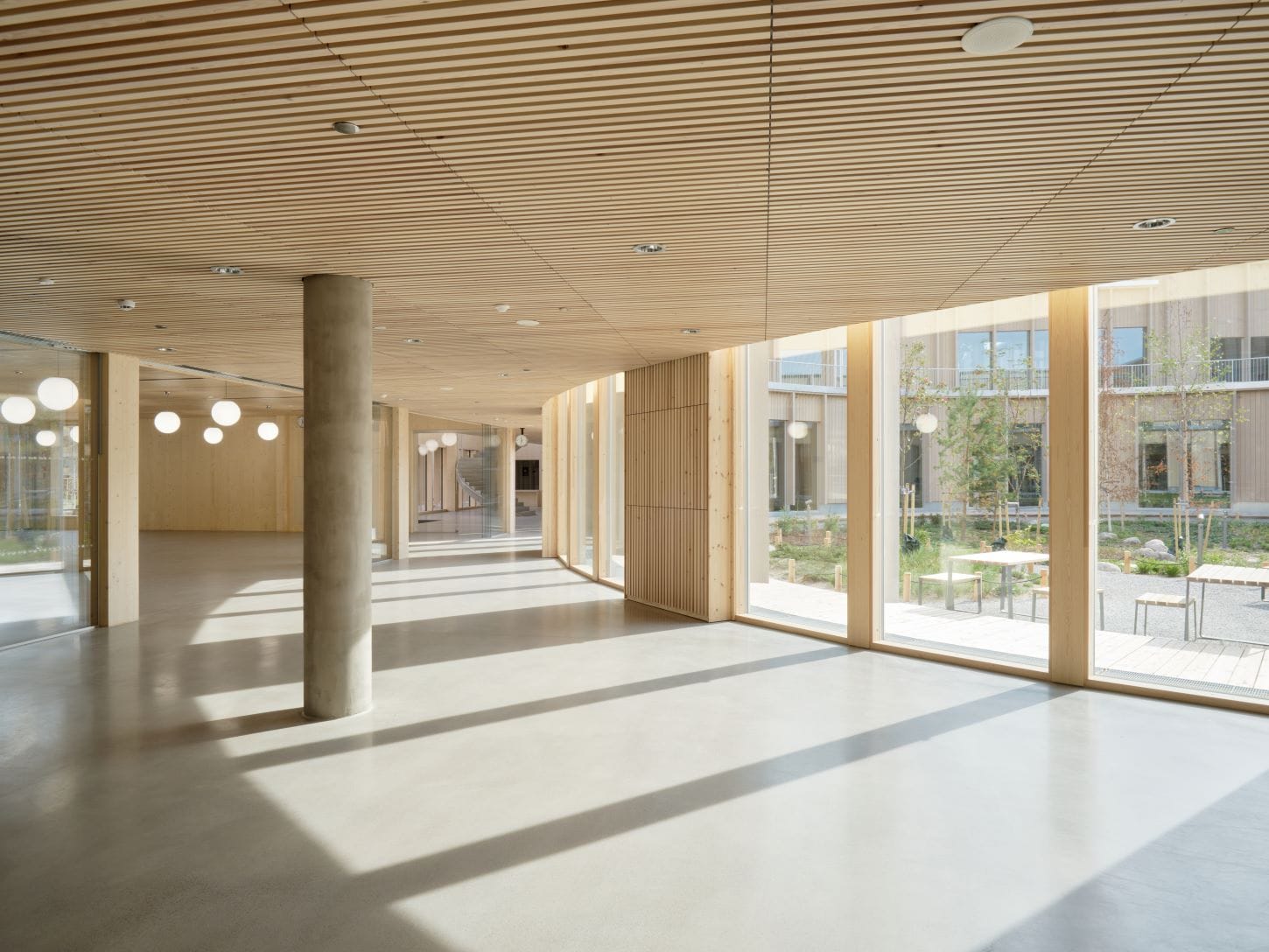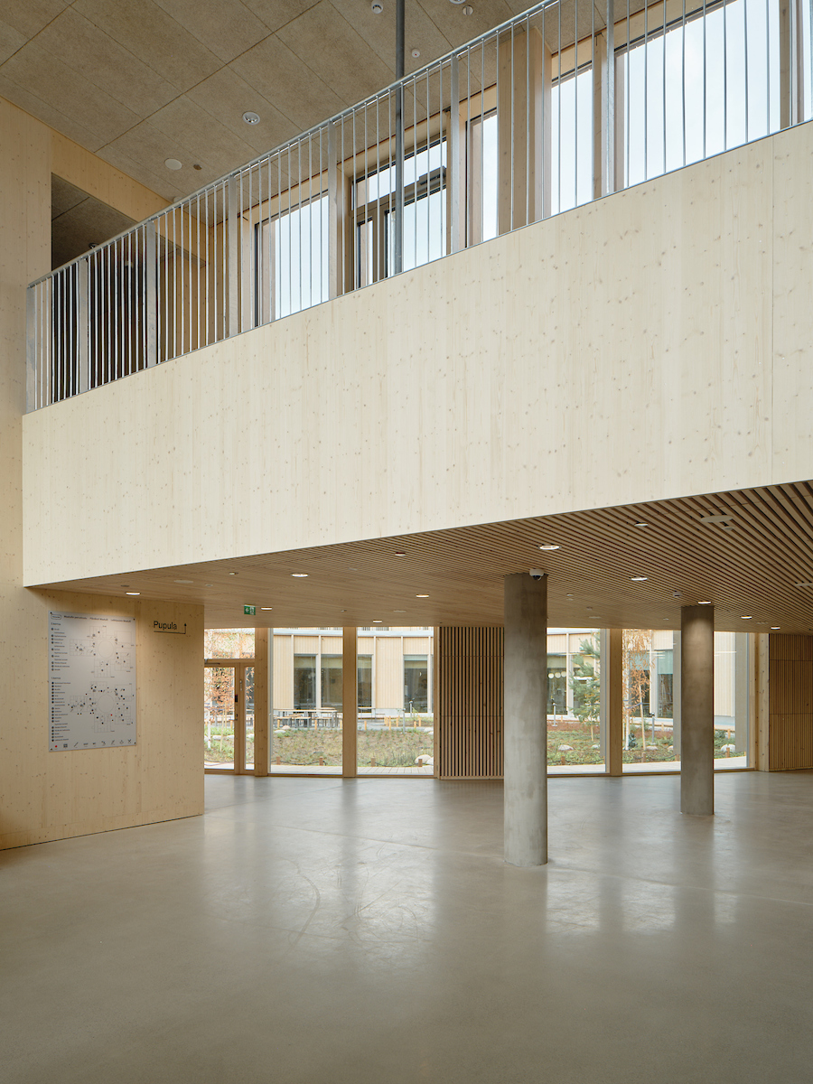 Puuta ja muita luonnonmateriaaleja on käytetty kauttaaltaan runsaasti, mikä liittää rakennuksen luontevasti maisemaan ja luo rauhallisen ja kutsuvan ympäristön, jossa jokainen oppija voi tuntea olonsa kotoisaksi. Vehreä sisäpiha ja valoisa, kutsuvasti puuverhoiltu aula toimivat keskipisteinä, joihin on helppo kokoontua ja jotka samalla sujuvoittavat rakennuksessa liikkumista. Kullakin viidestä siivestä on oma yksilöllinen luonteensa, ja jokaisessa on erilaisia toimintoja, kuten oppimistiloja, ruokala, kuntosali, tiede- ja taidetiloja sekä päiväkoti. Oppimistilat ovat muunneltavissa siirrettävien väliseinien avulla erilaisiin oppimistoimintoihin tai oppilaiden tarpeisiin. Vehreät ulko-oppimistilat ovat keskeinen osa koulun pedagogiikkaa, jonka tavoitteena on auttaa lapsia ymmärtämään luonnon monimuotoisuutta ja inspiroida heitä rakentamaan kestävämpää tulevaisuutta.