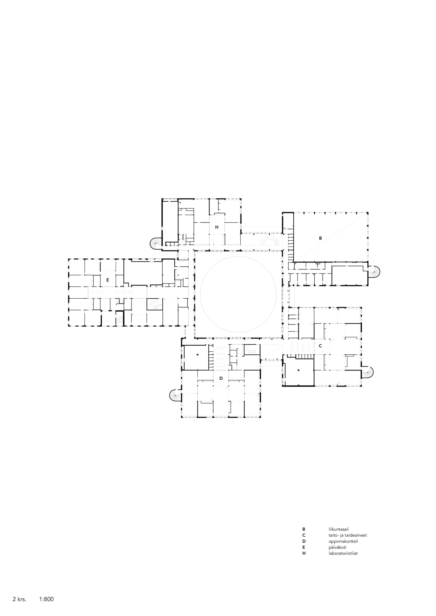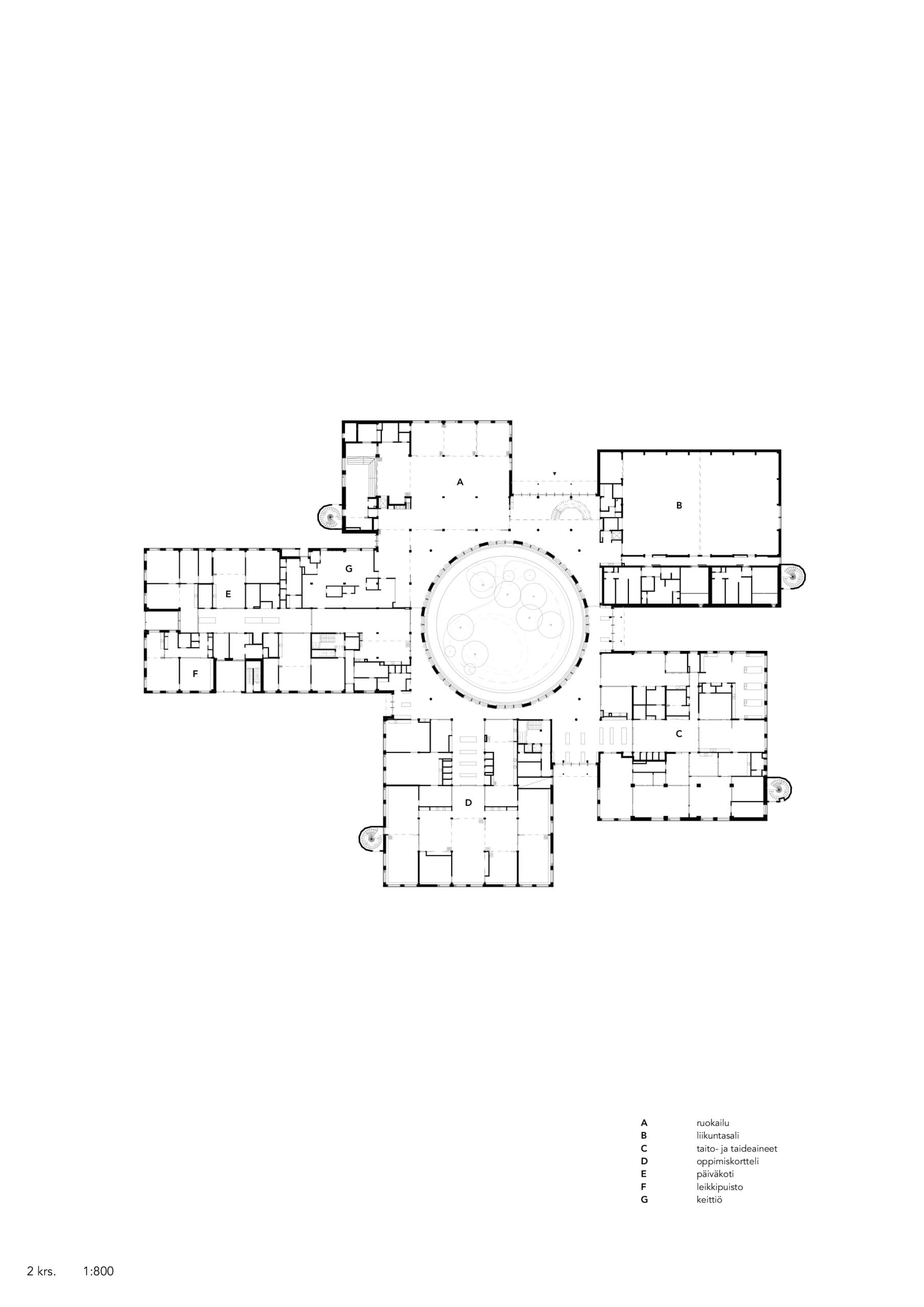 Käyttäjiensä näkökulmasta suunniteltu koulu tarjoaa nuorille oppijoille vihreän ja joustavan opiskeluympäristön, joka tukee heidän hyvinvointiaan, keskittymistään ja luovuuttaan. Rakennuksen eri siivet kytkeyvät toisiinsa keskeisten yhteistilojen kautta, luoden suureen rakennukseen inhimillisen mittakaavan, jossa kaikenikäisten oppijoiden on helppo löytää tiensä, kohdata muita ja oppia toisiltaan. Pohjaratkaisu on tehokas, ja kaikki toiminnot ovat lyhyen matkan päähän rakennuksen sisäänkäynneistä ja keskisestä sisäpihasta.