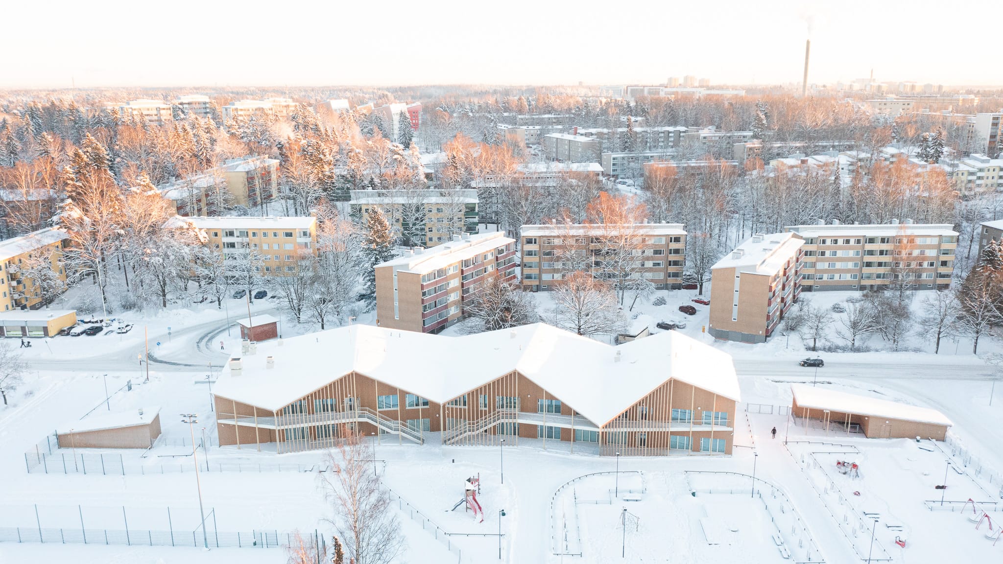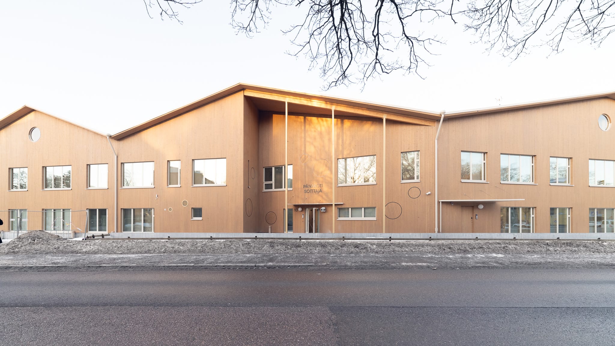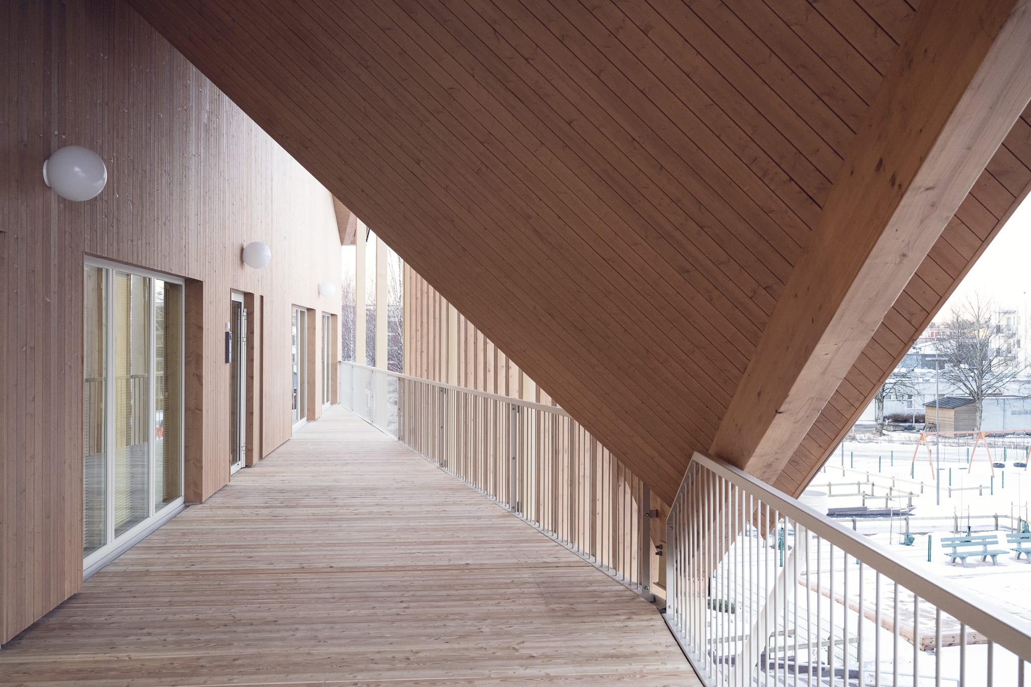 Päiväkodin ulkoarkkitehtuurissa mieliinpainuvinta on lystikäs, mittakaavaa pienentävä vesikatto. Muodostaan huolimatta se pystyttiin kokoamaan niin nopeasti tehtaalla valmistetuista puuelementeistä, ettei tarvittu rakentamisen aikaista sääsuojaa. Katon muodostama puusta tehty taitteinen terassivyöhyke muodostaa voimakkaita tiloja, kuin puumajojen sarja. Kaupunkitontilla ei ollut suojaavaa metsää, joten halusimme tehdä lapsille sellaisen käyttäen sahatavaran yleisimpiä kokoja.