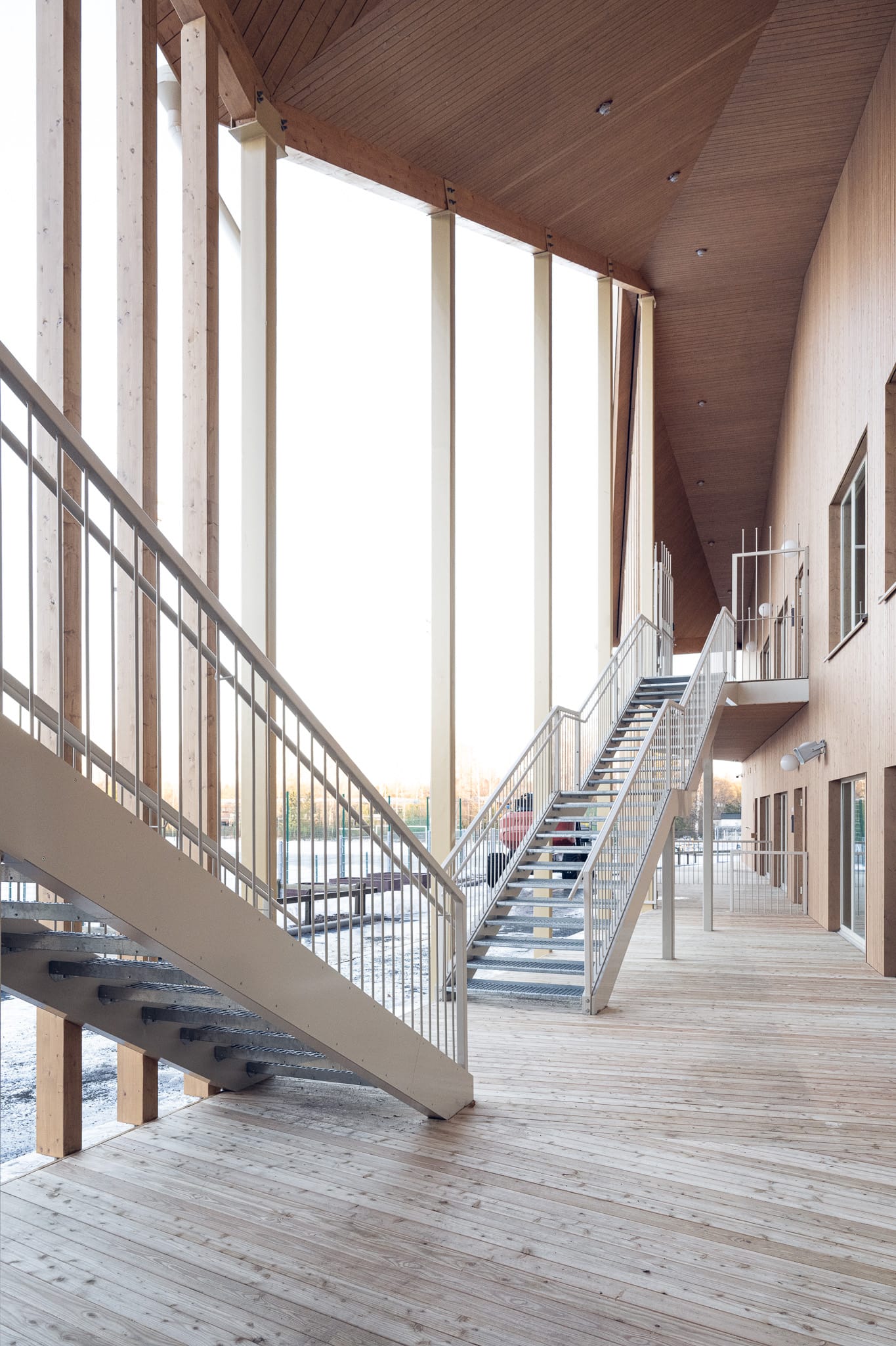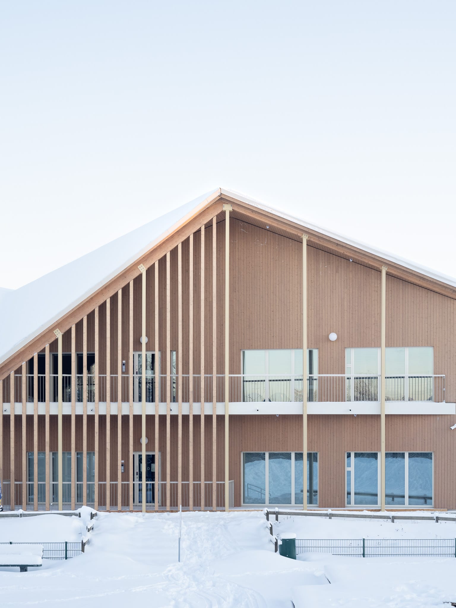 Julkisivut on pystyverhoiltu hunajaisen sävyisellä, hienosahatulla kuusella. Käyttäjät kulkevat terassin siperianlehtikuusilankkujen päältä sisään ja ulos. Puu on Euroopasta. Terassi tuntuu turvalliselta, kun sitä reunustavat mäntyiset liimapuupilarit, kuin puiden rungot. Ulkona sateelta ja paahteelta suojaa kuusi, jolla on verhoiltu terassialueen taitteiset lipat.