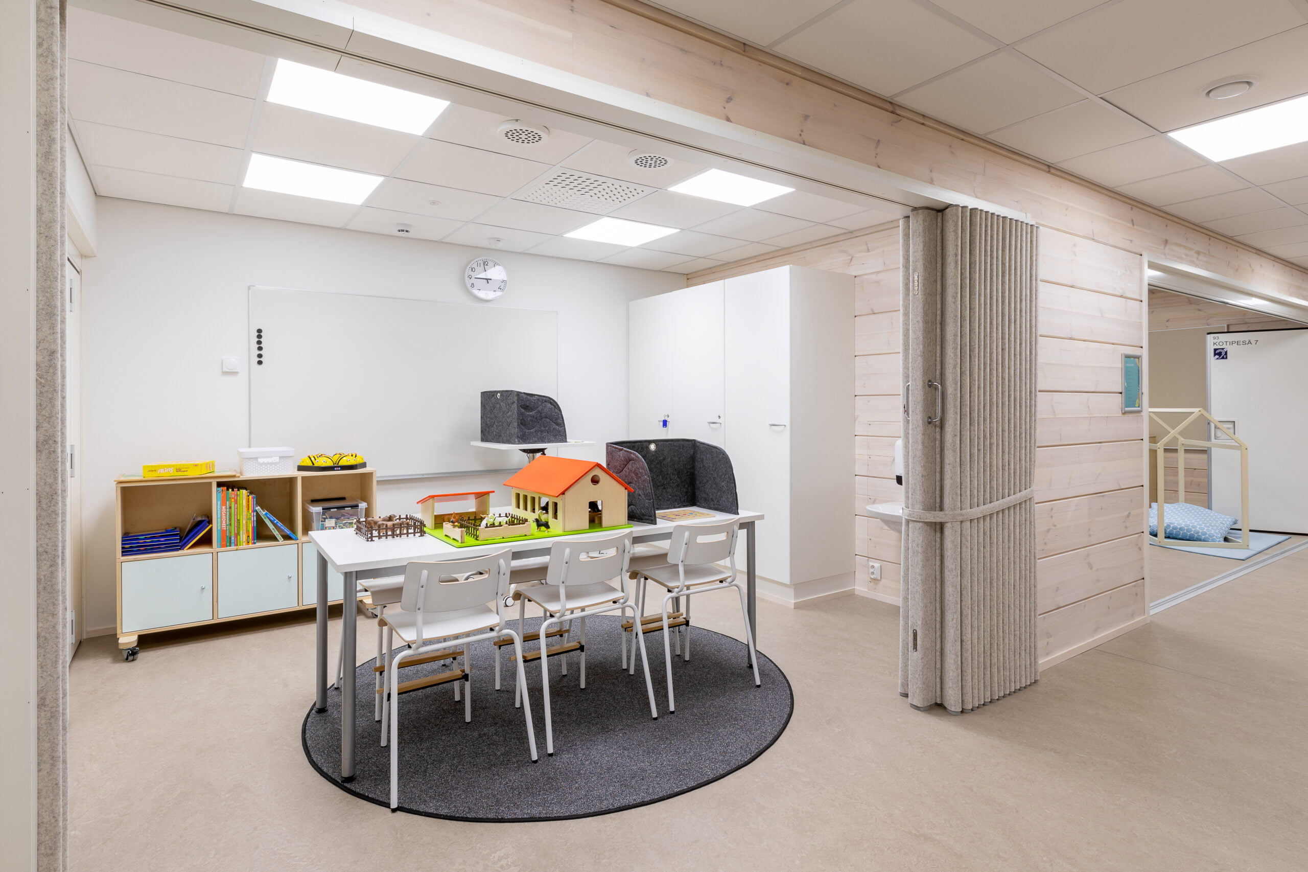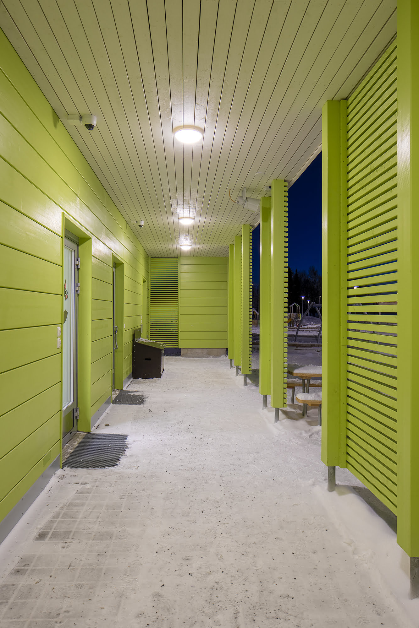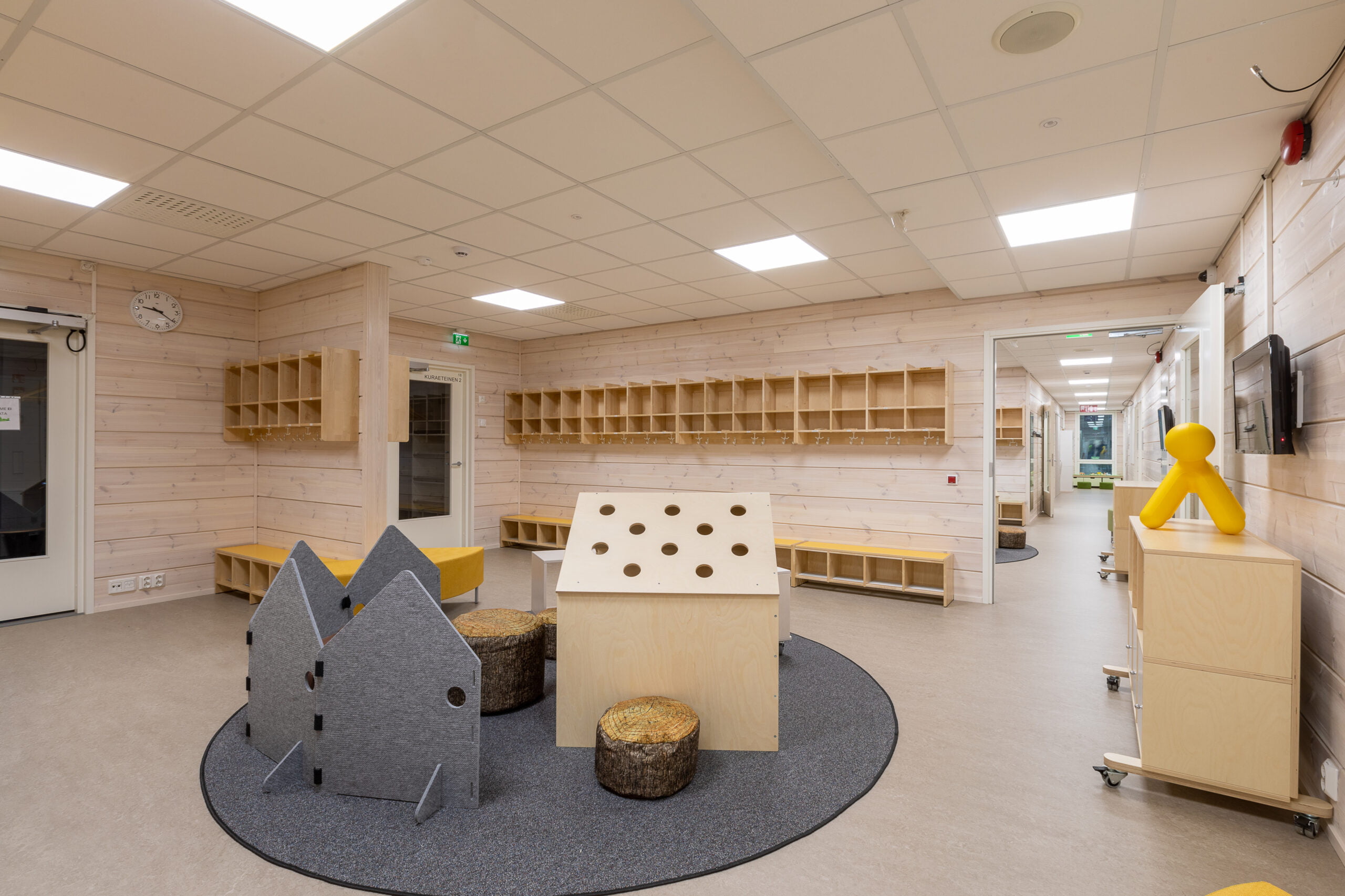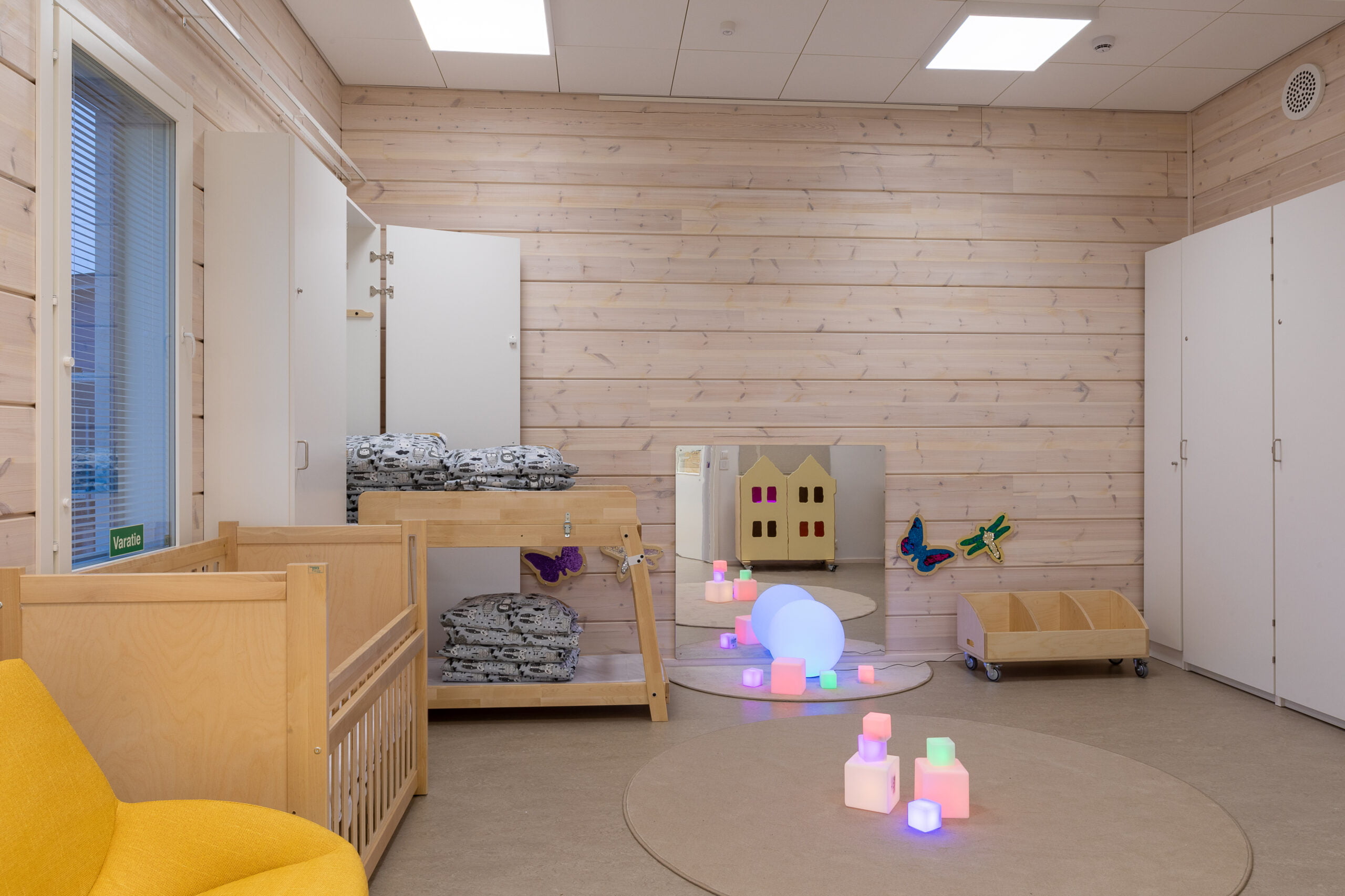 Rakennuksessa on myös alle 10 lapsen yöhoidon mahdollistava vuorohoito-osasto, joka on sijoitettu kotikeittiön, ruokasalin ja monitoimisalin läheisyyteen. Tilojen korkeusvaihtelut ovat harkittuja, minkä vuoksi sisälle syntyy monipuolisia paikkoja, jotka houkuttelevat lapsia syventymään luovuuden ja oppimisen tilanteisiin.
