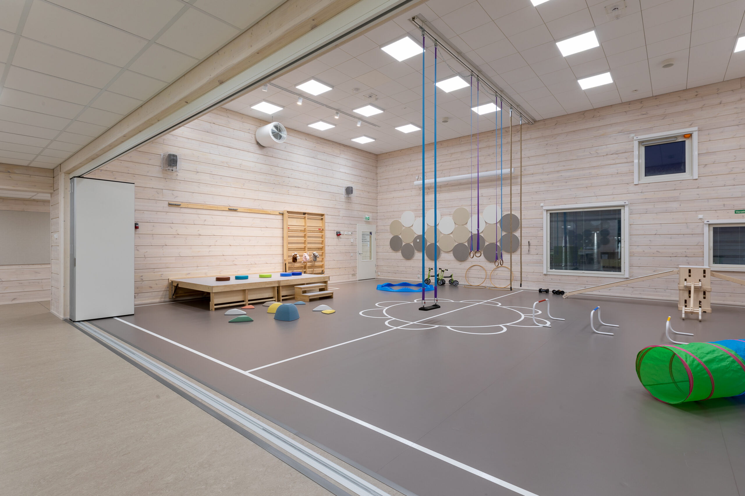 Hirsivahalla kertaalleen käsitelty hirsipinta luo valoisan, miellyttävän ympäristön. Rakennuksessa on panostettu terveellisyyteen ja turvallisuuteen. Lasten wc-tiloissa on automaattihanat käsienpesualtaissa ja väliovien kahvat ovat antibakteerisia. Tiloja on mahdollista jakaa ja yhdistää taittoseinillä, ja muunneltavuutta on paljon.