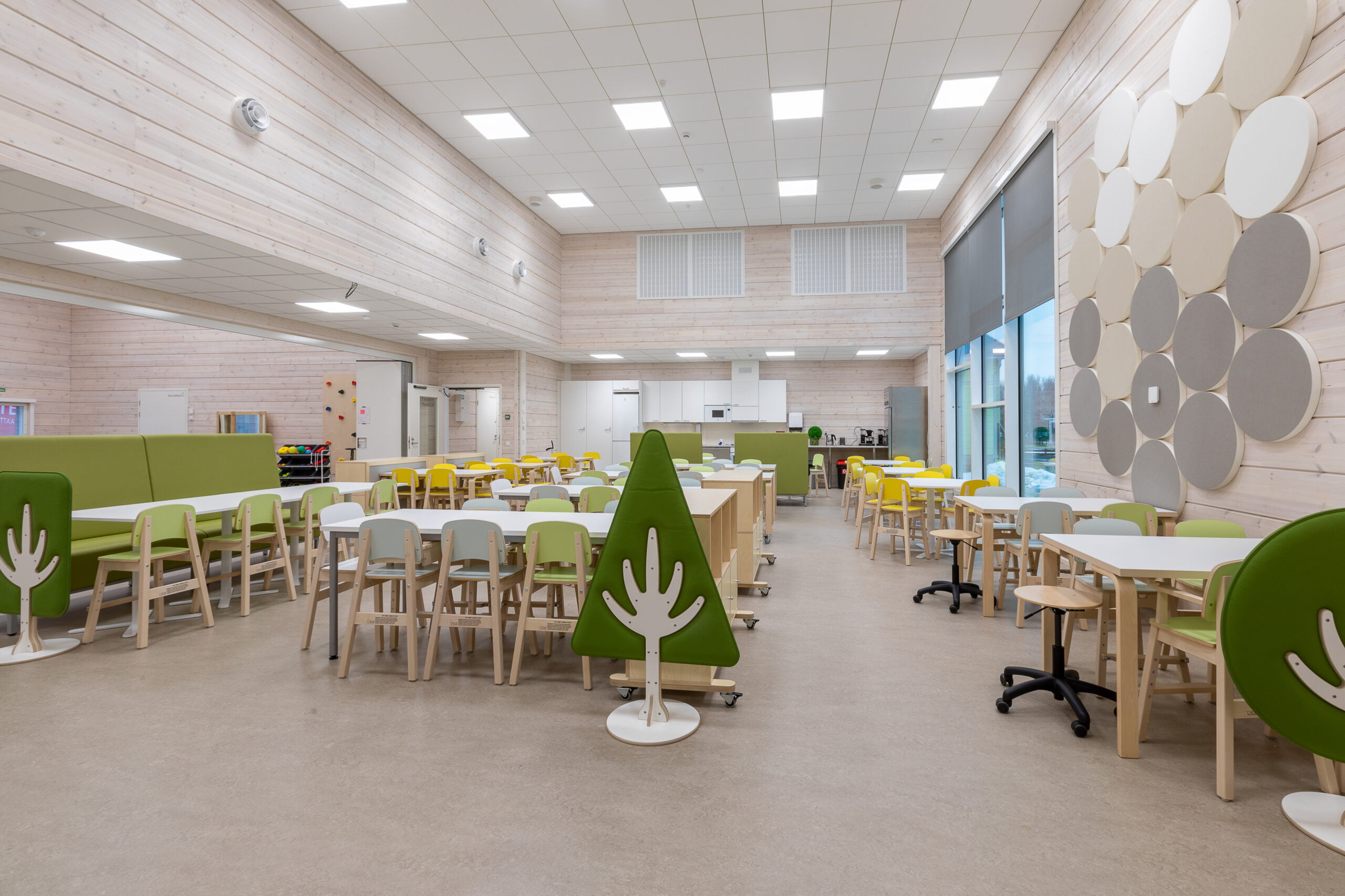 Ruokasali avautuu merimaisemaan suuren lasiseinän avulla. Monitoimisali on varustettu monipuolisesti lasten liikuntaa varten. Myös salin iltakäyttö on huomioitu: iltakäyttöä varten on oma sisäänkäynti ja pukuhuone, jotka eivät häiritse varhaiskasvatuksen toimintaa.