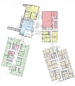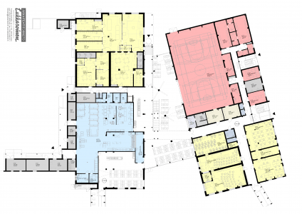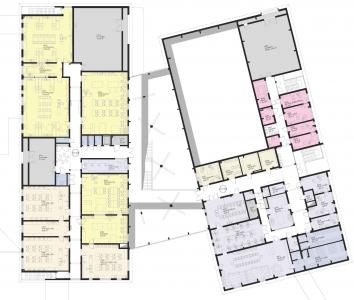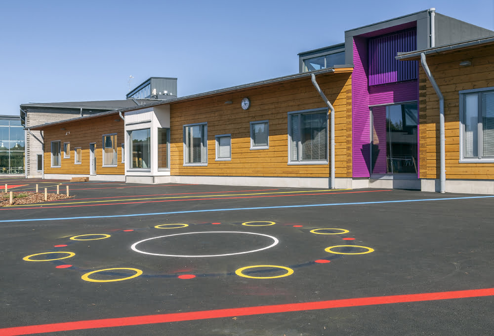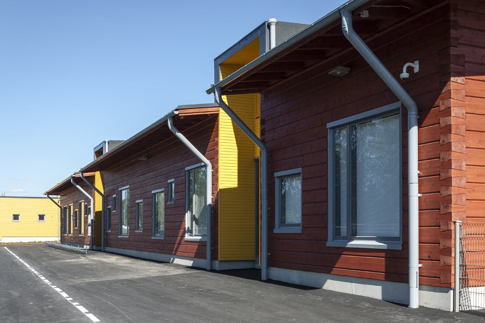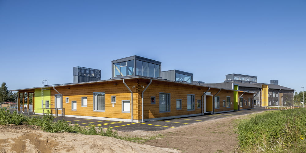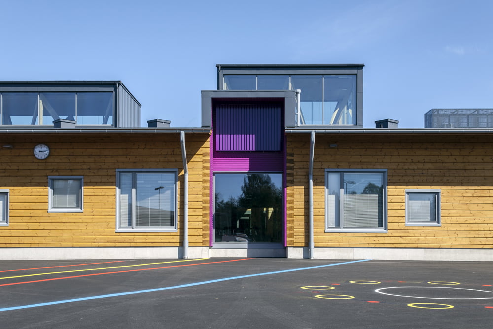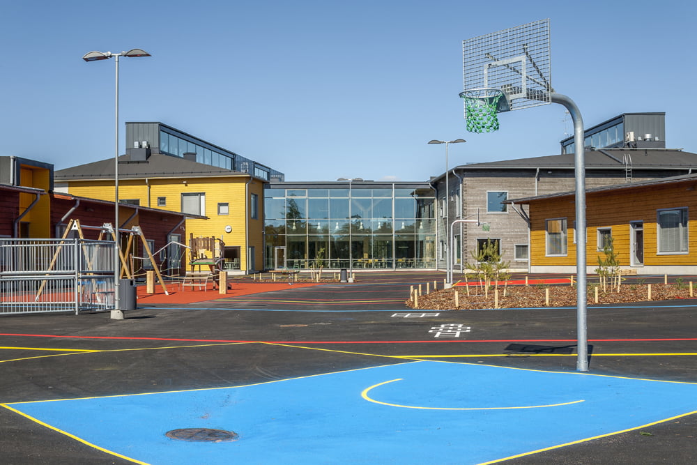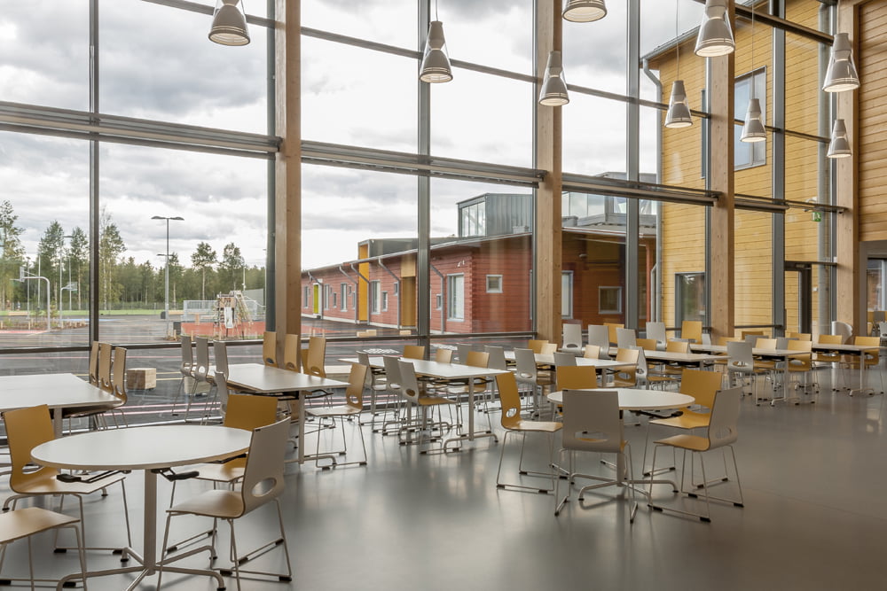 Yksikerroksiset opetussolut rakentuvat pienistä ”hirsimökeistä”, joiden väleissä on ikkunoita ja ovia. Nämä välitilat toimivat myös avoimina opetus- ja vetäytymistiloina varsinaisen opetustilojen välissä. Yksikerroksisten rakennusosien keskellä on avarat aulatilat/monikäyttötilat, jotka saavat luonnonvaloa suurista kattolyhdyistä. Osa opetustiloista saa luonnonvaloa vain keskusaulojen kautta lattiasta kattoon ylettyvien ikkunoiden avulla. Myös kaksikerroksisten rakennusosien keskelle on sijoitettu kattolyhdyt, jotka valaisevat toisen kerroksen keskellä olevia käytävätiloja.