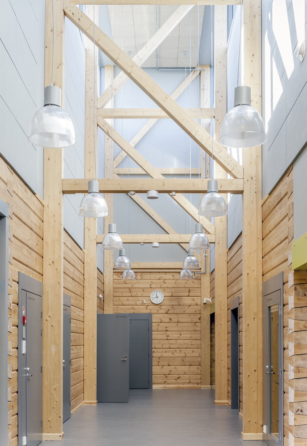Rakennuksen kaikki seinät betonirunkoista osaa lukuun ottamatta ovat massiivihirttä (ulkoseinät ovat 275 mm:n lamellihirttä, väliseinissä on kolmea hirsipaksuutta (275, 205 ja 130 mm). Pääaulan ja valolyhtyjen kato kannatetaan monimuotoisin liimapuupilarein. Hirsipinnat on sisätiloissa käsitelty värittömällä suoja-aineella. Väriä huonetiloihin on saatu voimakasvärisillä levypinnoilla, joita on käytetty kiintokalusteiden kiinnityspintoina ja ovi- ym. aukkojen laskeutumisvarojen peitelevyinä. Myös julkisivujen lautaverhoilua on elävöitetty voimakkailla väripinnoilla. Hirsipinnat on käsitelty maanläheisimmillä värisävyillä.