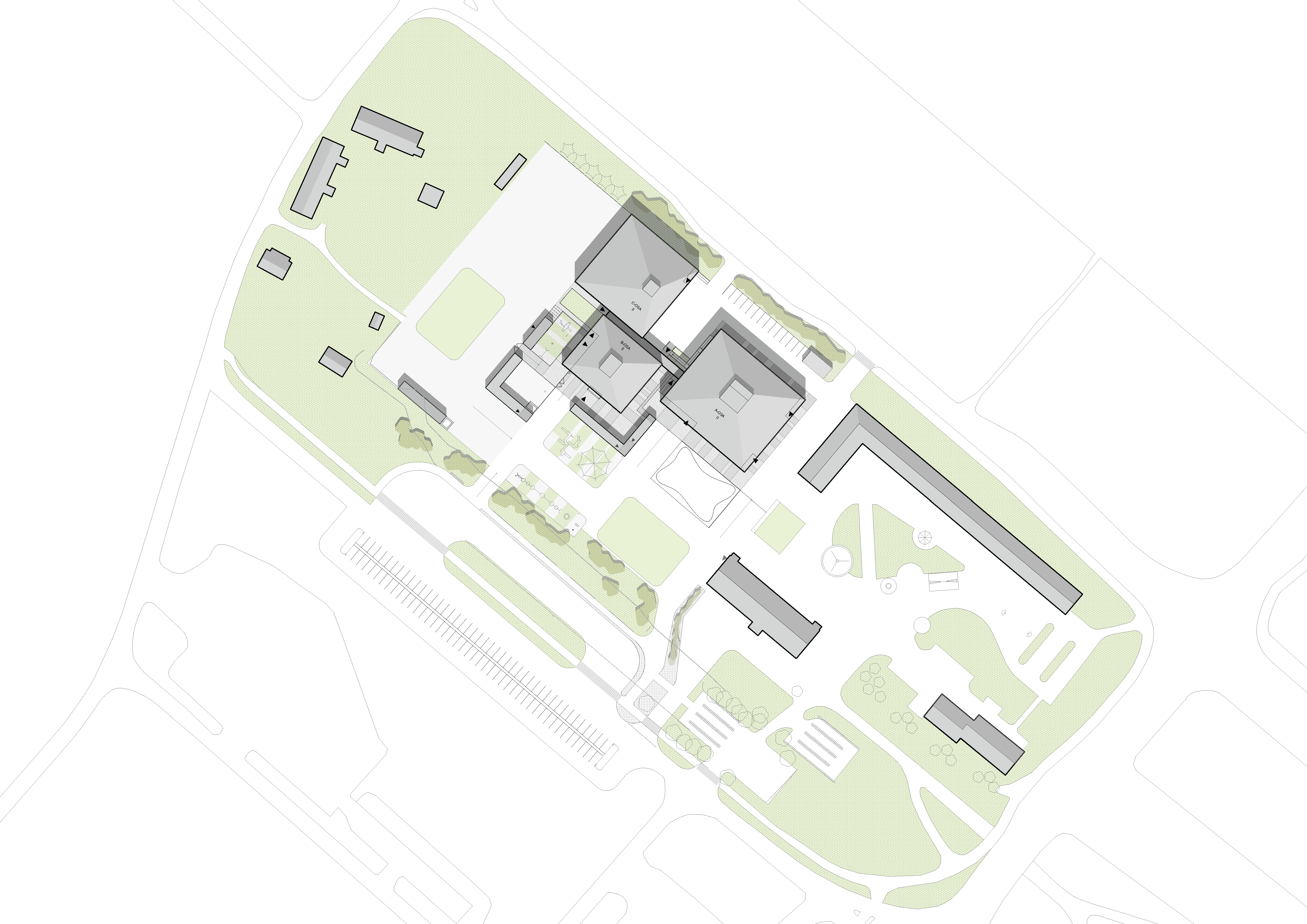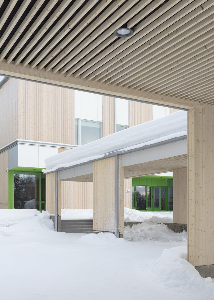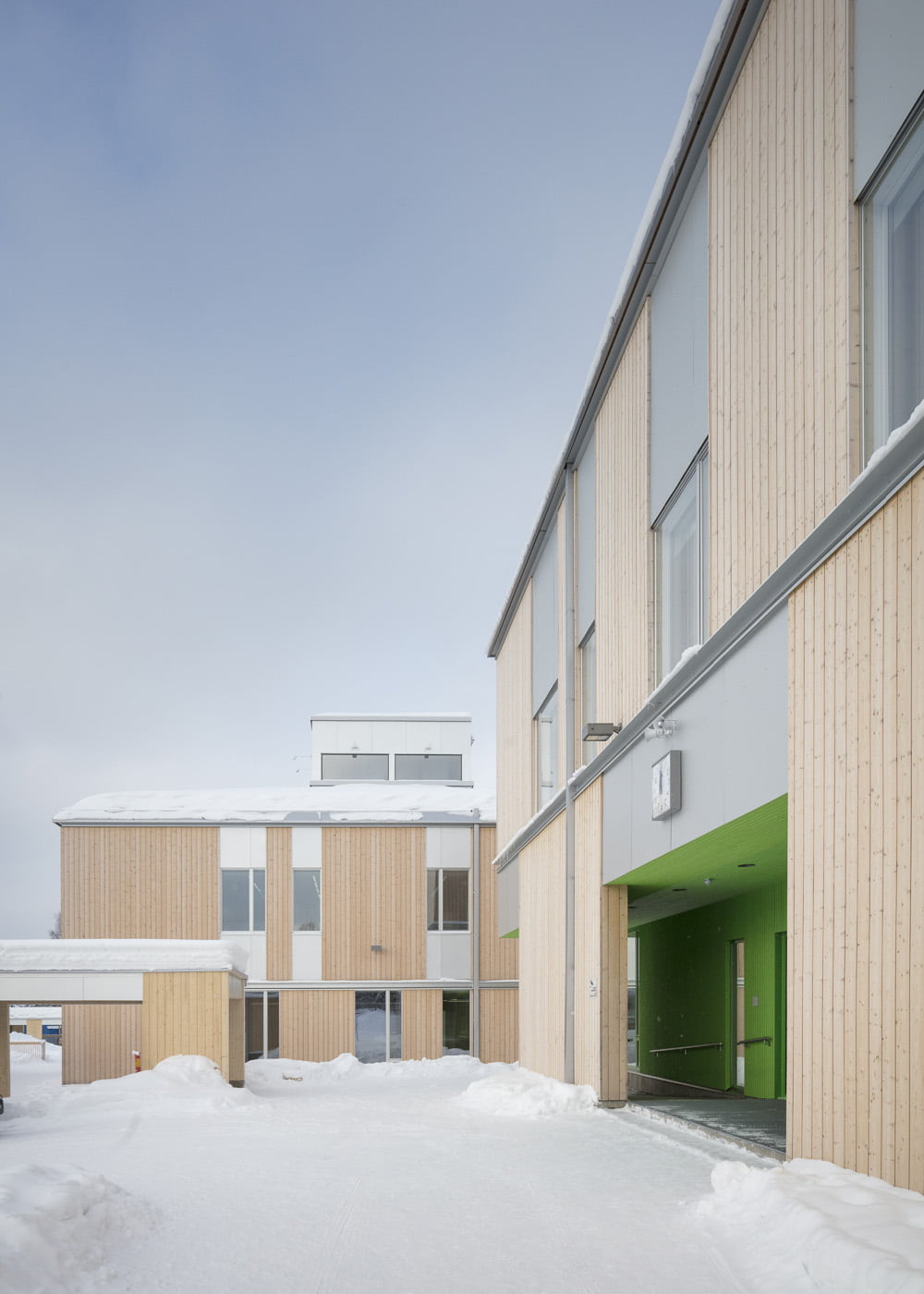 Suomen ensimmäisen CLT-koulun suuri massa on pilkottu kolmeen lohkoon. Uudisrakennusten rypäs ja välituntikatokset varastoineen rajaavat monimuotoisia, pienen mittakaavan ulkotiloja.