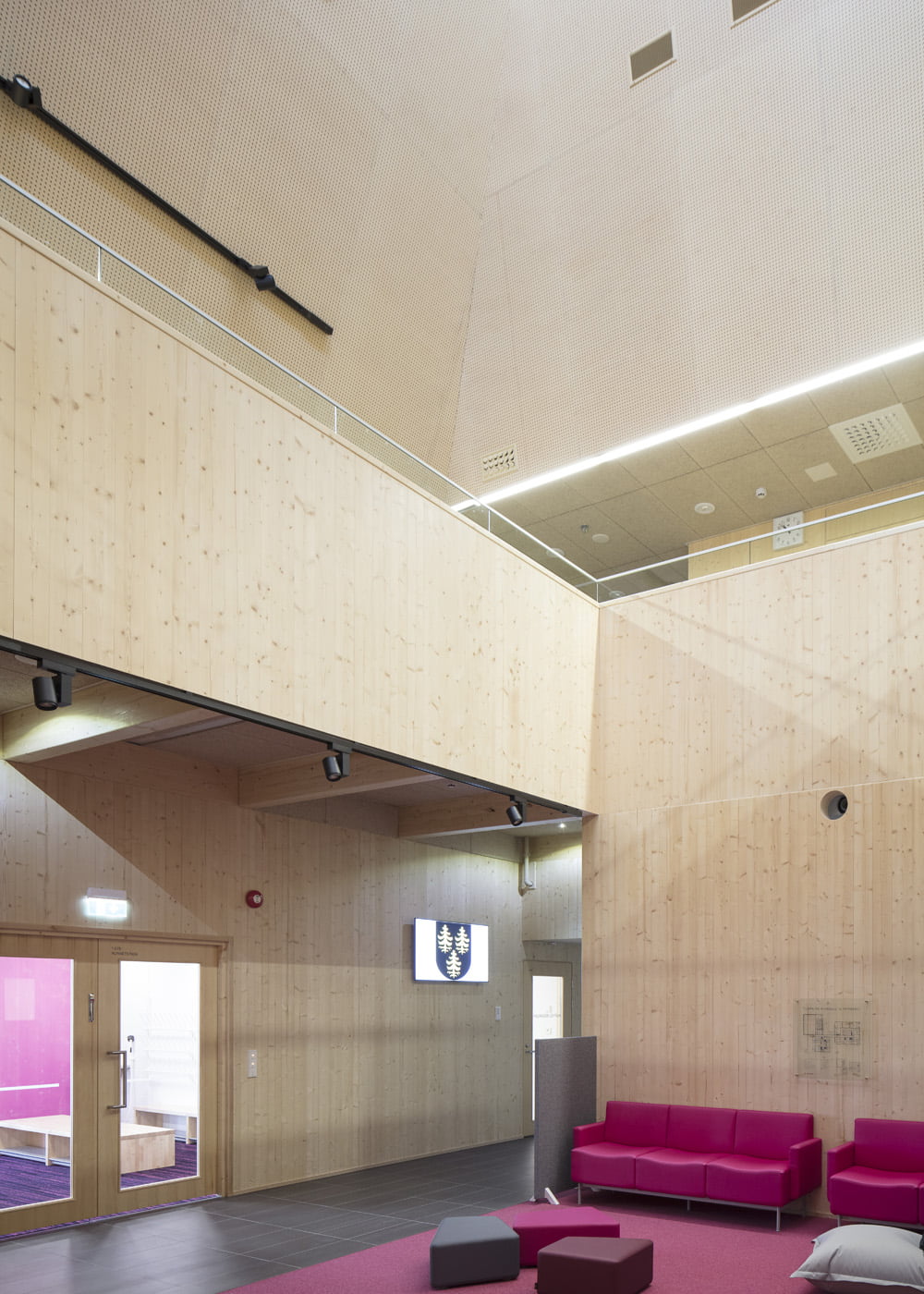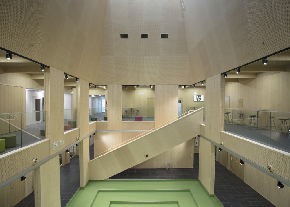 Levyjen arkkitehtuuri jatkuu myös sisätiloissa. Puu on esillä kaikkialla ja monessa muodossa. Hieno CLT-levyn pinta on esillä sellaisenaan. Vaakarakenteet ovat liimapuuta, nekin mahdollisuuksien mukaan näkyvillä. Kevytrakenteisissa pinnoissa on käytetty paljon koivuvaneria, sisäkatoissa puu-magnesiittilevyä, kiintokalusteissa massiivikoivua ja -kuusta.