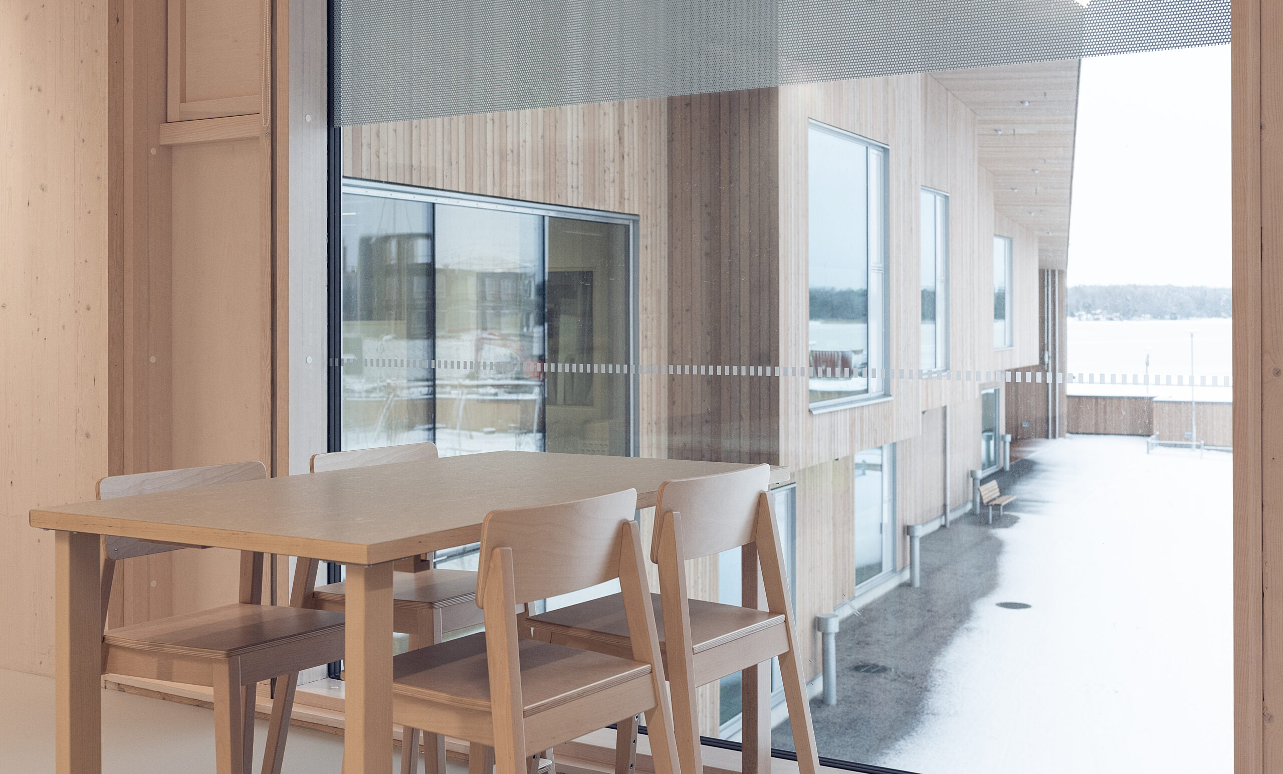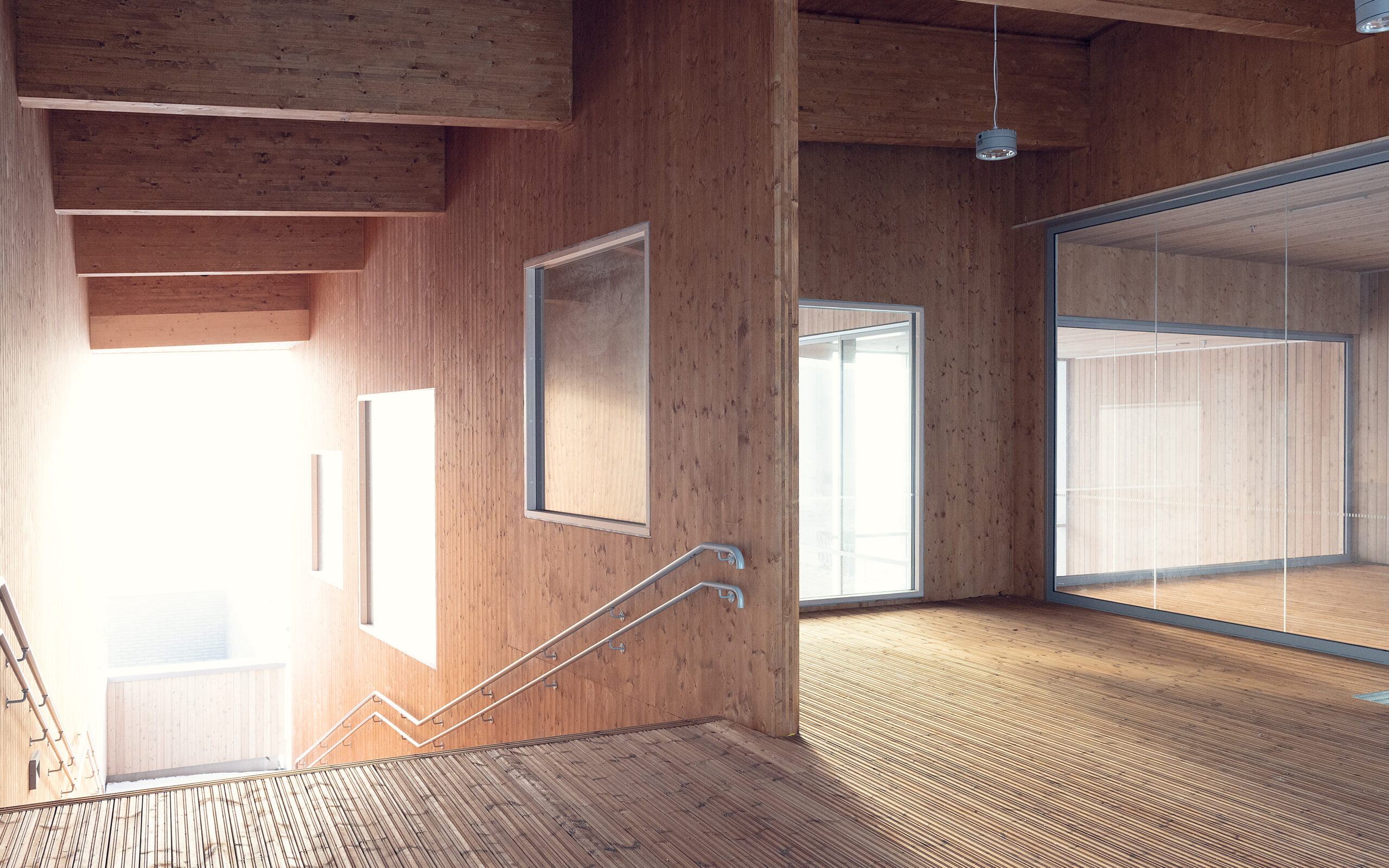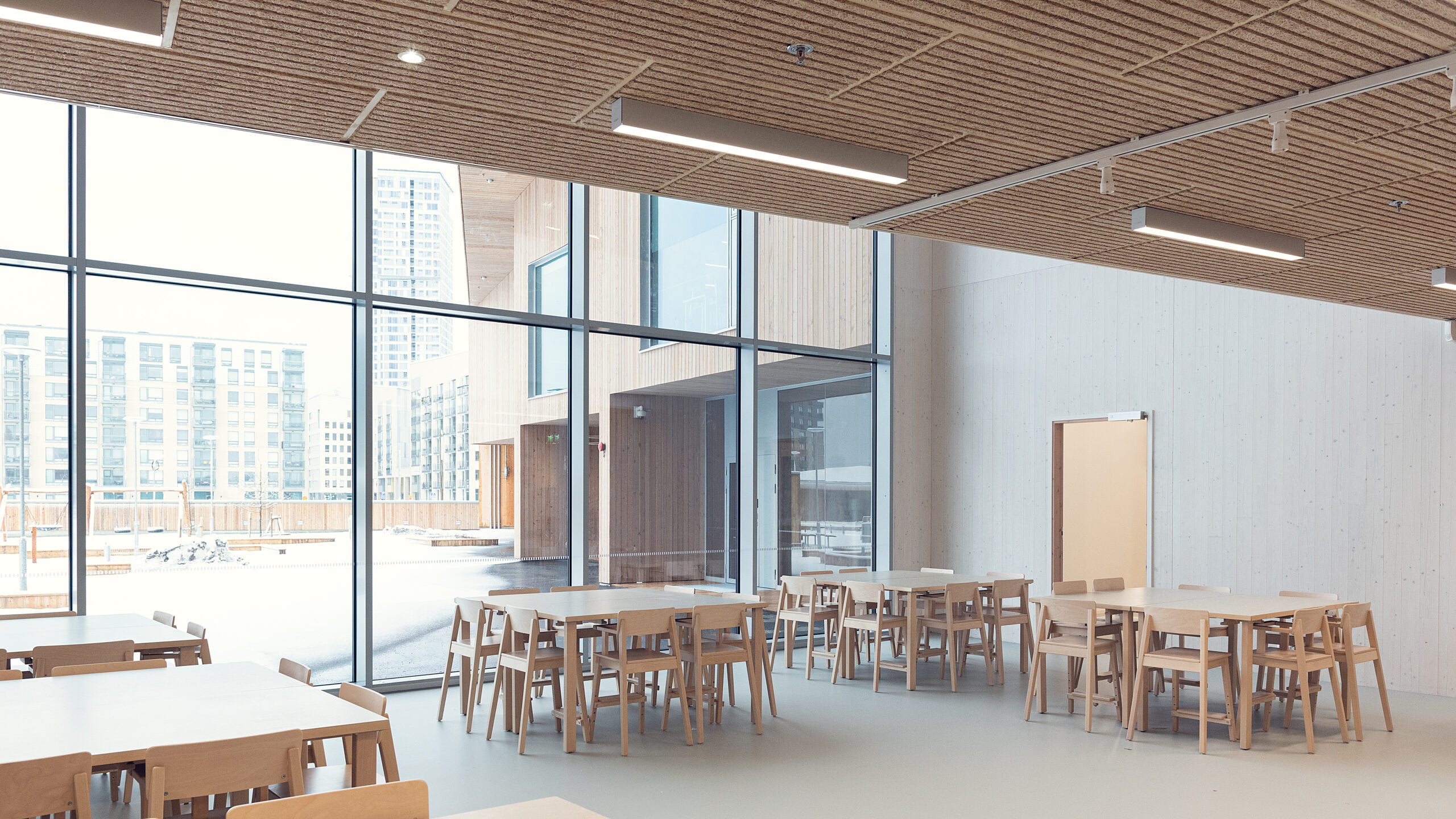 Rakennuksen syliin muodostuu salin ja ruokailutilojen muodostama tilasarja, johon on sujuva yhteys viereisistä toiminta-alueista. Sisätiloissa on runsaasti sisäikkunoita ja lasiseiniä ja tilojen välille avautuu mielenkiintoisia sisänäkymiä.