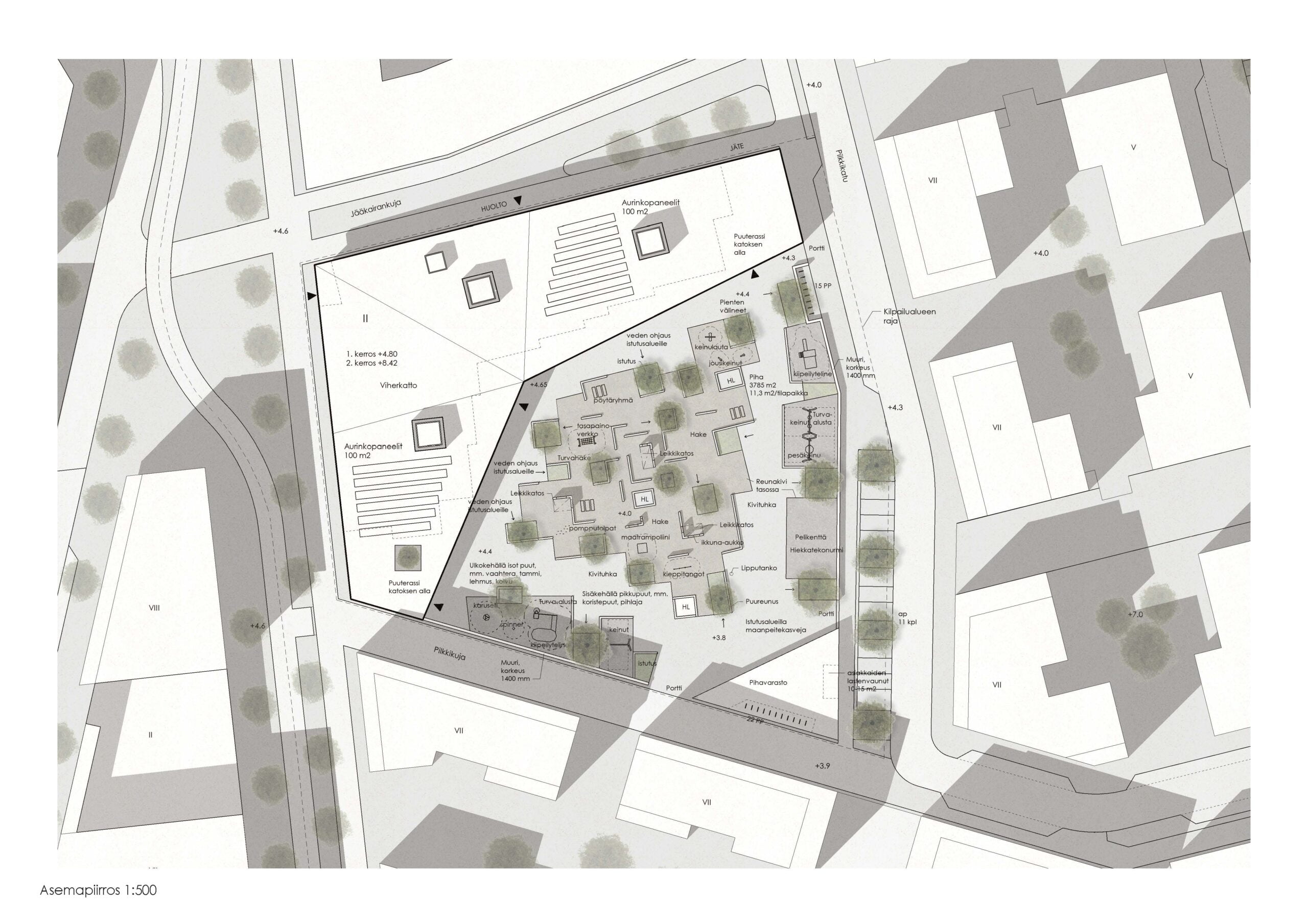 Vesikatteena on hulevesikuormitusta tasaava viherkate ulkopuolisella vedenpoistolla.