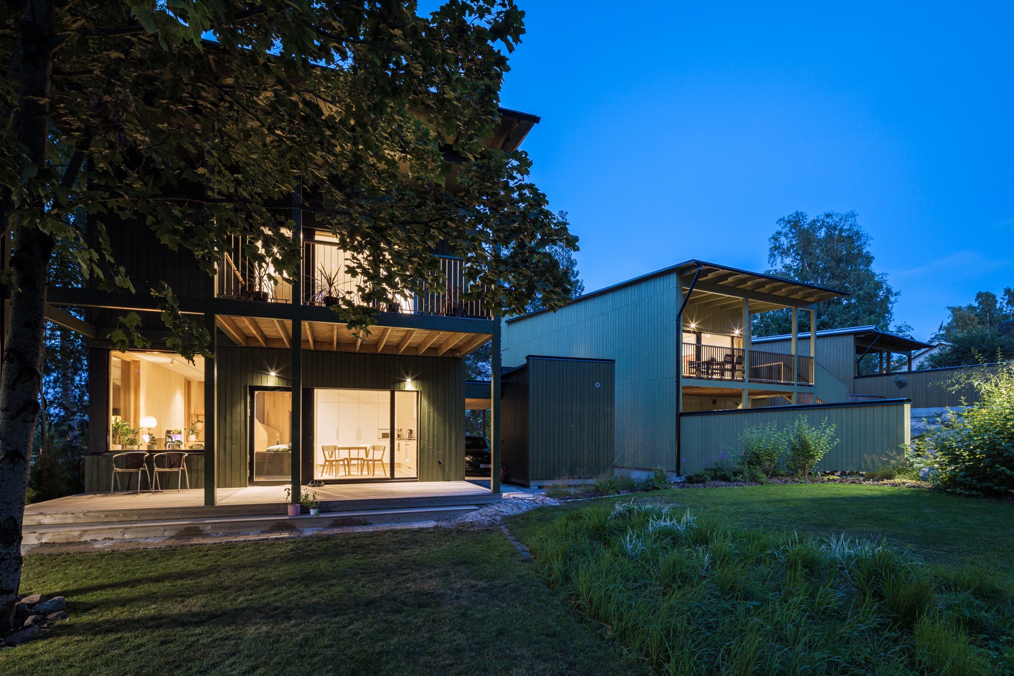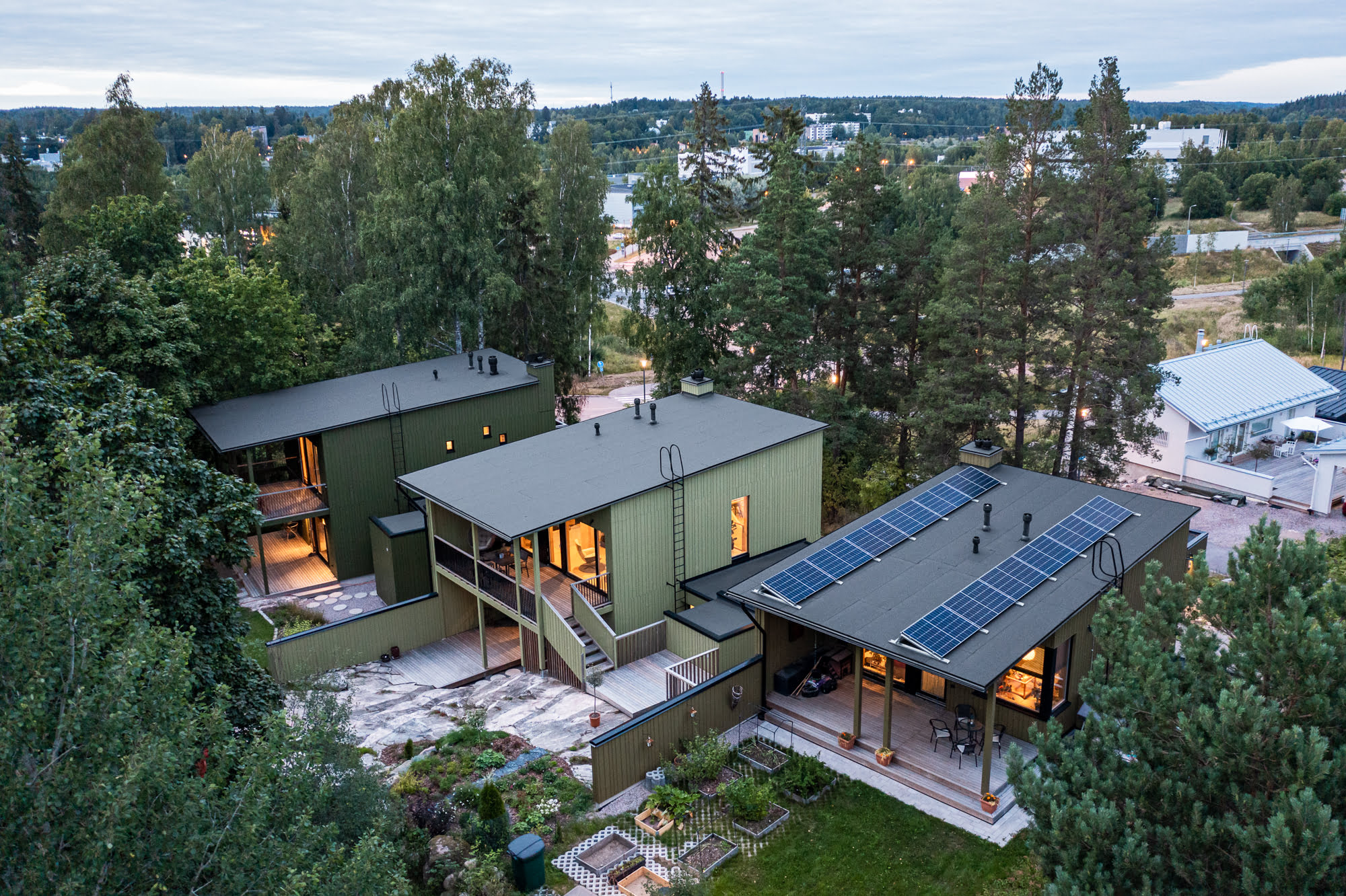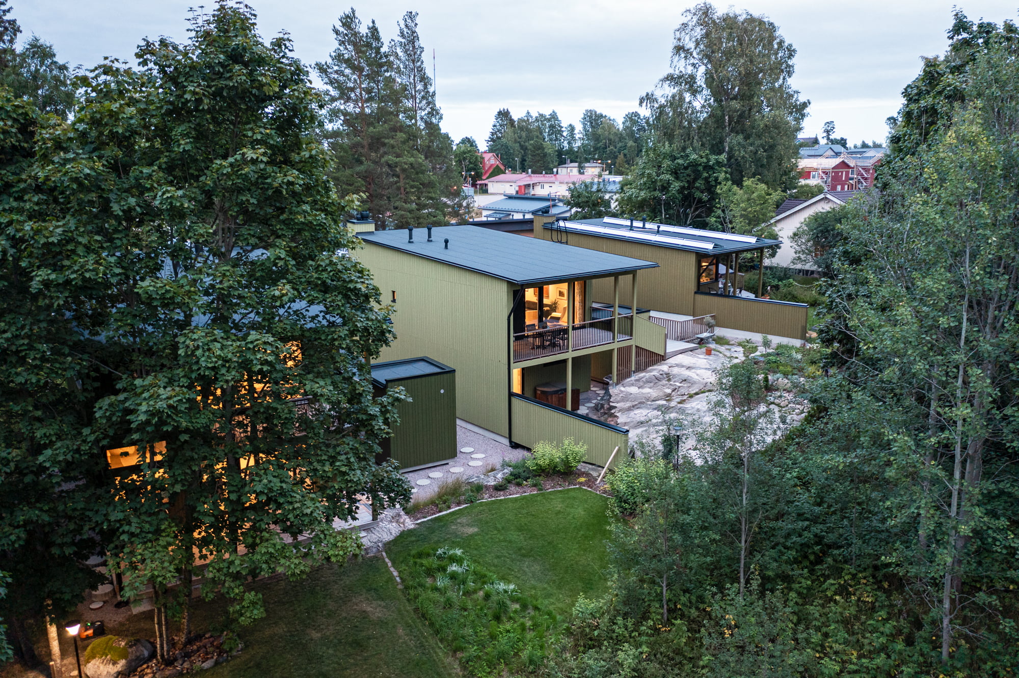 Ilman asiakasta arkkitehti voi toteuttaa oman käsityksensä mukaisia ajattomia ja ekologisia materiaalivalintoja eikä suunnittelussa tarvitse toteuttaa kunkin hetken muotivillityksiä. Valittu hankemalli mahdollisti hitaan aikataulun, joka puolestaan antoi aikaa asioille, joita ei voisi toteuttaa tiiviimmässä aikataulussa. Tässä hankkeessa se tarkoitti mm. alakertojen hiottuja betonilattioita, näkyvää puun käyttöä sisustuksessa, paikan päällä rakennettuja mäntypaneeli- ja koivuvanerisisäverhouksia, kokopuisia pesutilojen kalusteita ja sisäportaita. Hidas rakentaminen tarkoitti myös rakenteiden riittävää kuivumista, uusien materiaalien tuulettumista ja sitä kautta terveellisempiä asumisolosuhteita. Ulkovärivalinta (kolme erilaista vihreän sävyä) oli yhtäältä keino maastouttaa rakentaminen tiivistyvässä kaupunkirakenteessa entisen puiston paikalle ja toisaalta edullinen keino erottautua uudistalojen musta-valko-harmaasta tarjonnasta.