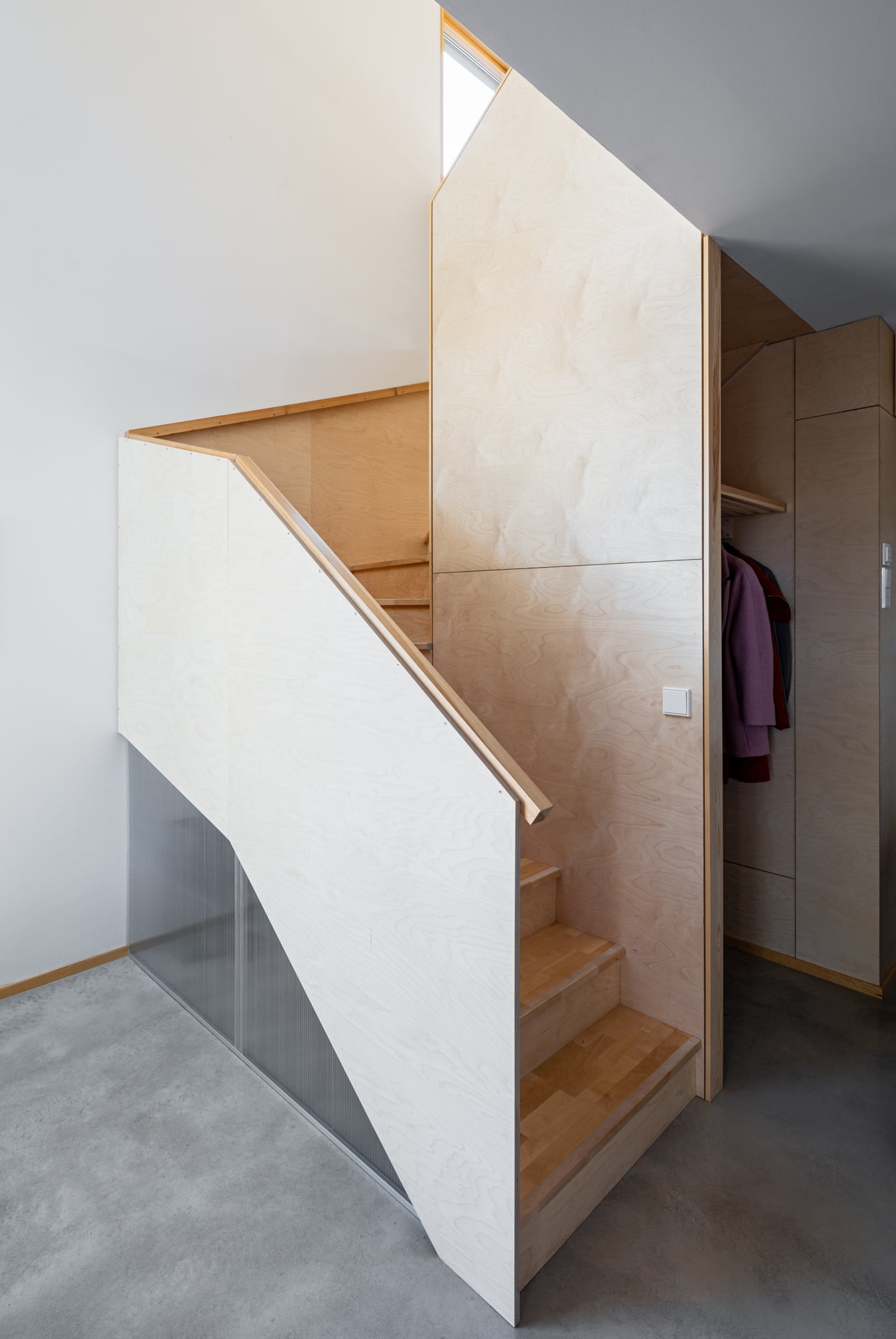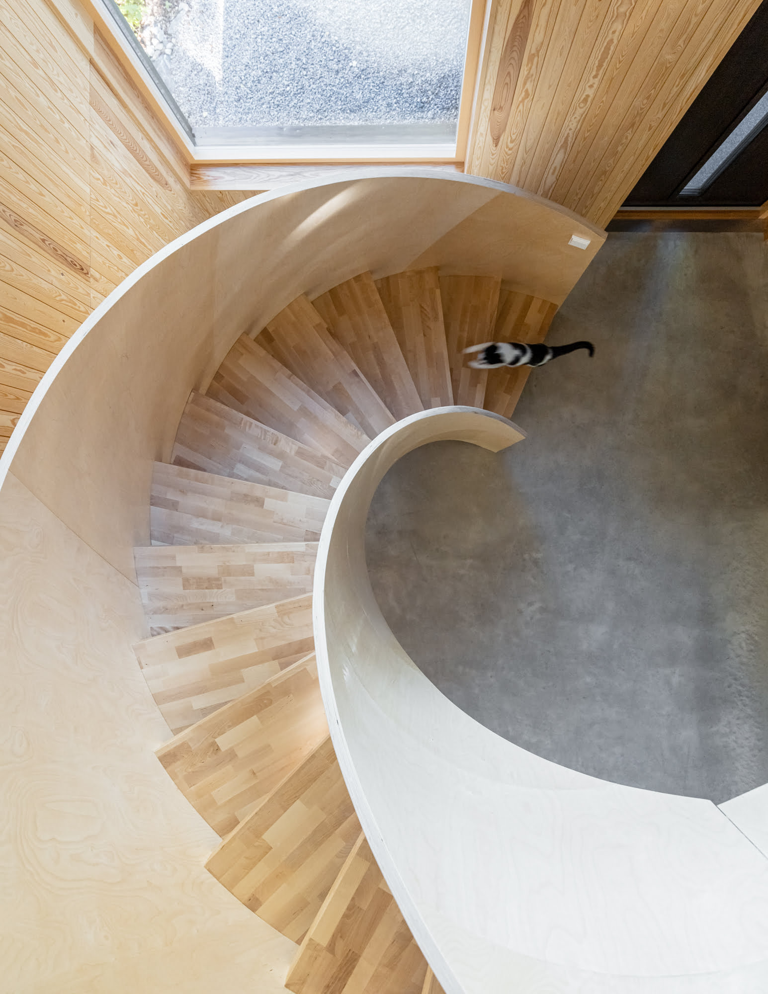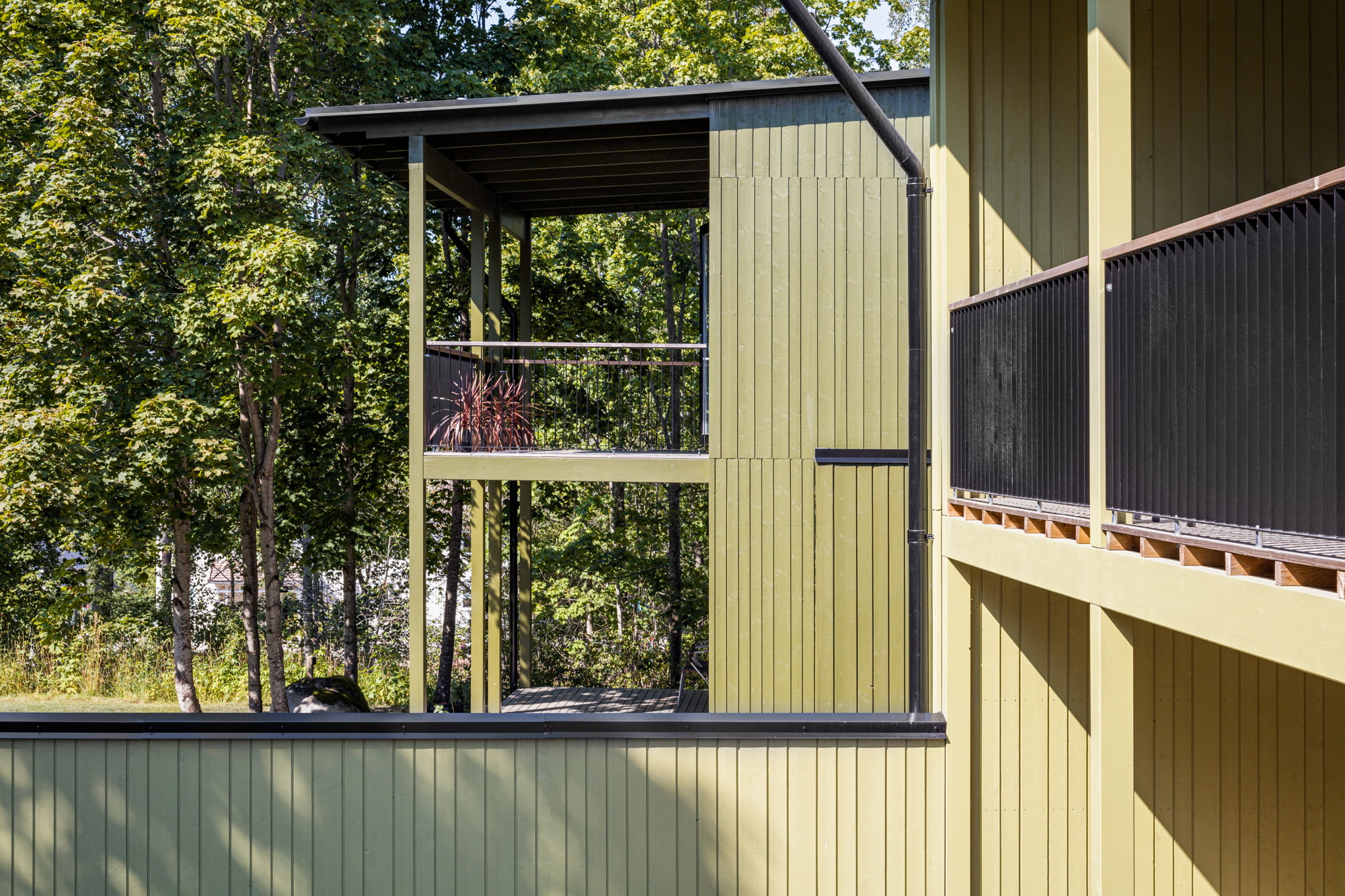 Ilman asiakasta arkkitehti voi toteuttaa oman käsityksensä mukaisia ajattomia ja ekologisia materiaalivalintoja eikä suunnittelussa tarvitse toteuttaa kunkin hetken muotivillityksiä. Valittu hankemalli mahdollisti hitaan aikataulun, joka puolestaan antoi aikaa asioille, joita ei voisi toteuttaa tiiviimmässä aikataulussa. Tässä hankkeessa se tarkoitti mm. alakertojen hiottuja betonilattioita, näkyvää puun käyttöä sisustuksessa, paikan päällä rakennettuja mäntypaneeli- ja koivuvanerisisäverhouksia, kokopuisia pesutilojen kalusteita ja sisäportaita. Hidas rakentaminen tarkoitti myös rakenteiden riittävää kuivumista, uusien materiaalien tuulettumista ja sitä kautta terveellisempiä asumisolosuhteita. Ulkovärivalinta (kolme erilaista vihreän sävyä) oli yhtäältä keino maastouttaa rakentaminen tiivistyvässä kaupunkirakenteessa entisen puiston paikalle ja toisaalta edullinen keino erottautua uudistalojen musta-valko-harmaasta tarjonnasta.