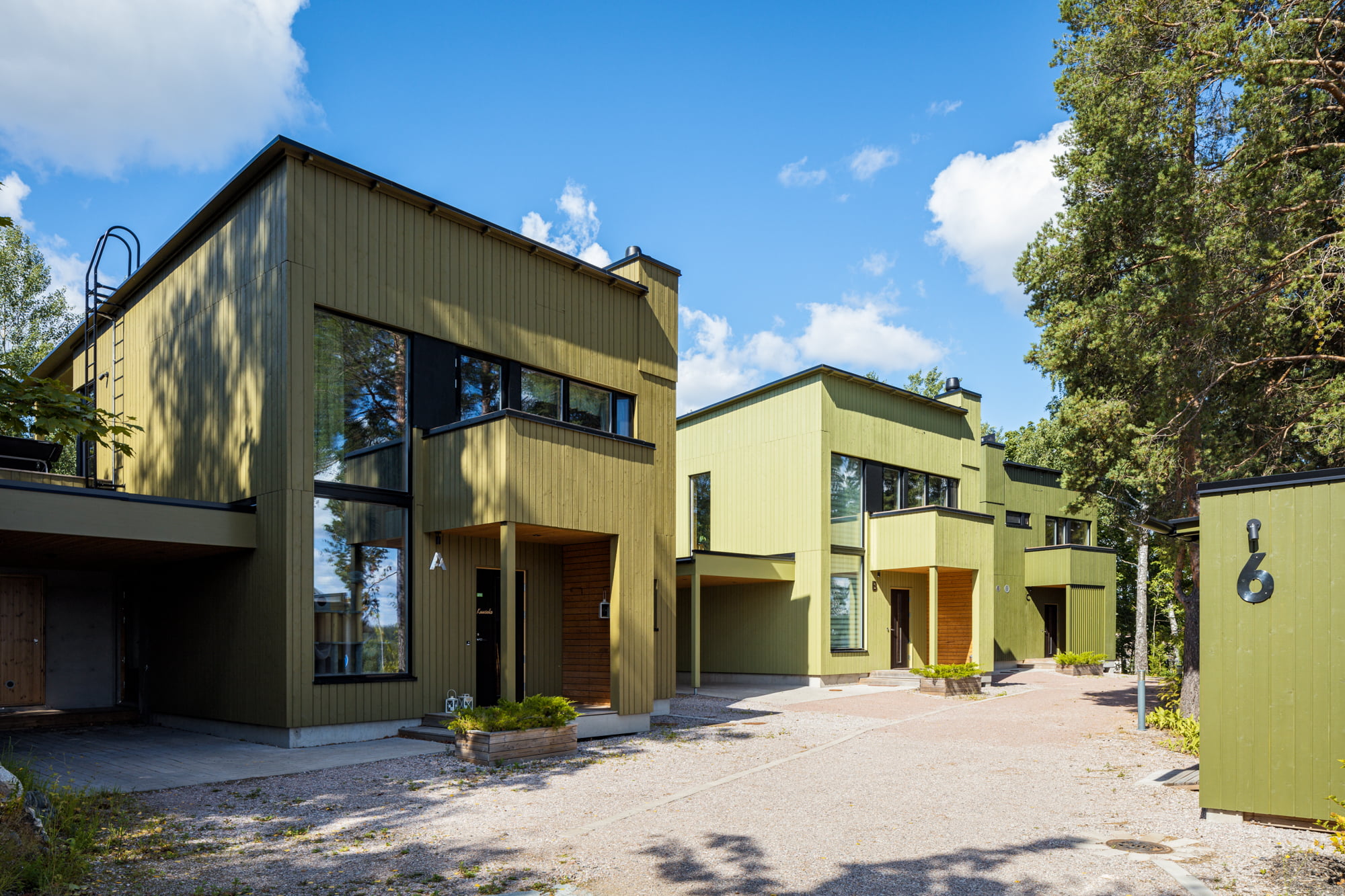Tontille soveltuvat rakennustyypit, rakennusten määrä ja koko, kerrosluku sekä huonetilaohjelma suunniteltiin paikan lähtökohtien mukaan. Päätimme ehkä hieman työläästi toteuttaa kolme erilaista ja myös hieman erikokoista taloa ja pihapiiriä, joissa kussakin pyrittiin optimoimaan rakennuspaikan ominaisuudet kuten kallioisen maaston muodot, kasvillisuus ja pitkät vapaat näkymät. Mäntyryhmä on suojeltu asemakaavassa.