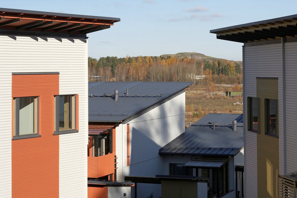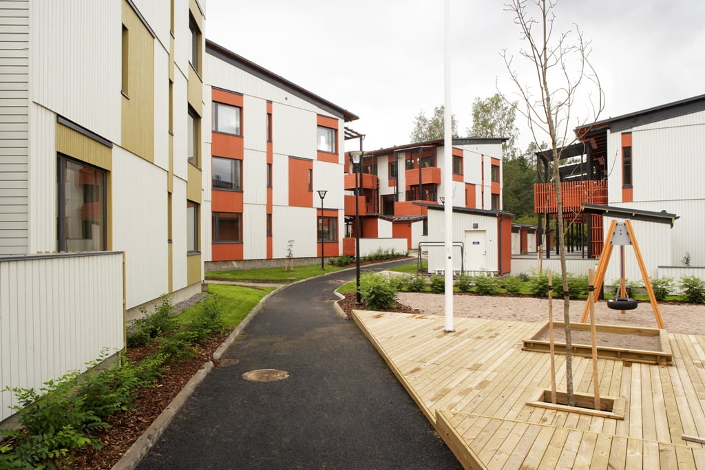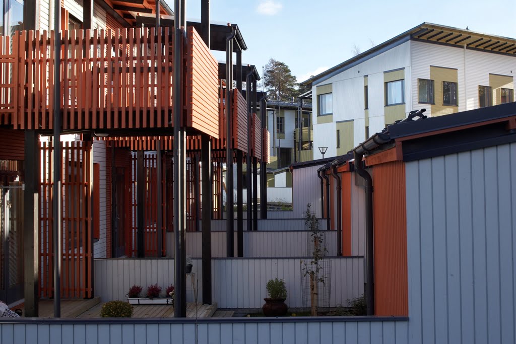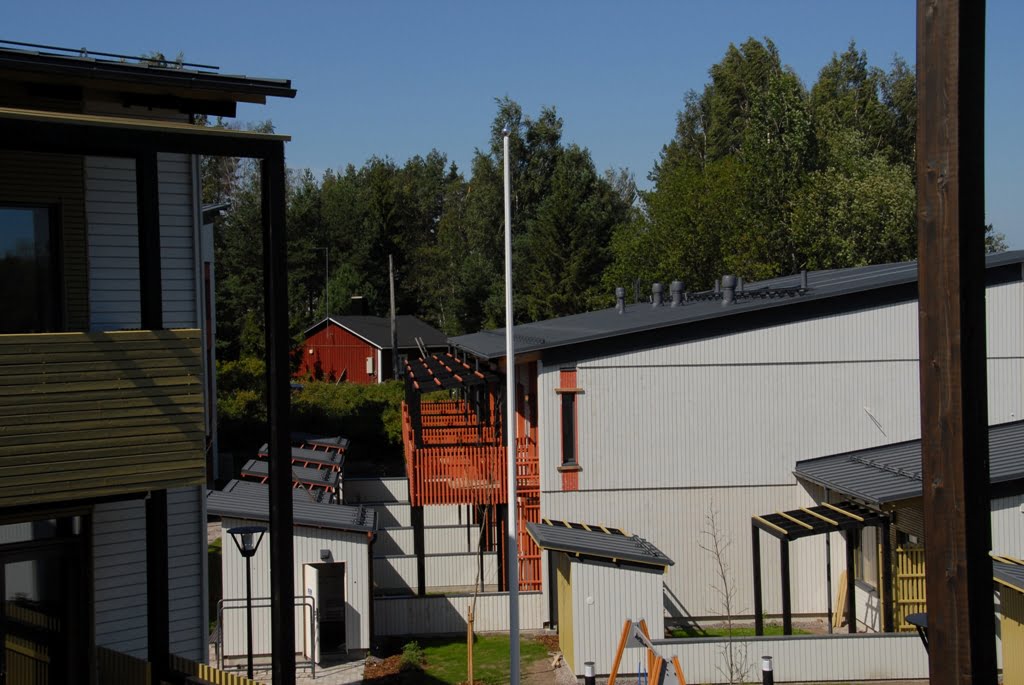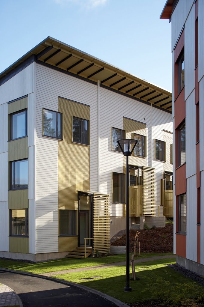 Vastakkaisten rinnetalojen välistä laskeudutaan pihalle raittimaista portaikkoa pitkin. Rivitalon kaksikerroksiset osat päättävät sisääntuloraitin. Poikittain pohjoisrinteeseen asetettujen rinnetalojen väleistä saadaan valoa rivitalojen pihoille.