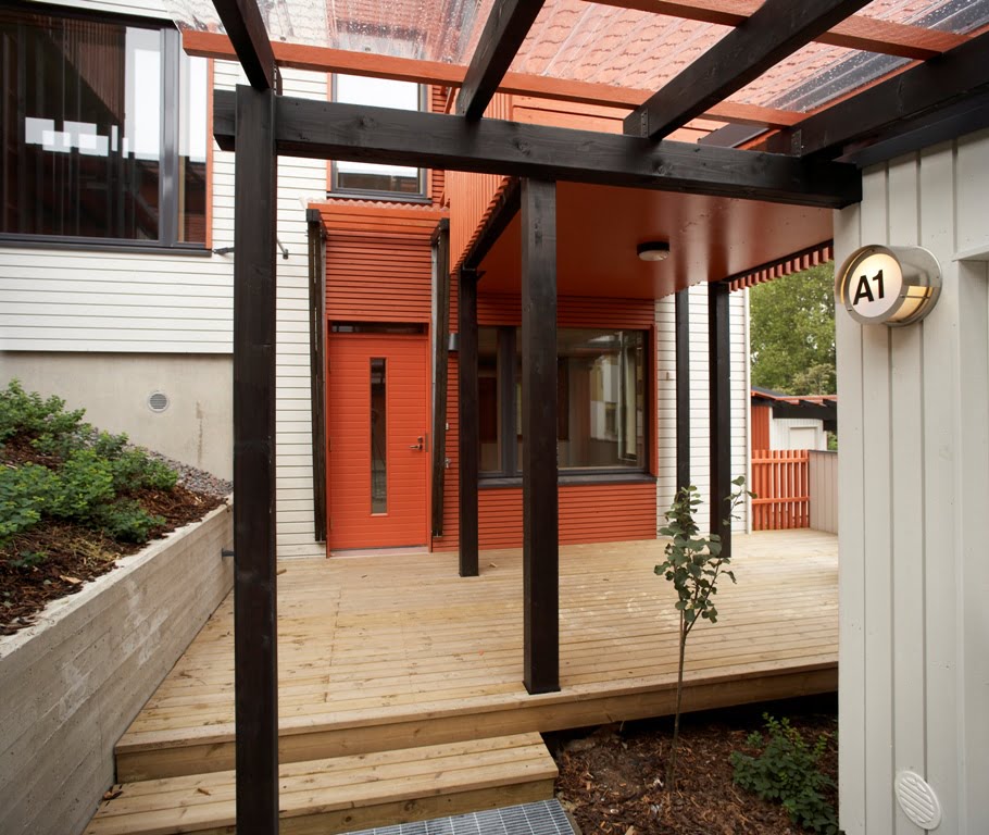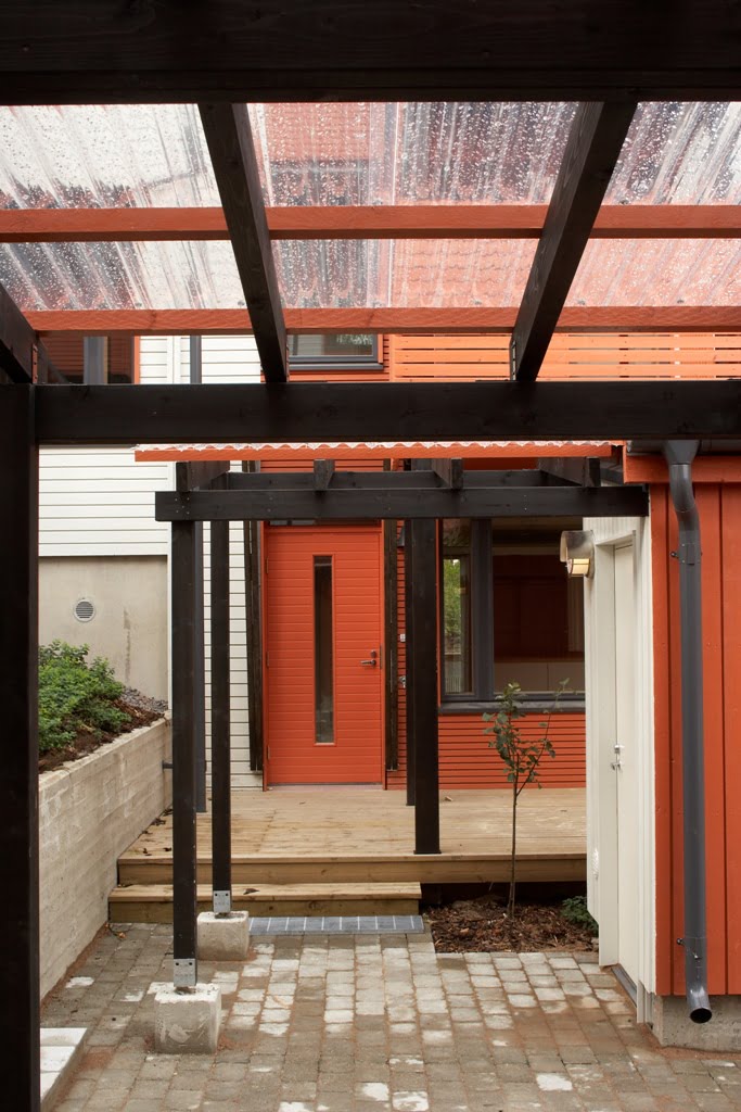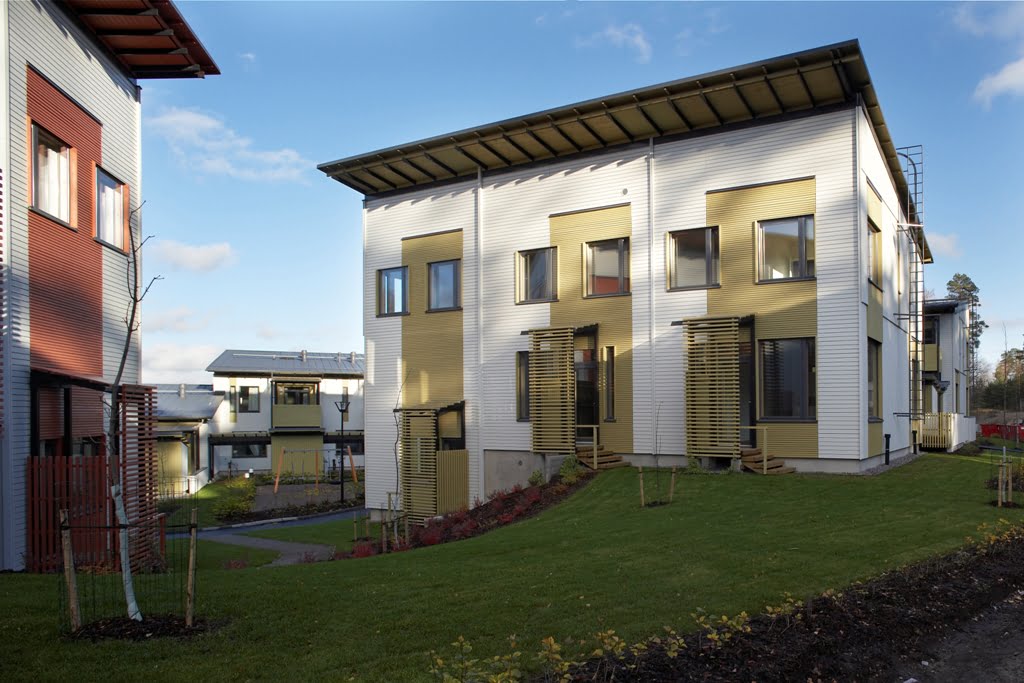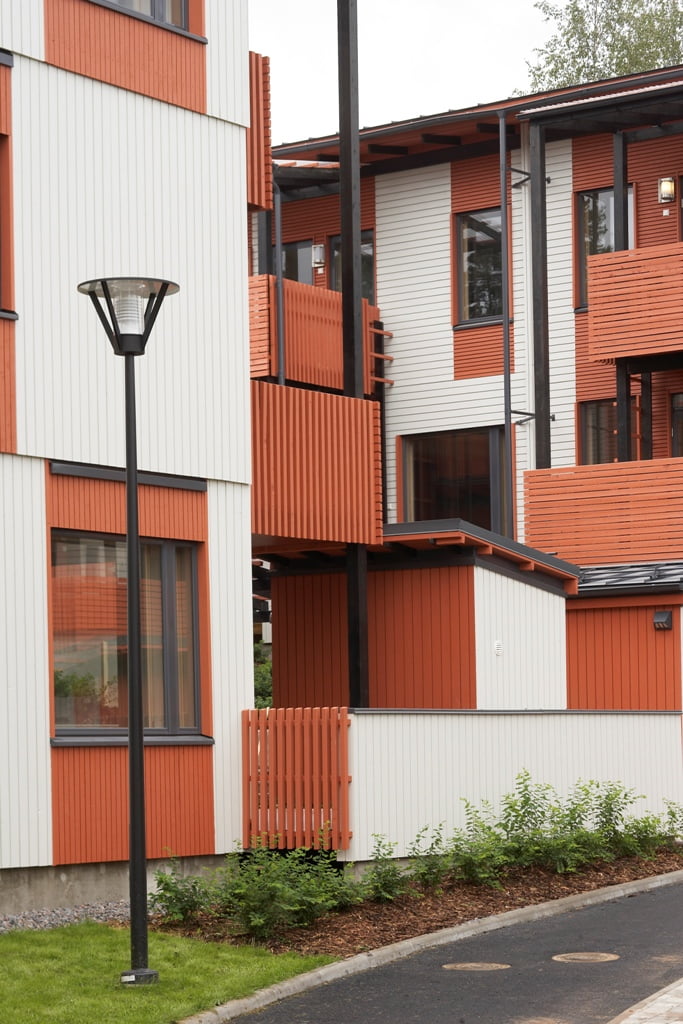 Jokaisella asunnolla on selvästi rajattu ulko-oleskelutilansa, ja lisäksi tontin keskellä on pieni yhteispiha. Tontille ajetaan Omenamäenkadun päästä ja pysäköintipaikat on hajautettu tontin kulmiin Talot on toteutettu puuelementteinä. Alapohjat sekä kolmiokerroksiset asunnot ovat betonirakenteisia. Välipohjat ovat kertopuulaattoja ja yläpohjat ristikkorakenteisia. Ulkoseinäverhous on hienosahattua A4-B-luokan kuusilautaa öljymaalilla käsiteltynä. Liimapuurunkoiset parvekkeet koottiin esivalmistetuista komponenteista. Räystään pituus vaihtelee 30 sentistä kahteen metriin.