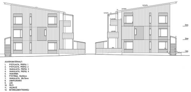 Kaksikerroksisten osien paloluokka on P3 ja kolmikerroksisten P1. Osien välissä on 120 minuutin palomuuri. Palomääräyksistä poikkeava, kolmikerroksisen puuverhous on kuristettu kerroksittain savukaasujen leviämisen estämiseksi. Räystäs on osastoitu palo-osastojen välillä.
