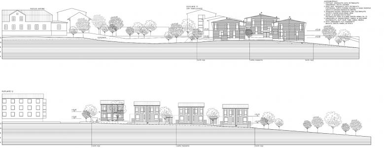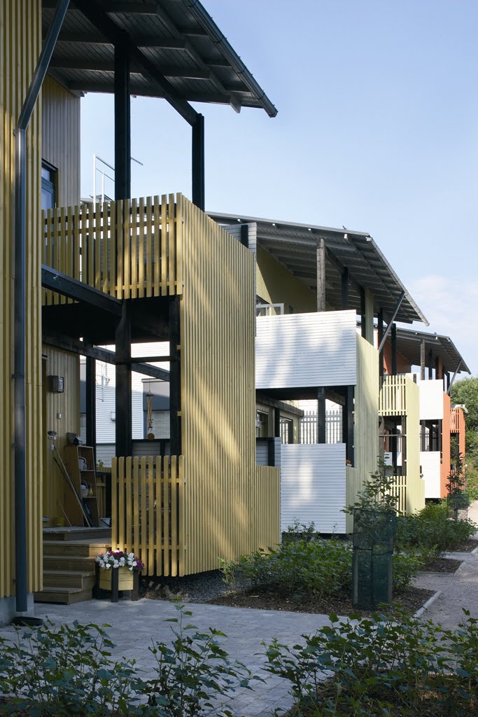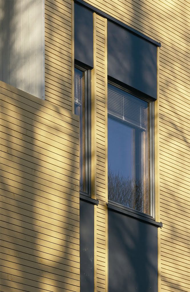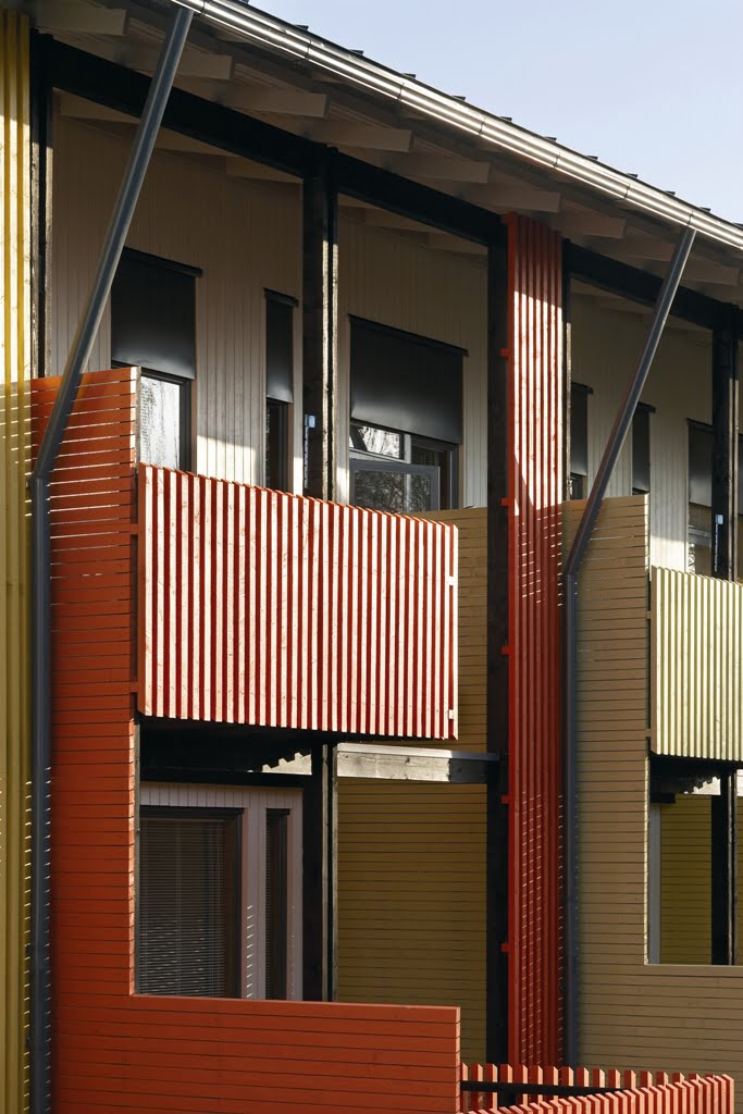 Talojen verhous on petrooliöljymaalilla käsiteltyä hienosahattu lautaa. 23 x 95…70 mm puoliponttipaneelit ovat A4-laatuluokan kuusta. Verhous suojaa jatkoskohdassaan suomumaisesti alempaa lautaa. Julkisivuja on täydennetty ikkunoiden peltikaseteilla ja parvekkeiden pystyrimoilla