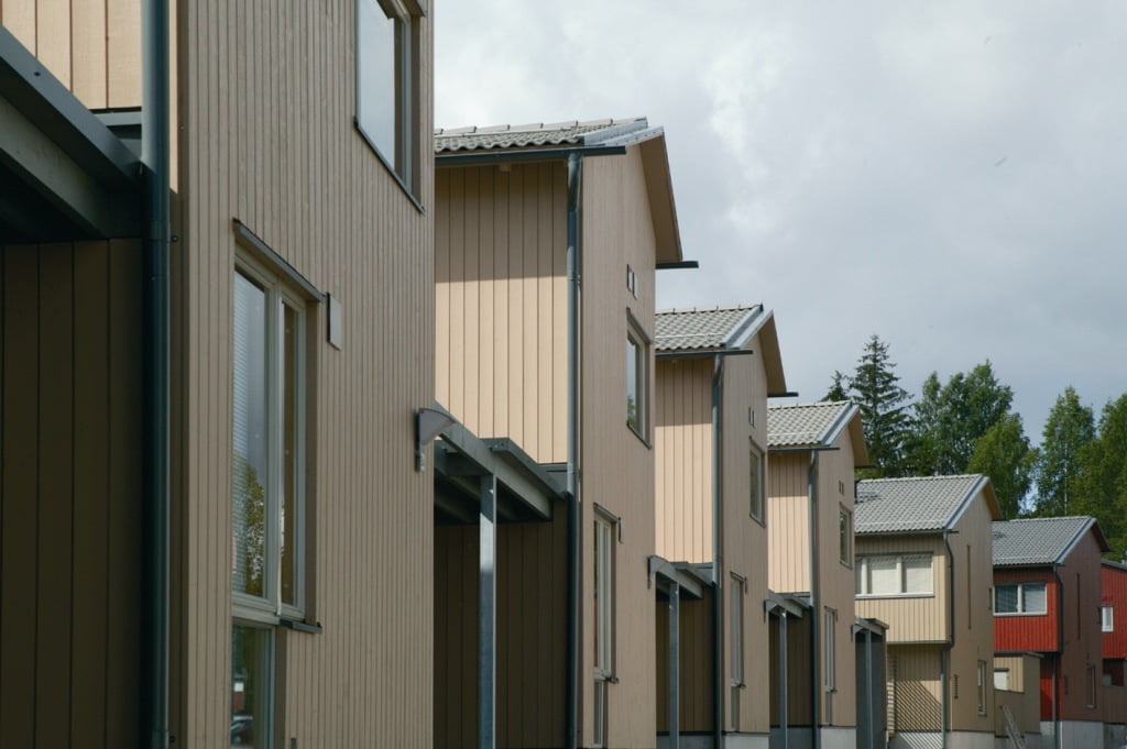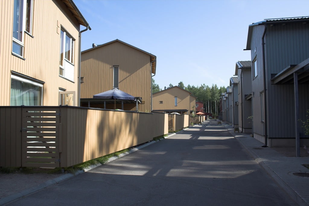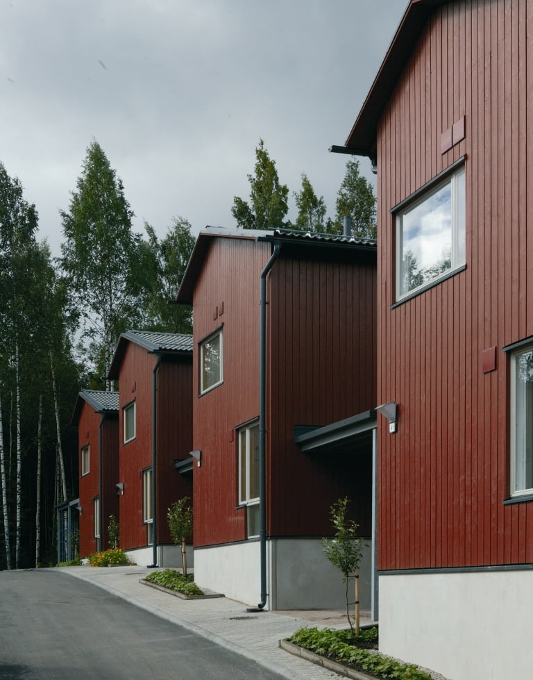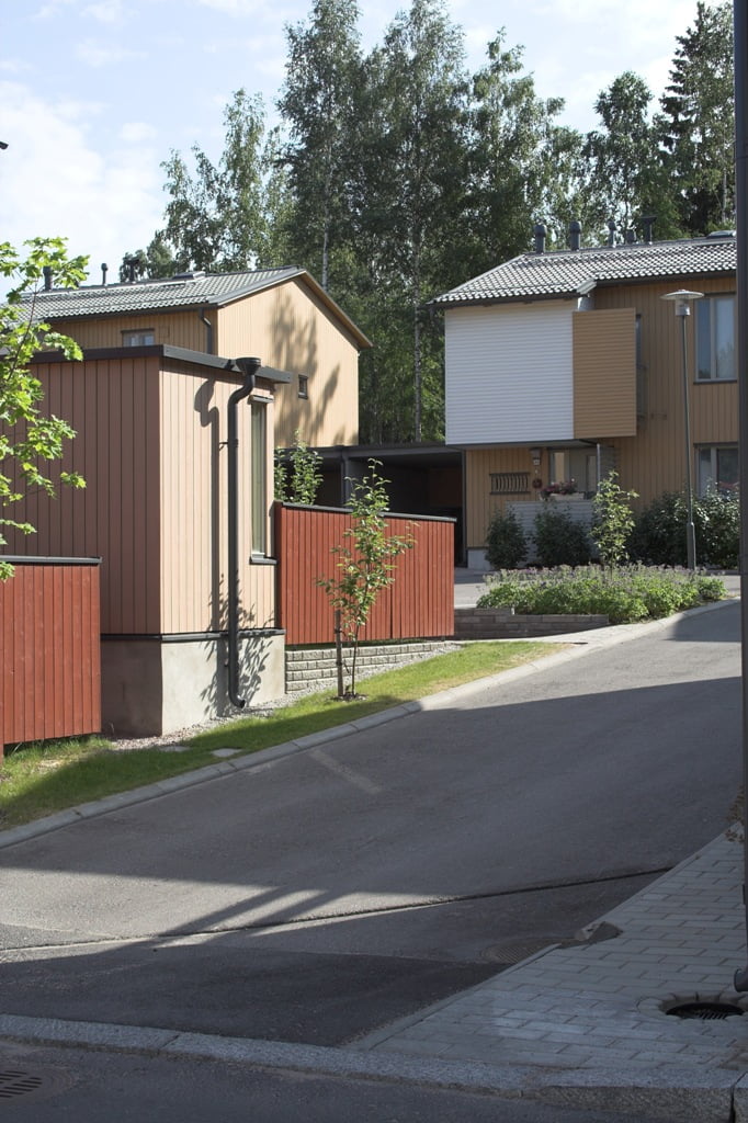 Julkisivujen ilme on kevyt. Ulkoverhouksena on hienosahattu 25 mm pystypaneeli. Tehosteena on höylättyjä vaakaponttipaneelikenttiä. Rakennuksissa on reilut avoräystäät ja katteena on harmaa betonikattotiili. Värityksessä on pyritty vaihteluun, yksilöllisyyteen ja samalla alueen tilarakenteen korostamiseen