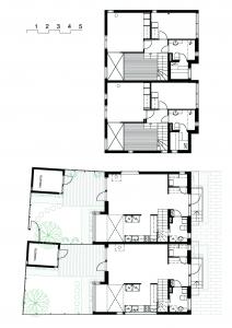Rakennuttajan ja pääurakoitsijan esityksestä alakerran poikittaiset, kantavat seinät ovat teräsbetonielementtejä ja välipohjat ontelolaattoja. Muut seinät ja yläpohja ovat puurakenteisia. Märkätilojen seinät ovat kivirakenteisia. Korttelit on jaettu pienemmiksi paloalueiksi rakentamalla muutamissa kohdissa naapurien välinen seinä palomuuriksi. Palotekniset vaatimukset näkyvät tiiviyden vuoksi myös räystäsrakenteissa ja EI30 seinissä käytetyissä E15 ikkunoissa.