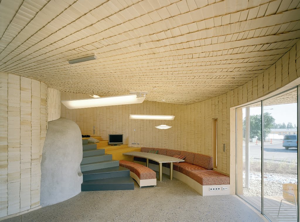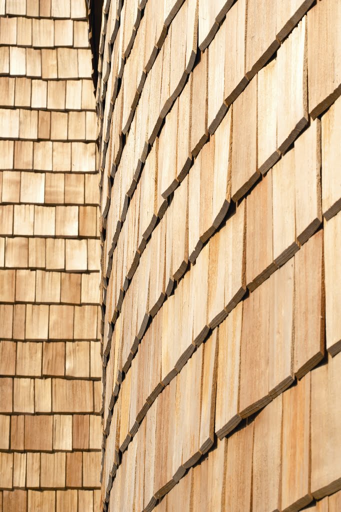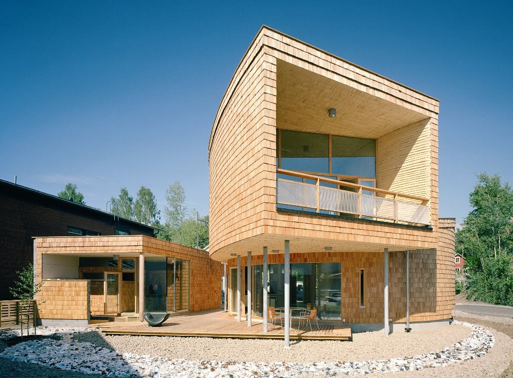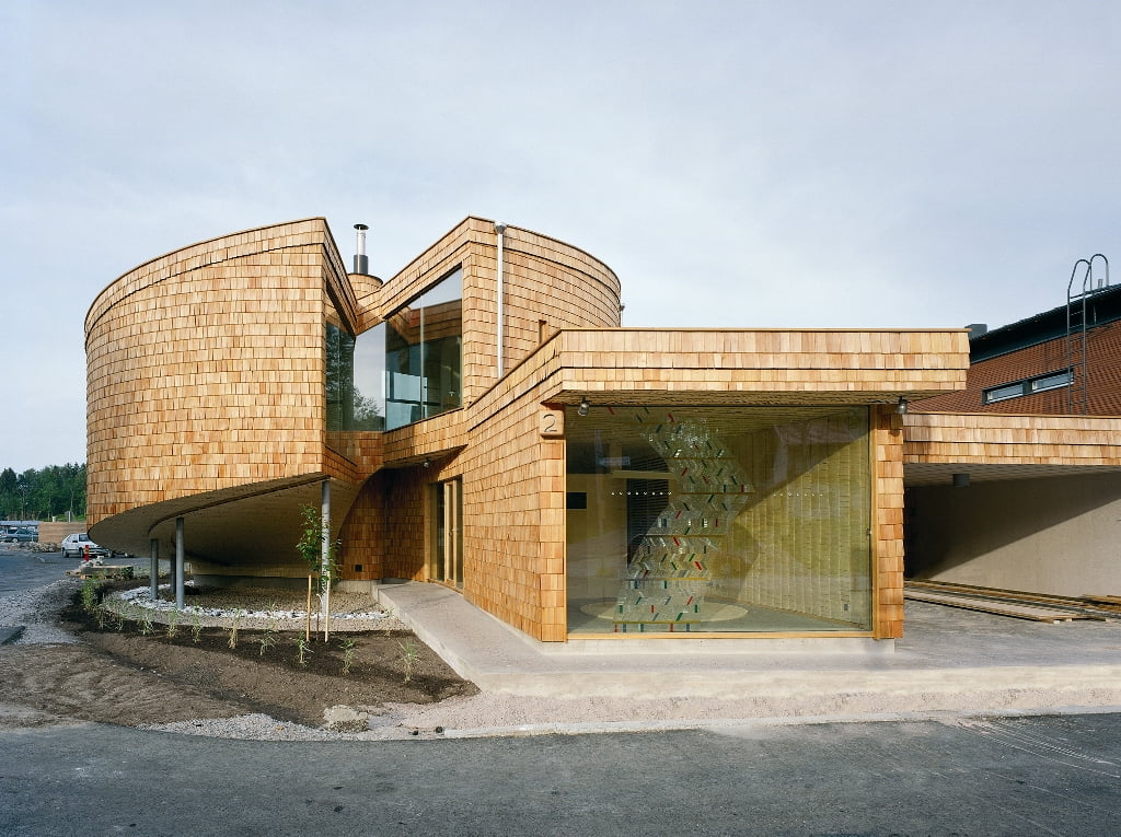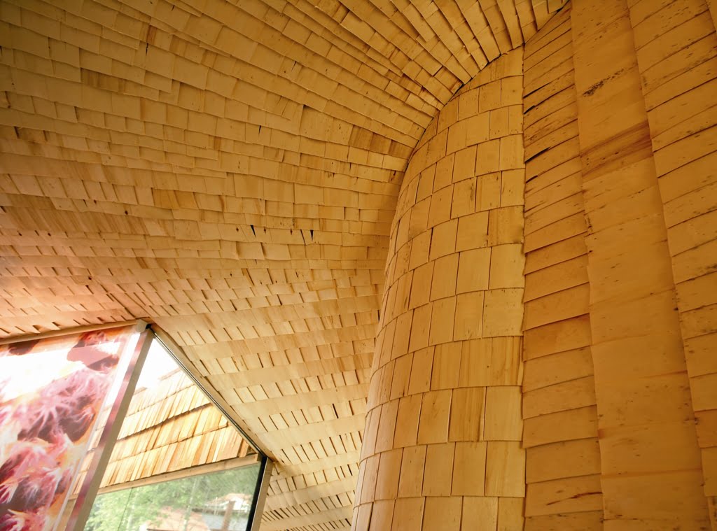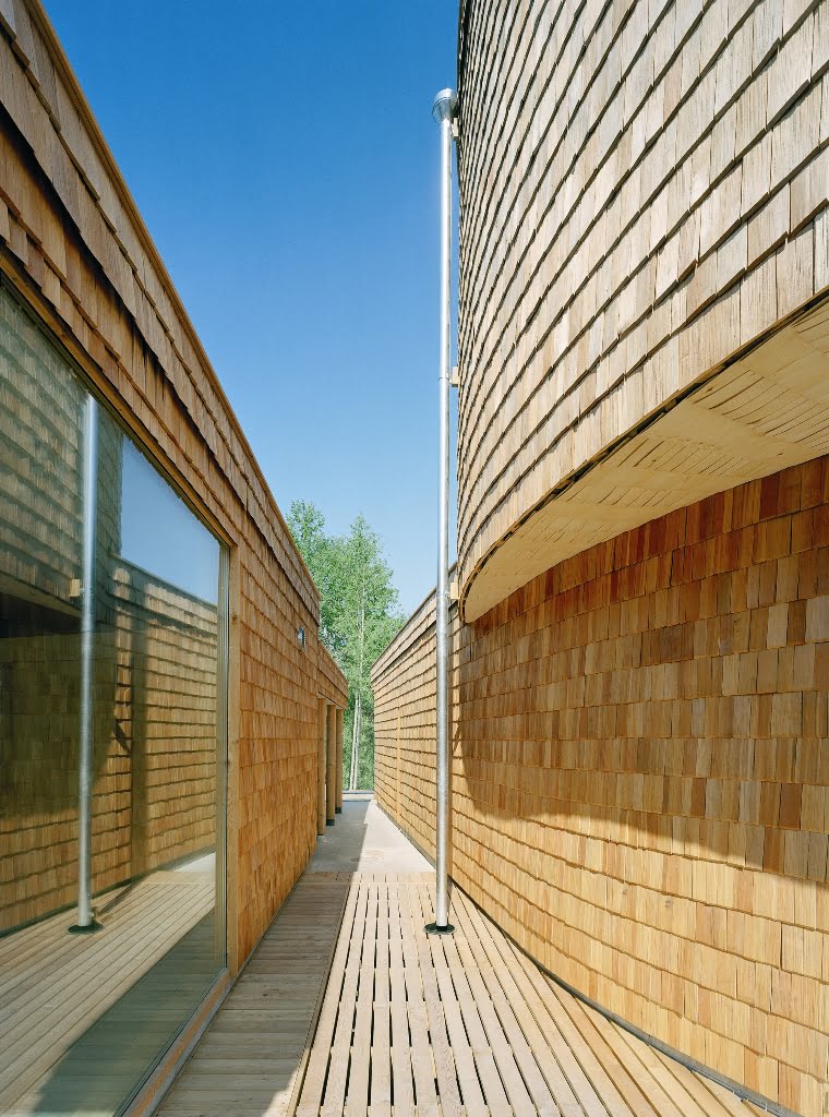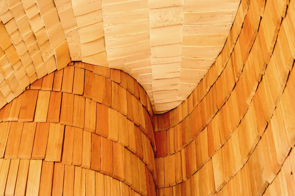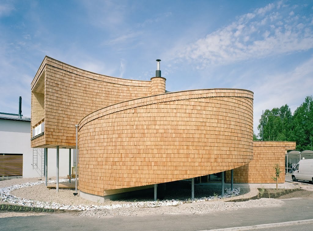 Osittain kahteen suuntaan kaarevat pinnat määräsivät verhouksen. Ulkopinnan paanut ovat Siperian lehtikuusta ja sisäpinnat iisalmelaista haapapärettä. Ensimmäisen kerroksen lattia on hiottua betonia, johon on upotettu lasimurskaa.