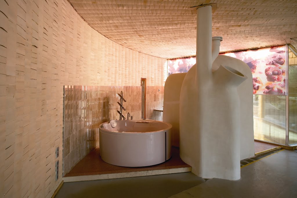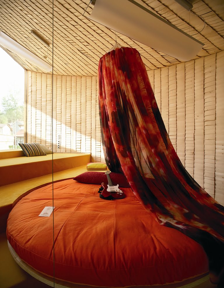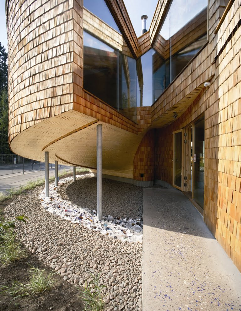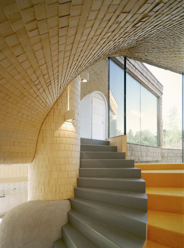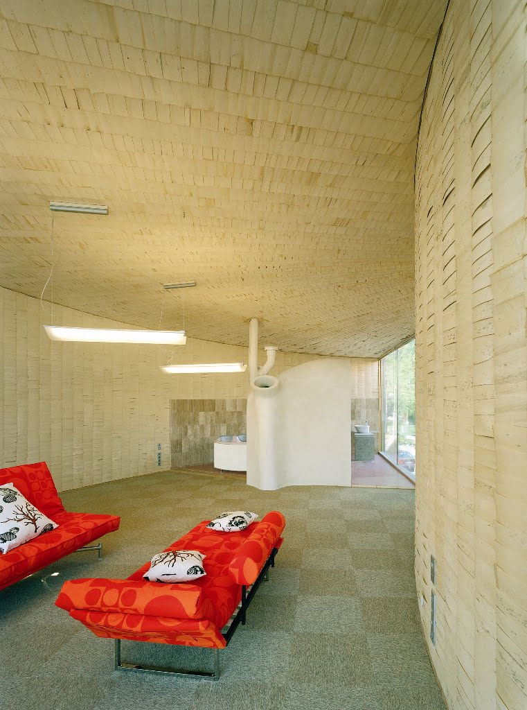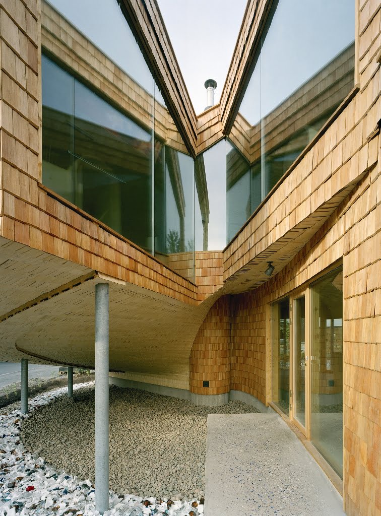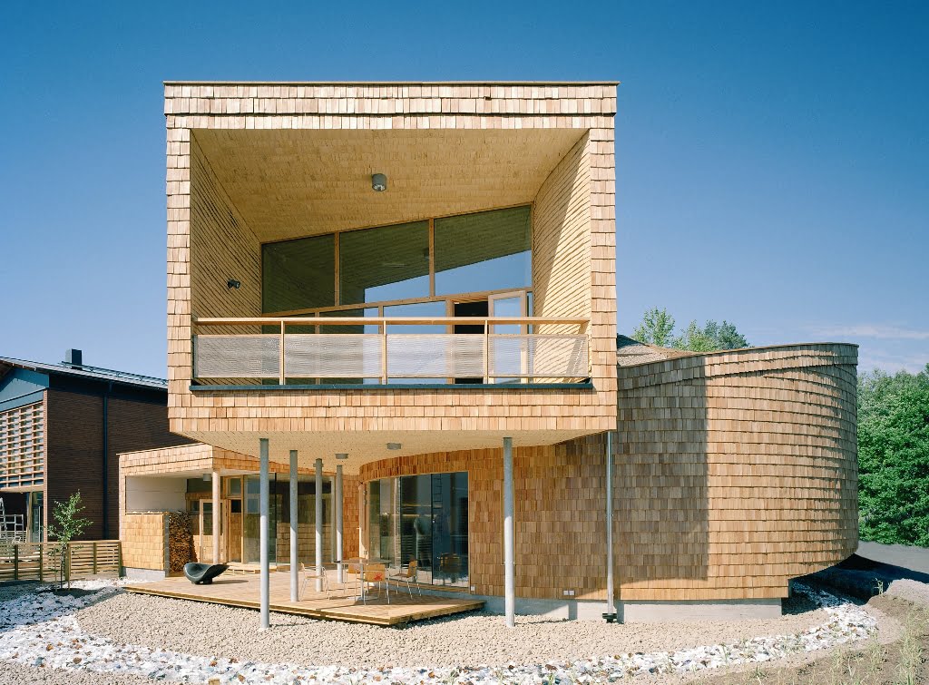 Osittain kahteen suuntaan kaarevat pinnat määräsivät verhouksen. Ulkopinnan paanut ovat Siperian lehtikuusta ja sisäpinnat iisalmelaista haapapärettä. Ensimmäisen kerroksen lattia on hiottua betonia, johon on upotettu lasimurskaa.