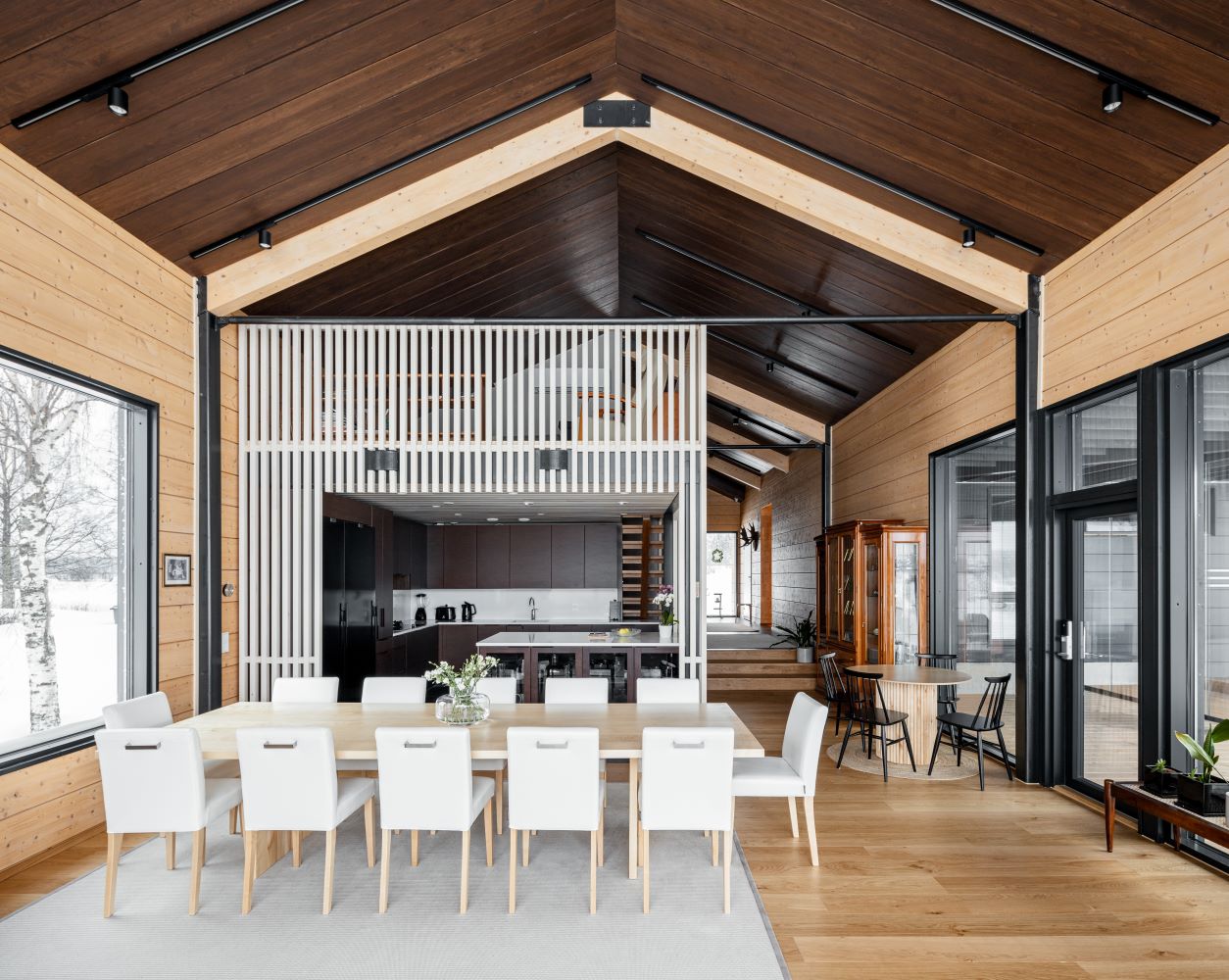 Detaljeihin kiinnitettiin paljon huomiota niin suunnittelussa kuin toteutuksessakin, ja näin hyödynnettiin painumattoman hirren tarjoama mahdollisuus täysin listattomaan ratkaisuun.
