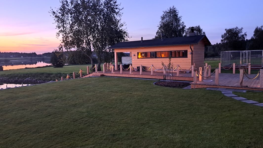 Päärakennusta ja pihasaunaa yhdistää puurakenteinen terassi ja rantaan johtavat portaat laitureineen. Rakennuksissa on käytetty seinämateriaalina Vaaran Palkki Oy:n painumatonta hirttä (VAARA STABIL). Talon sisäpuolella on käytetty erilaisia Veljekset Vaara Oy:n puumateriaaleja seinissä ja sisäkatoissa. Rimaseinää on käytetty keittiön ja eteisaulan seinien tehosteena.